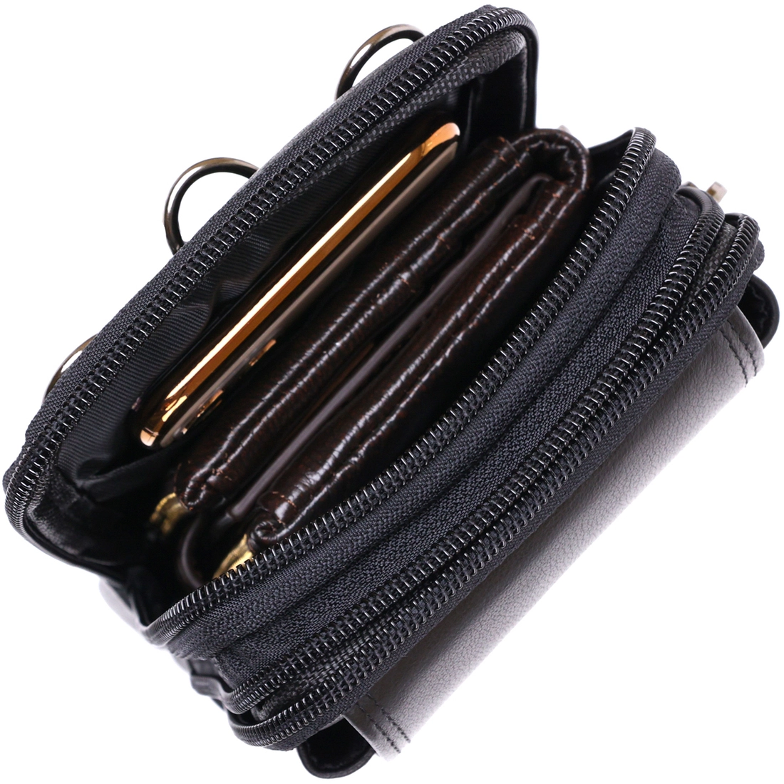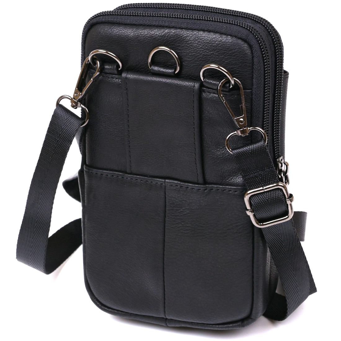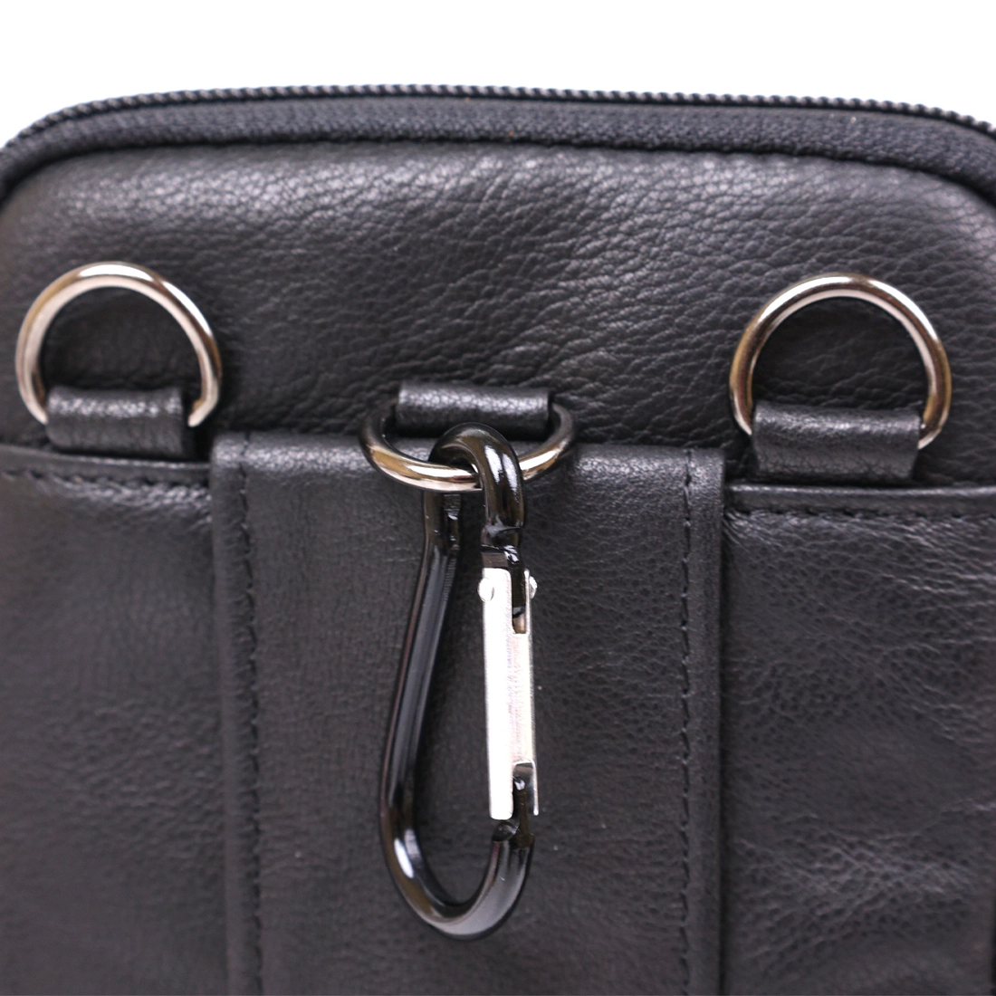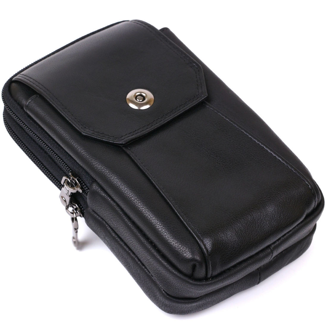 Отменная мужская сумка на пояс из гладкой высококачественной кожи высокого класса. Имеет удобные и практичные отделения и внешний накладной карман на магнитной кнопке для быстрого доступа. Данная модель легко крепится на ремень или может носиться на плече, что зависит от Ваших предпочтений. Цвет изделия – универсальный черный.