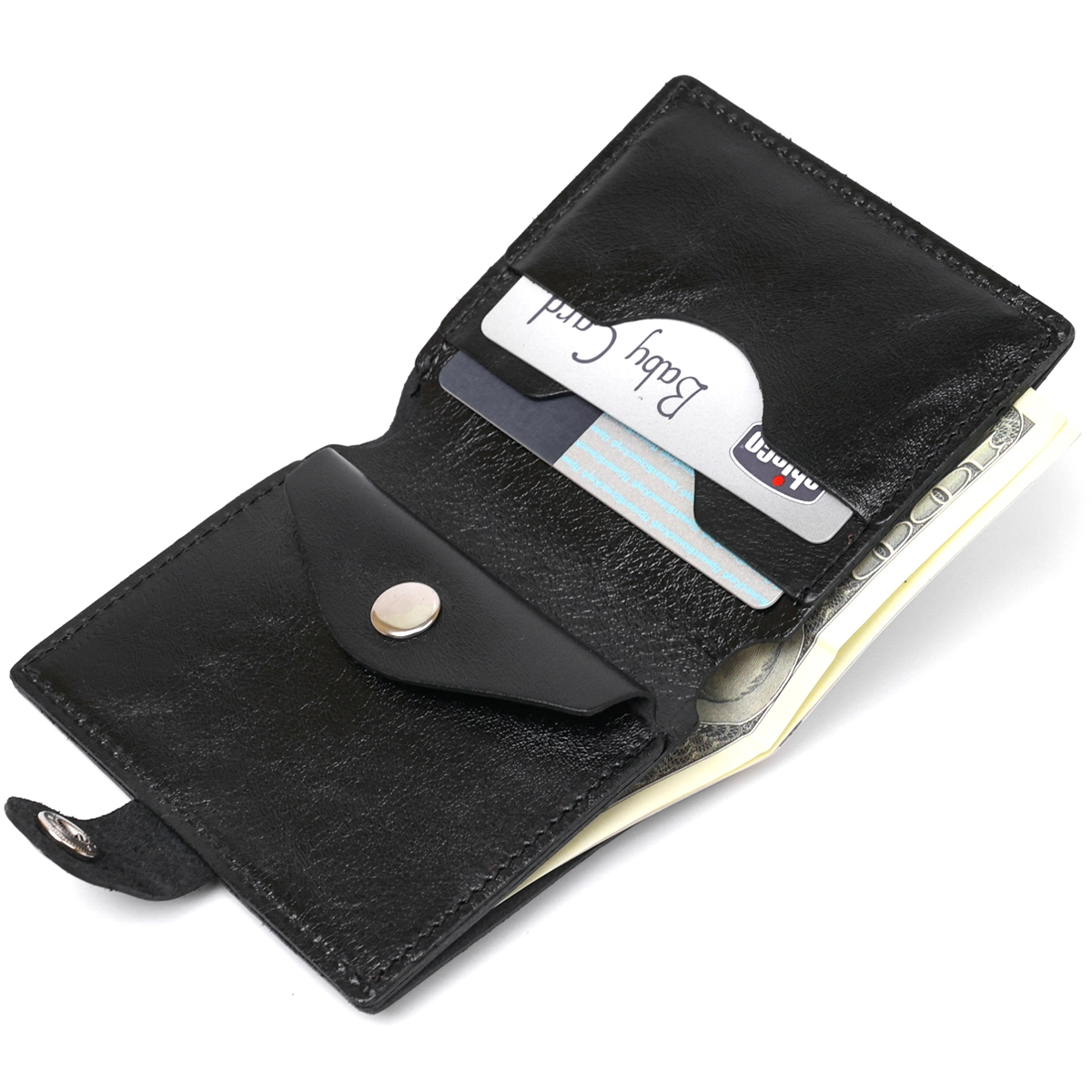 Классическое мужское портмоне в универсальном черном цвете, которое легко поместится в сумке любого размера или в кармане. Выполнено изделие из натуральной кожи высокого класса и улучшенной прочности. Внутри есть отделение для купюр, слоты для кредитных и визитных карточек и небольшая монетница на кнопке. Фактура – гладкая с легким отливом.