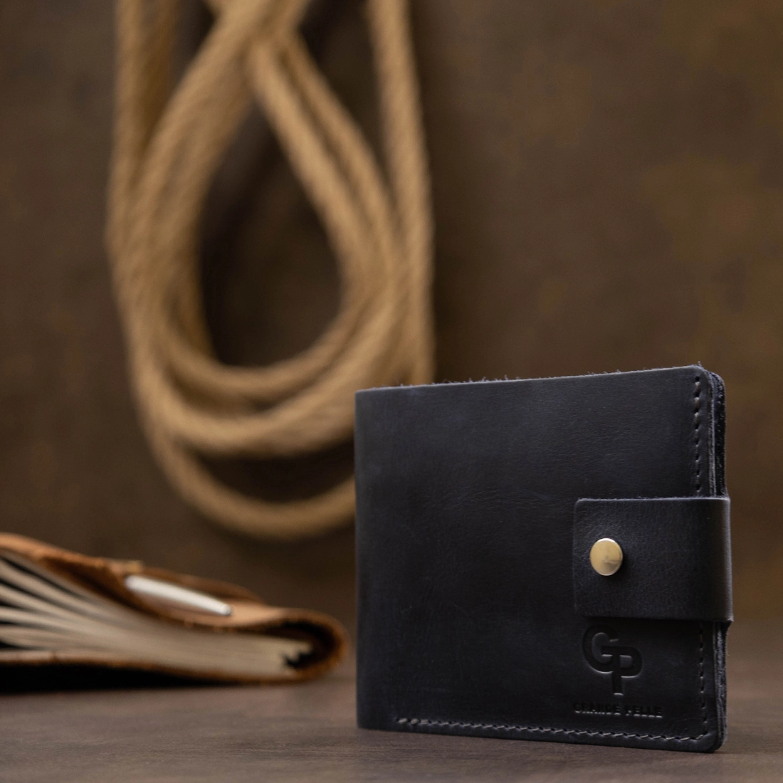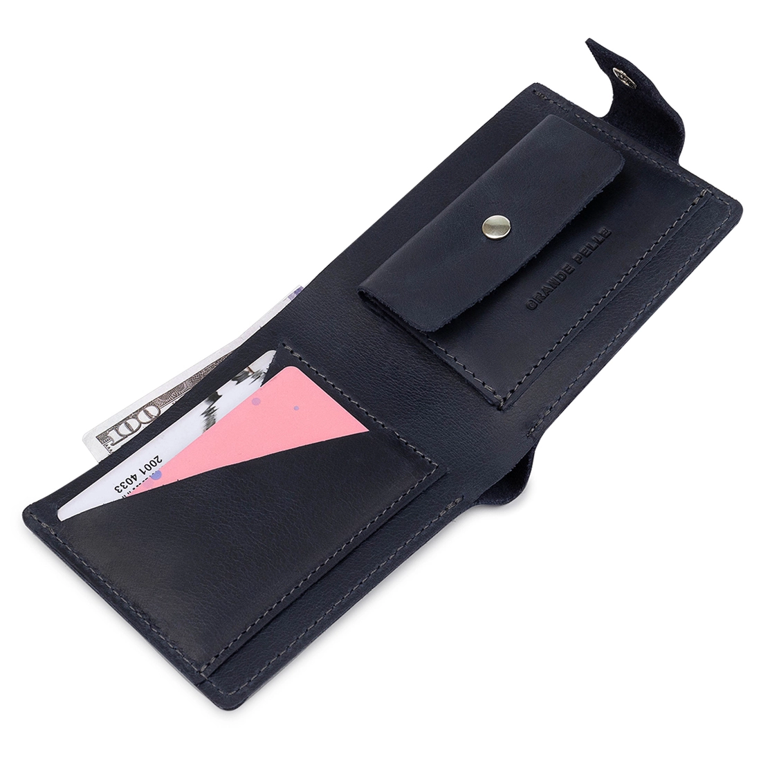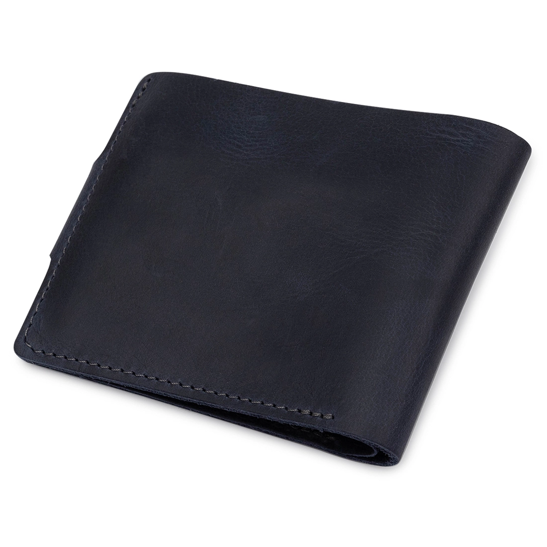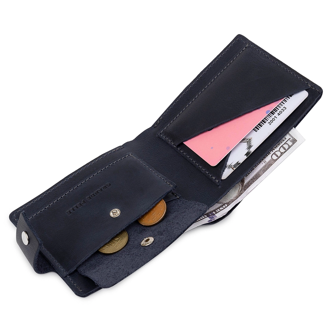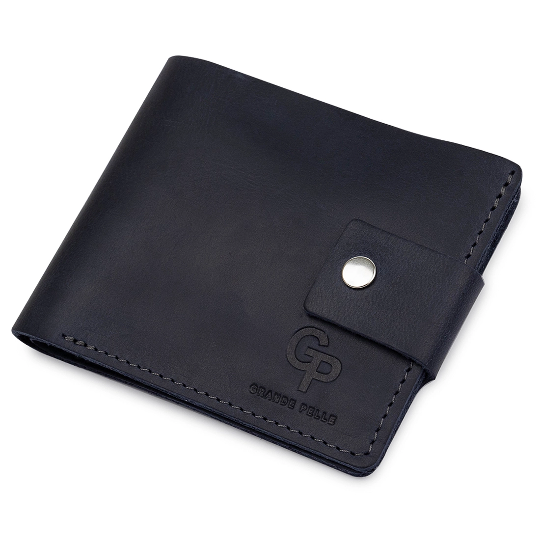 Небольшое мужское портмоне темно-синего цвета для ценителей компактных, но вместительных вещей. Выполнено изделие из натуральной высококлассной кожи. Внутри есть отделение для купюр, слоты для пластиковых карт и визиток, а также удобная монетница на кнопке. Закрывается само портмоне на хлястик с кнопкой. Упаковано изделие в фирменный чехол.