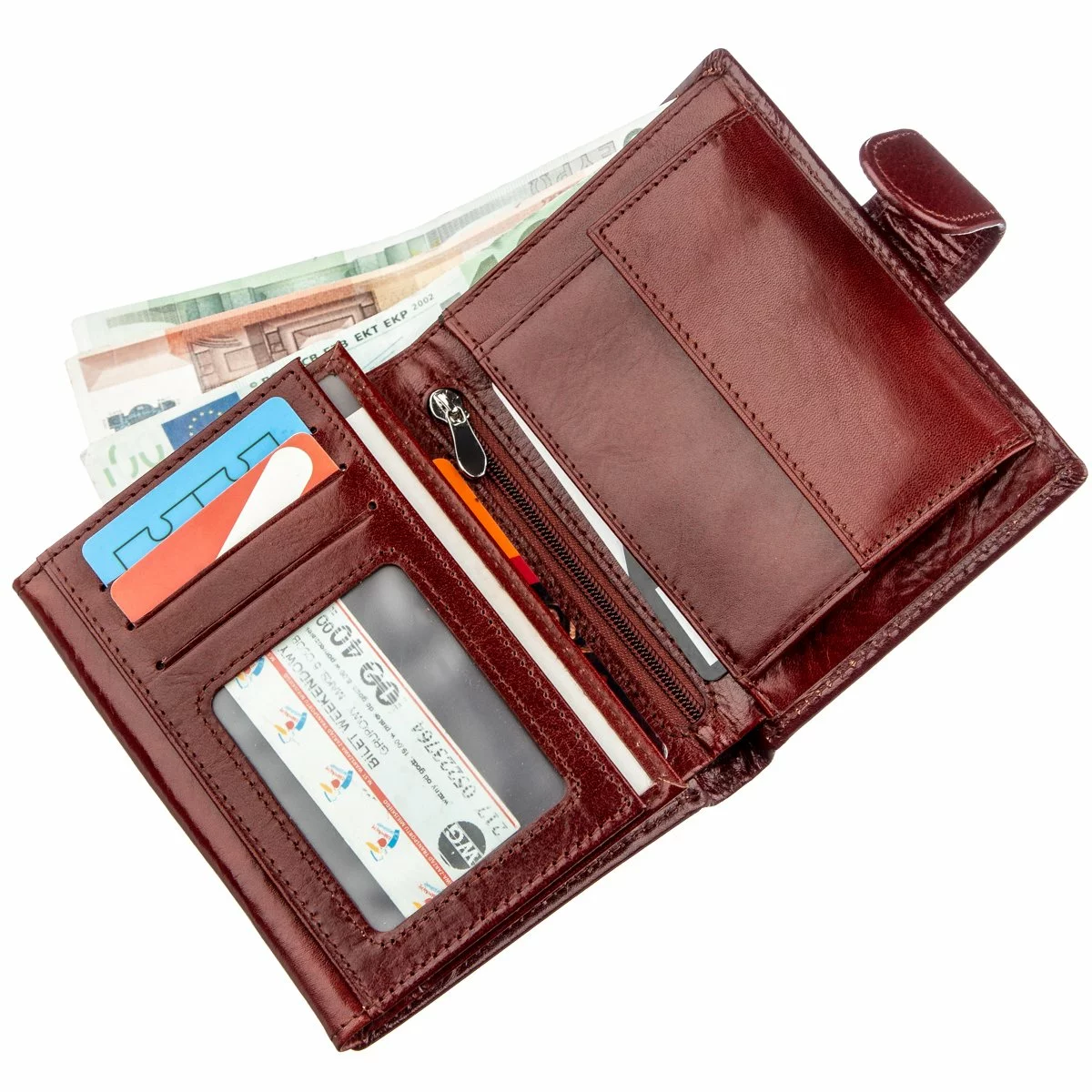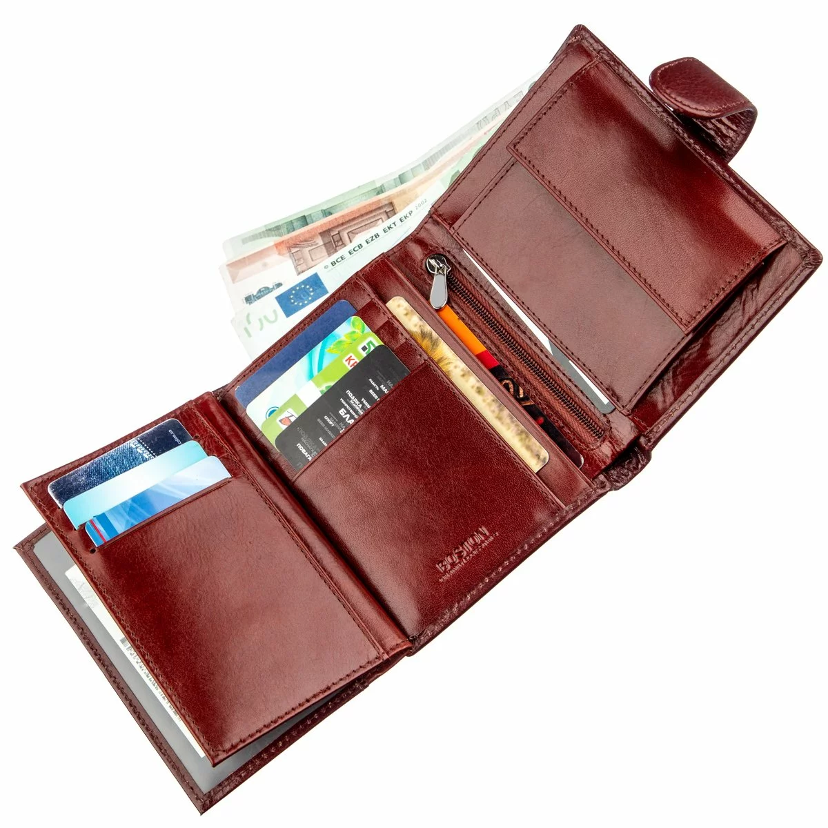 Стильный мужской бумажник из натуральной кожи красно-коричневого цвета. Отлично подойдет как для делового мужчины в возрасте, так и для молодого человека. Имеет достаточное количество отделений для всех необходимых вещей, в том числе и девять карманов для Ваших карточек. Такой кошелек выгодно подчеркнет Ваш незаурядный вкус и отличное чувство стиля. Кожа, из которой он выполнен, имеет прекрасную износостойкость и надежность, бумажник Вам верно прослужит не один год. Если же Вы сейчас подыскиваете подарок для любимого человека, то перед Вами отличный вариант. Упакован кошелек в плотную картонную коробку.