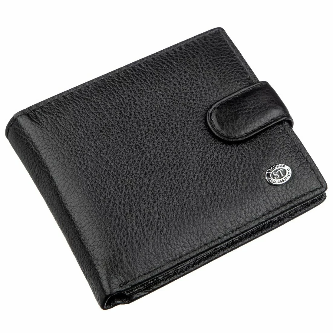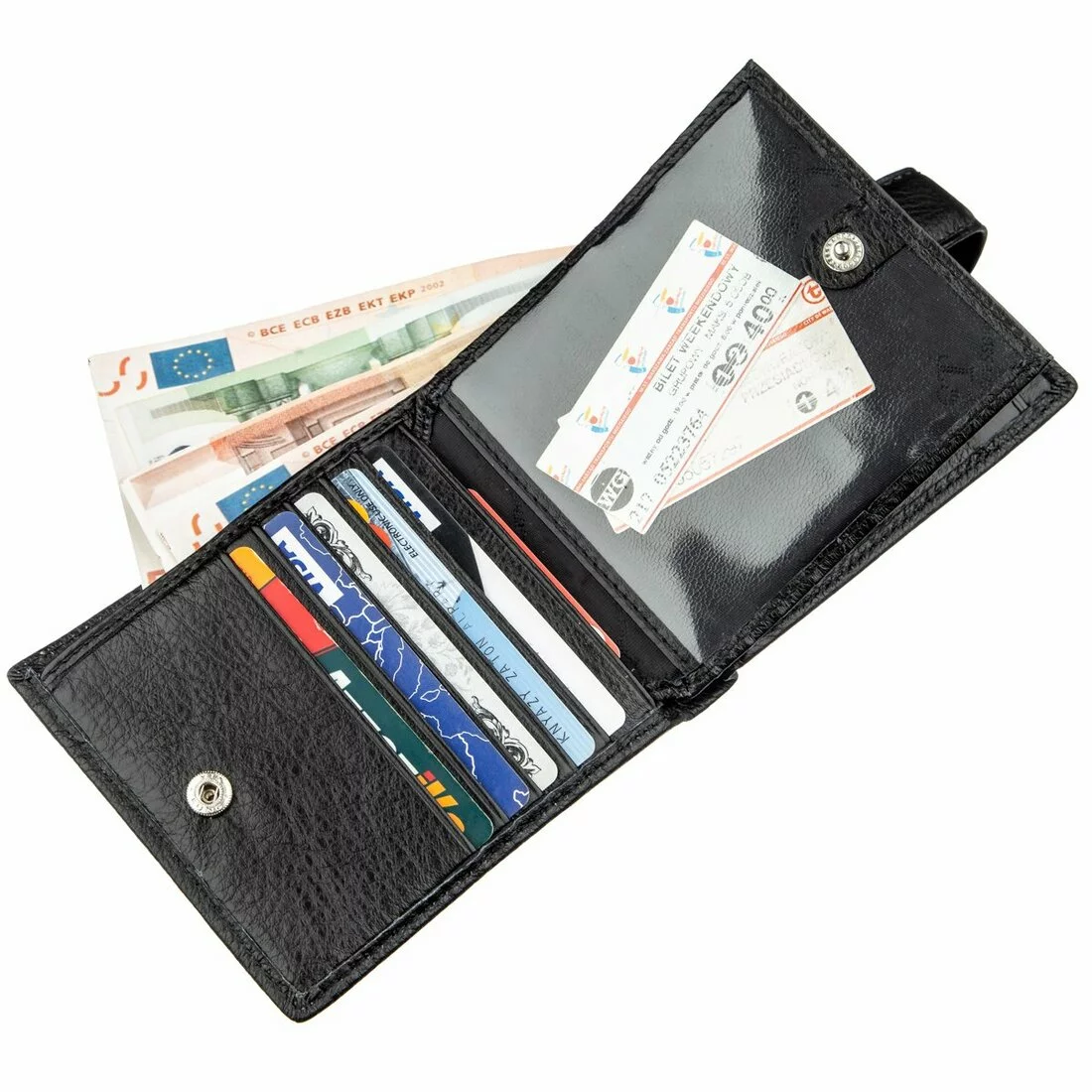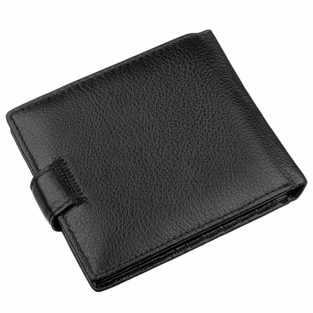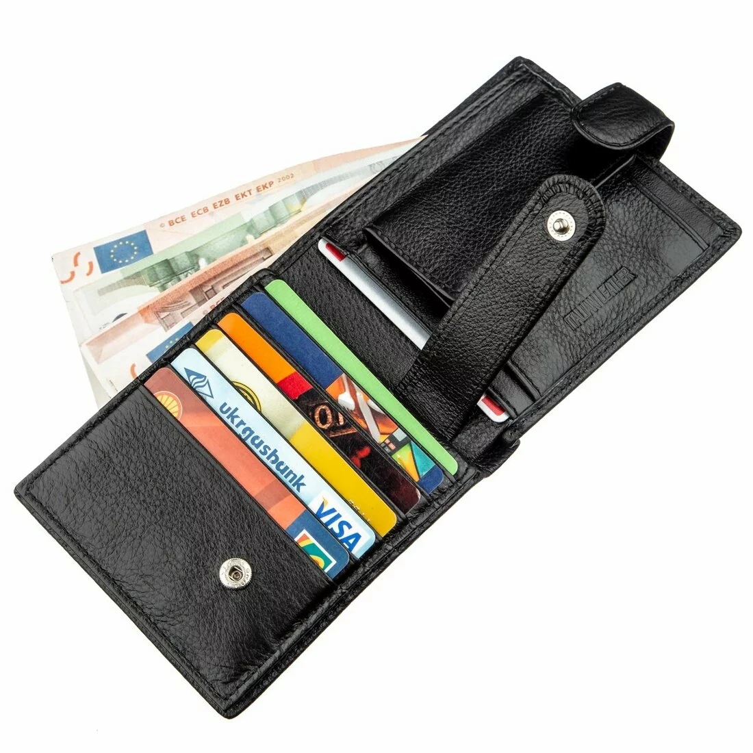 Мужской черный бумажник из натуральной кожи, гладкой и приятной на ощупь. Высокое качество исполнения кошелька есть залогом его долгосрочного служения Вам. Отличается своими компактными размерами, при этом его функциональность совсем не пострадала. Внутри находятся два отделения для купюр и монетница на кнопке. Также есть достаточное количество карманов для Ваших пластиковых карт и визиток. Такой бумажник отлично поместится в карман и не причинит абсолютно никакого дискомфорта. Данный аксессуар также может стать замечательным подарком Вашему близкому человеку. Упакован бумажник в картонную фирменную коробку.