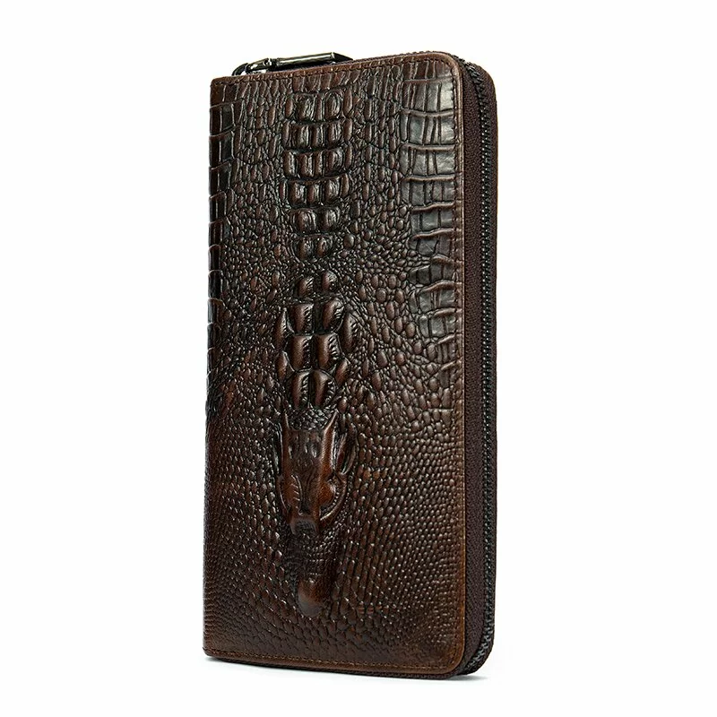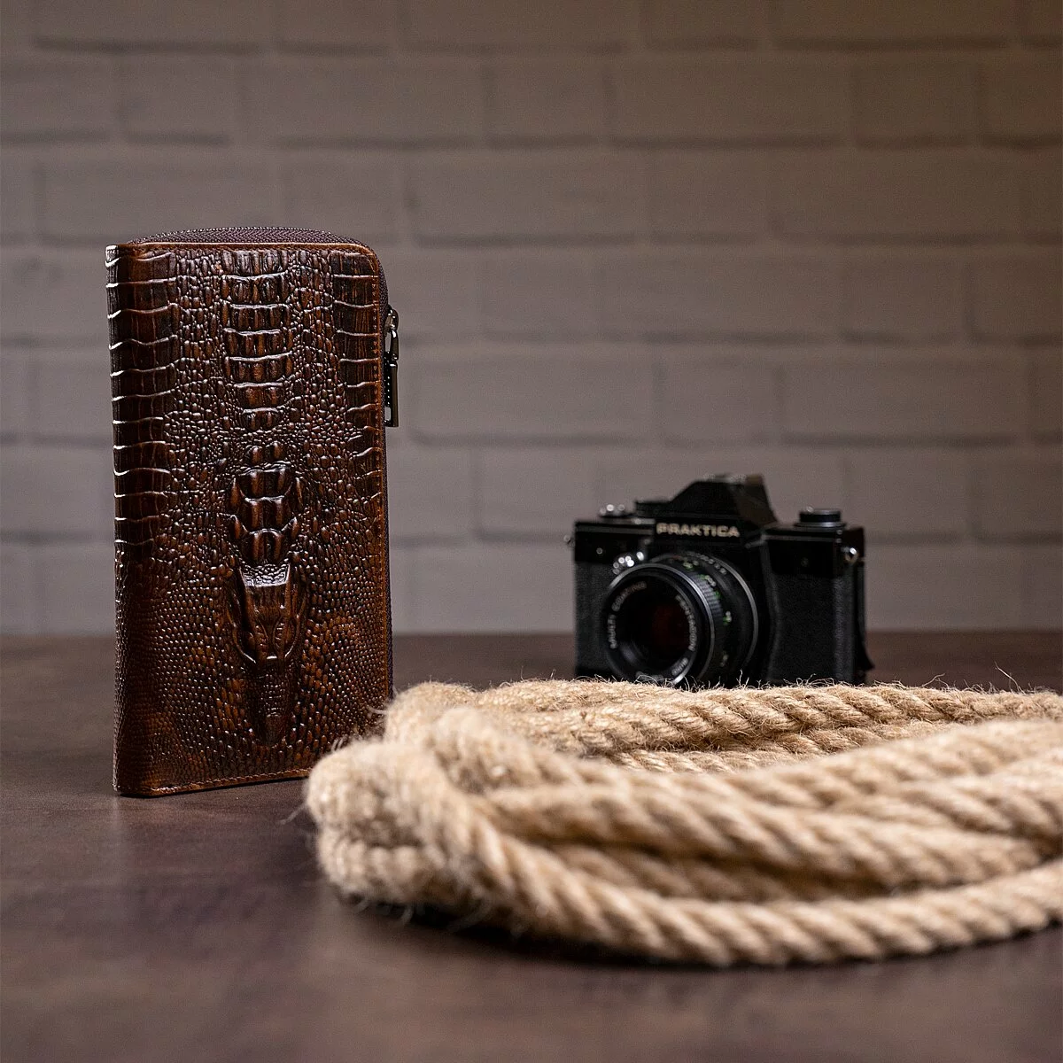 Кожаный мужской клатч с тиснением под экзотику и силуэтом каймана.