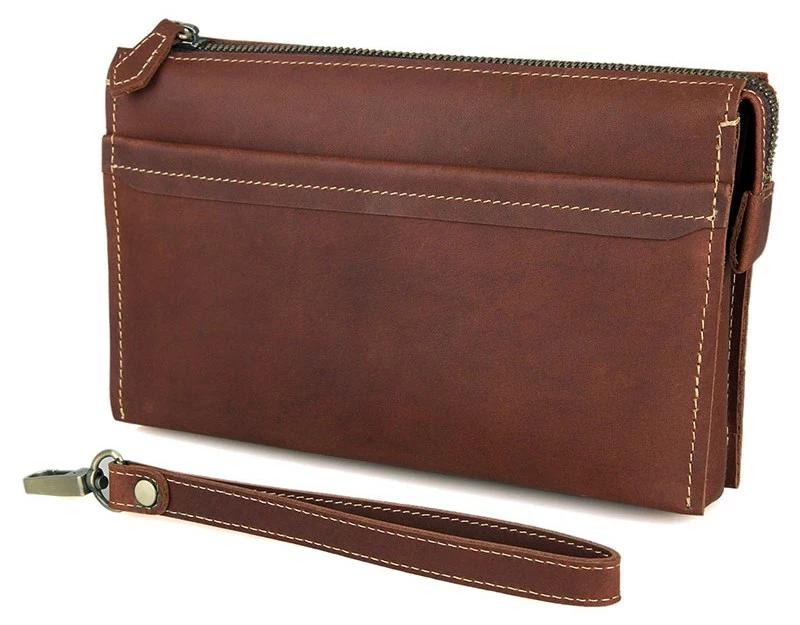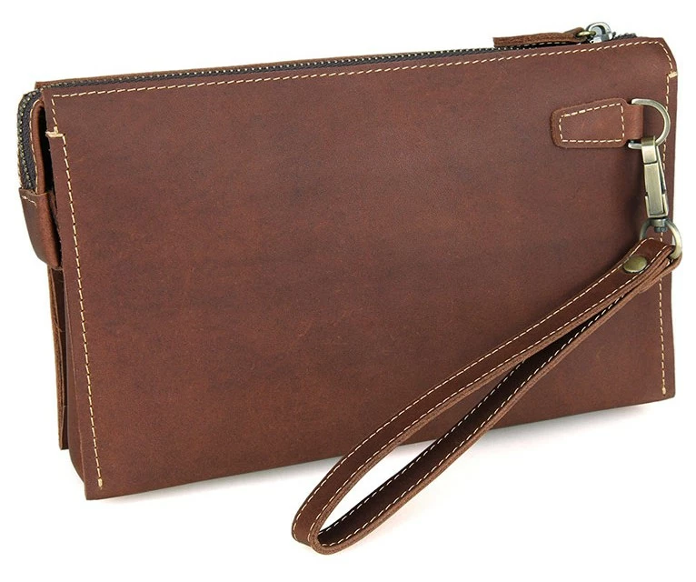 Вместительная мужская кожаная барсетка-клатч. Цвет фурнитуры латунь. Аксессуар можно переносить в руке или на запястье (в комплекте съемный регулируемый ремень-петля). Изделие аккуратно прошито прочной нитью. Подкладка выполнена из прочного текстильного материала коричневого цвета. Внутренние перегородки выполнены из кожзама. Клатч упакован в текстильный пылезащитный чехол.