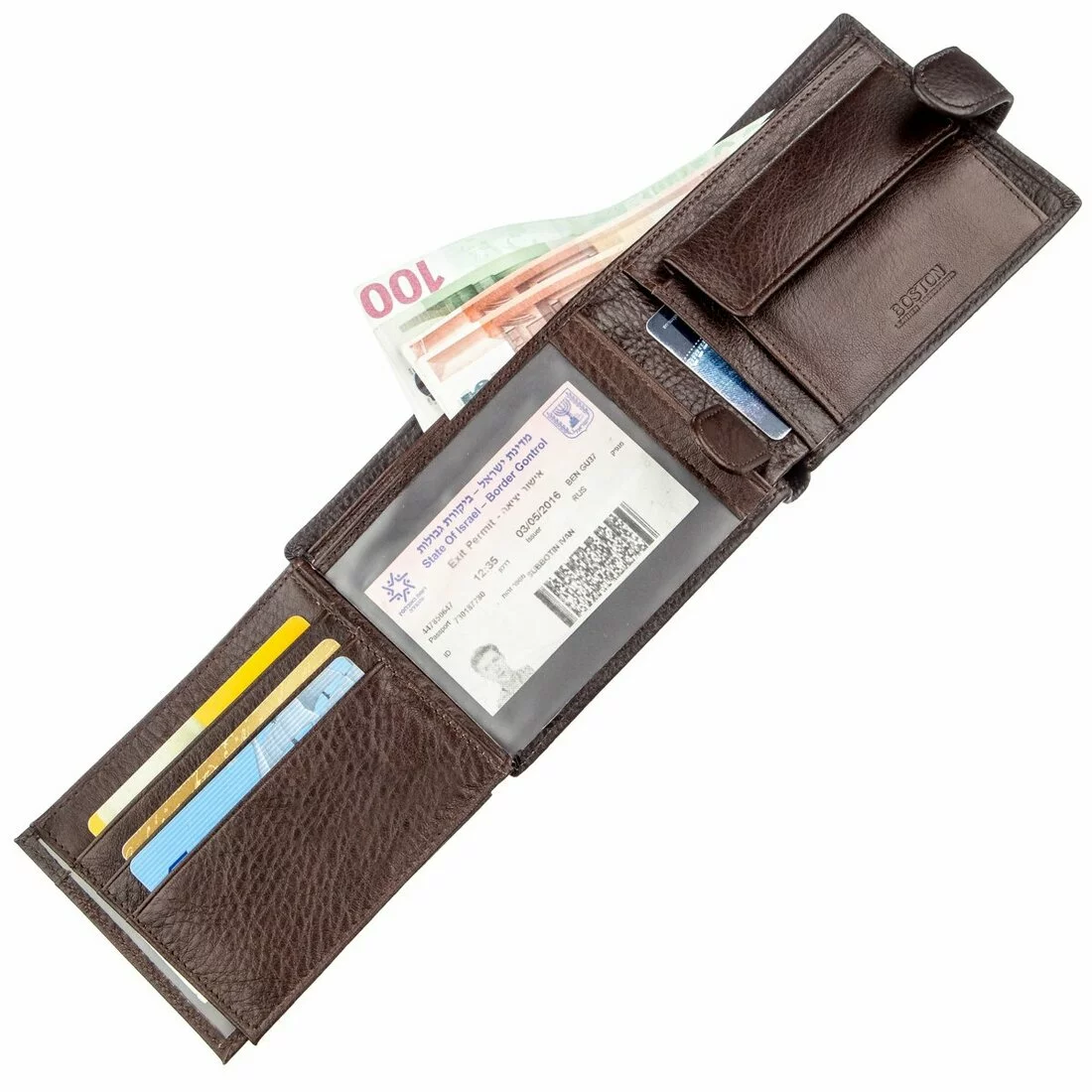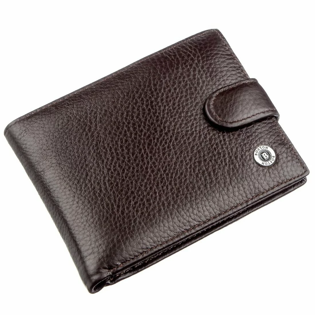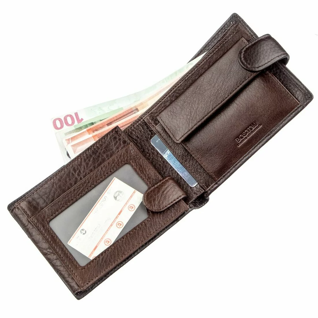 Компактный и практичный мужской кошелек из натуральной кожи темно-коричневого цвета. Не смотря, на его небольшие размеры, данный кошелек может вместить в себя практически все необходимые Вам вещи. Он имеет просторные отделения для купюр, удобный карман для мелочи и конечно же отделения для карточек и необъемных документов. Бумажник выполнен в классическом и выдержанном стиле и подойдет для представительных и деловых людей. Это замечательный подарок для близкого человека или сотрудника на работе. Купив, такой кошелек его владелец будет очень доволен и удовлетворен. Кошелек упакован в белую картонную коробку.