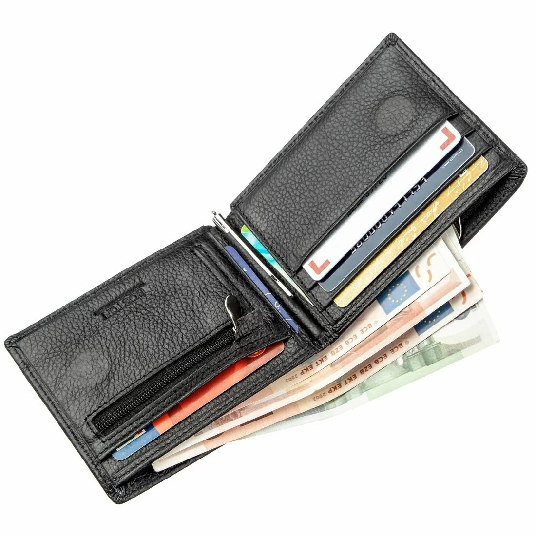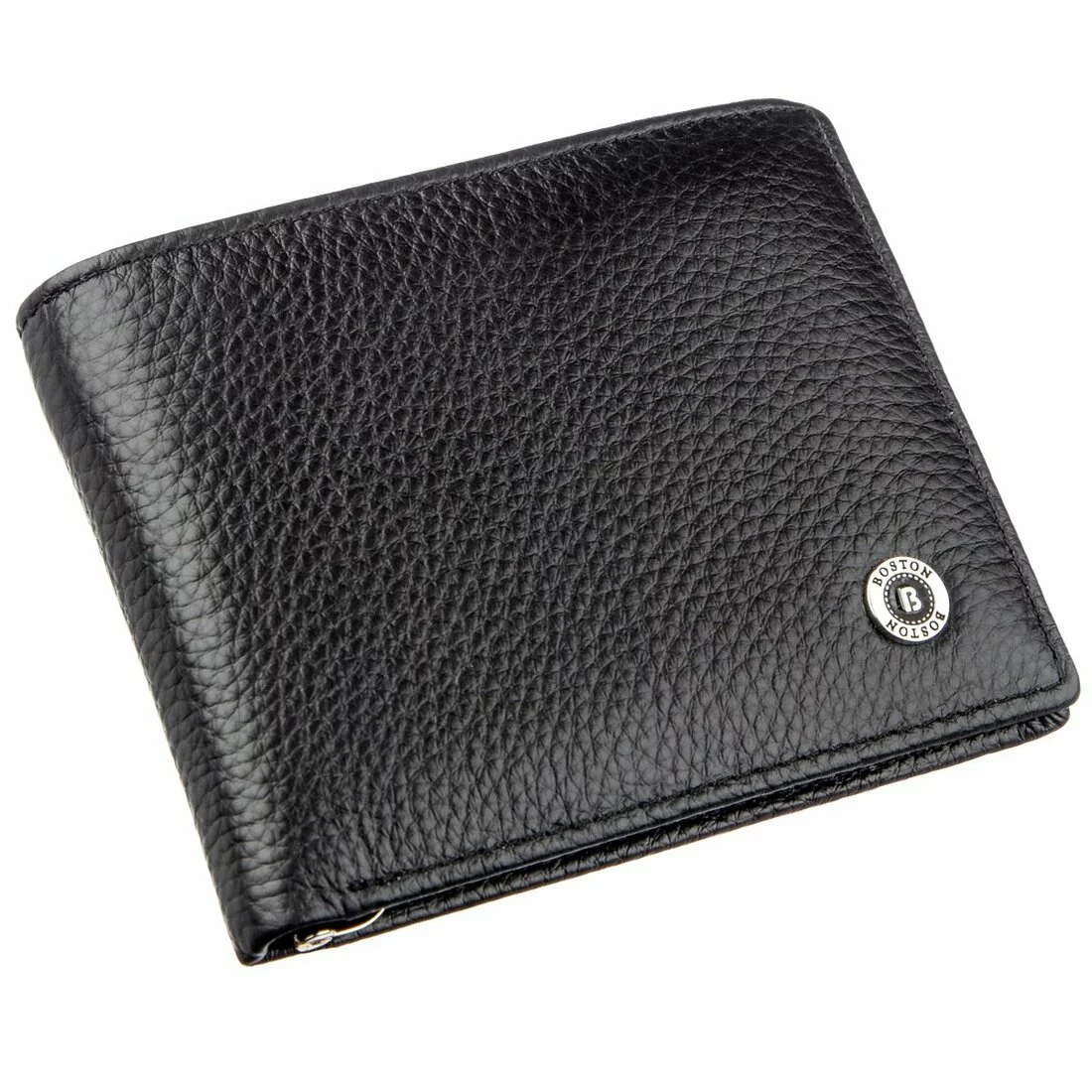Современный вместительный мужской кошелек из натуральной кожи черного цвета. Имеет простой и стильный вид. Внутри есть два больших отделения для купюр, отделение на других ценных вещей на молнии, карманы для карточек, монетница на молнии. Главной особенностью является зажим для купюр, которые сейчас очень популярные, ведь они очень удобные. А это способствует быстрому доступу к деньгам. Такой кошелек станет прекрасным приобретением для Вас или замечательным подарком близкому человеку. Упакован аксессуар в фирменную картонную коробку.