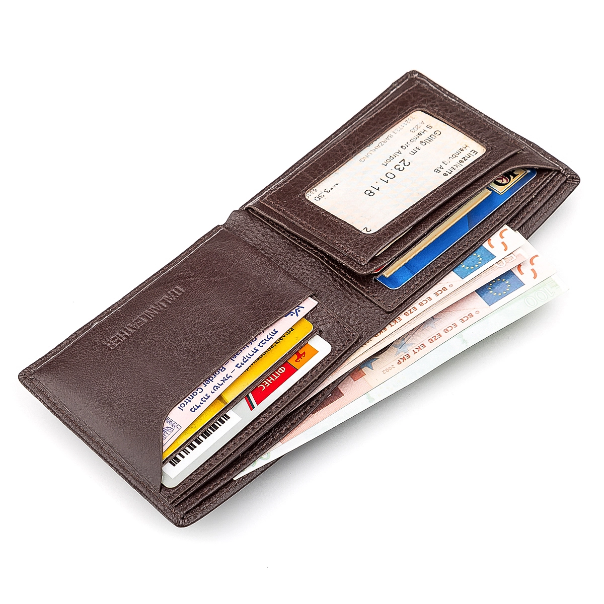 Это, пожалуй, лучший вариант для тех, кто нуждается в небольшом кошельке без монетницы и без фиксации. Внутри этого кошелька предусмотрено 2 отверстия под купюры и несколько ячеек для пластиковых карт. Также в кошельке есть так званый уголок-держатель и карманчик с прозрачным окошком, в котором очень удобно хранить права. По краю изделия кошелек оснащен аккуратной строчкой, а с лицевой стороны расположен аккуратный фирменный значок. Снаружи дополнительных карманчиков нет. В комплект с товаром идет фирменная коробочка от производителя.