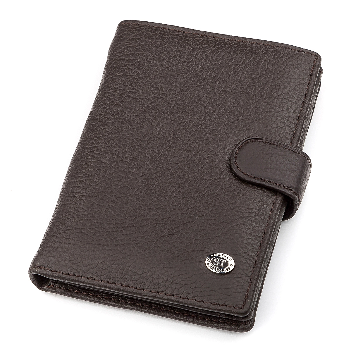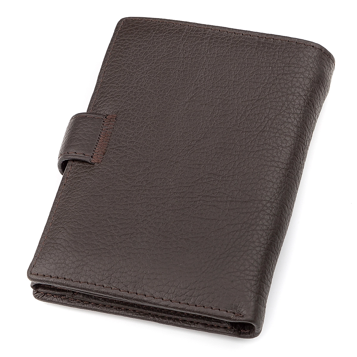 Большая моделька, которая фиксируется кнопкой. Для банкнот выделено 2 больших отделения, одно из которых можно закрыть. Для карт выделено 8 ячеек, также имеется несколько прозрачных ячеек и съемный блок для документов. Выполнен кошелек из натуральной говяжьей кожи.