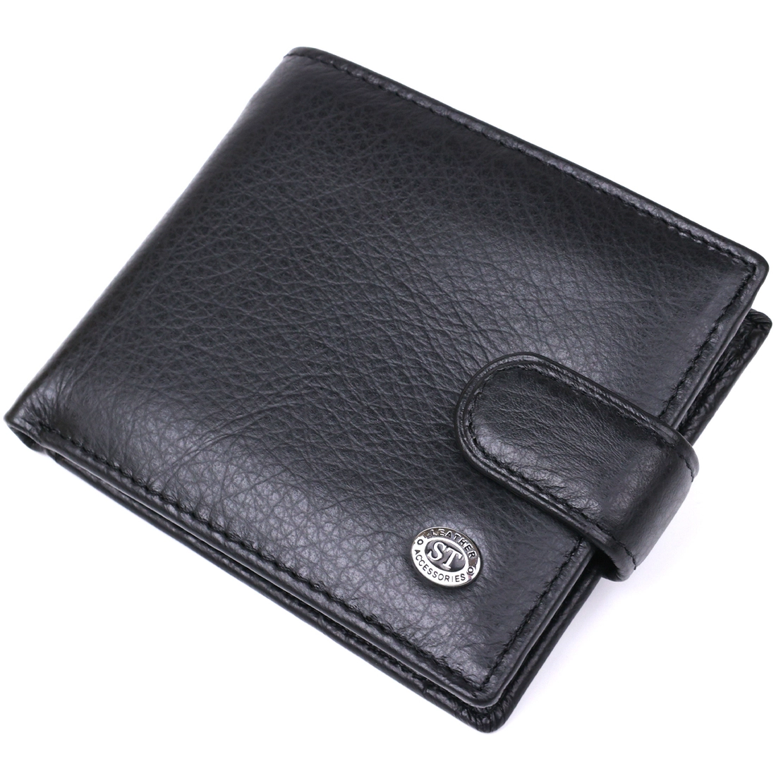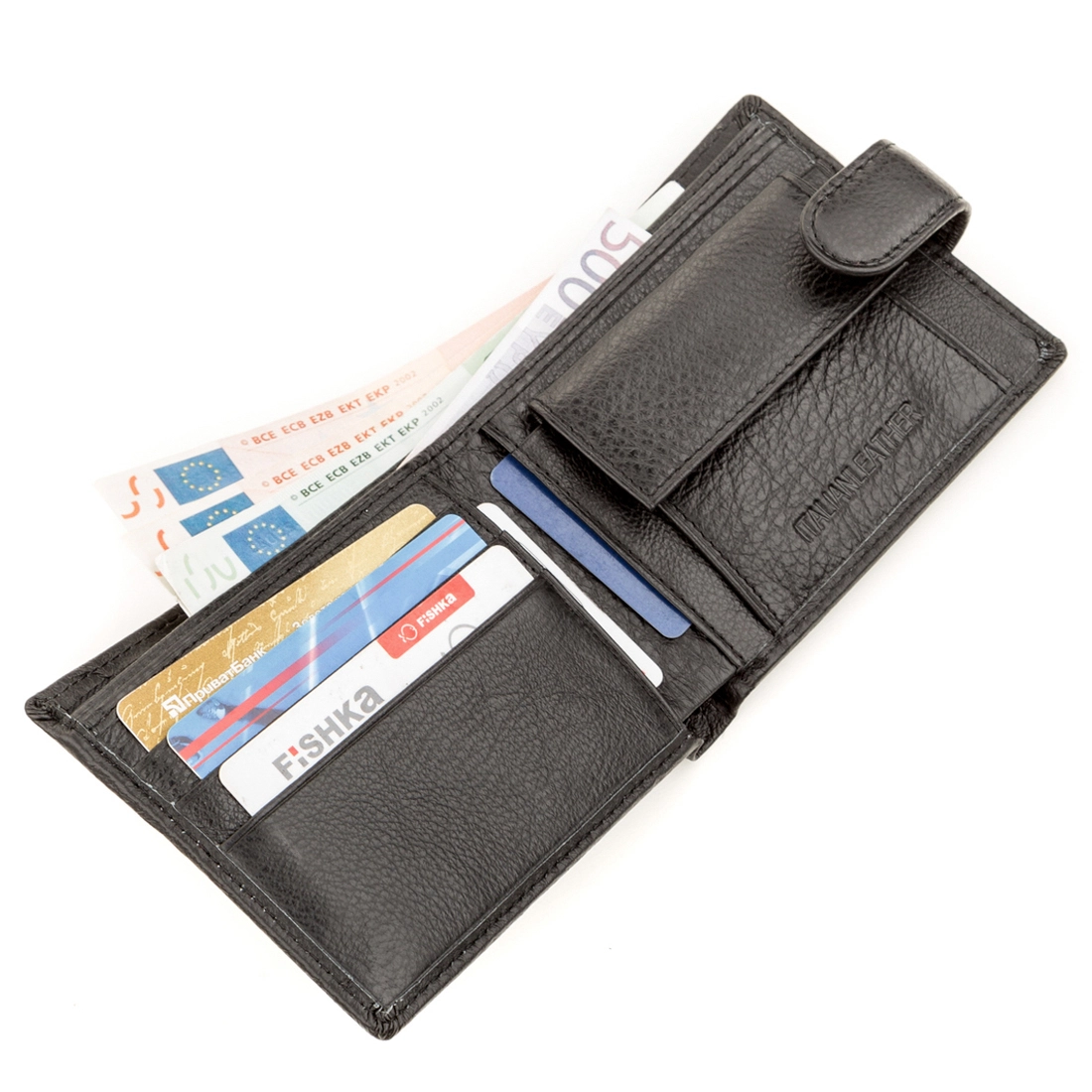 Бумажник с застежкой для мужчин с двойным сложением отличается уникальным дизайном и удобством в эксплуатации. В данной модели вы сможете разместить все самое необходимое: кредитка, мелочь и банкноты. Для изготовления использована черная натуральная кожа. Отличительным знаком бренда является ровная строчка по канту и фирменный логотип.
