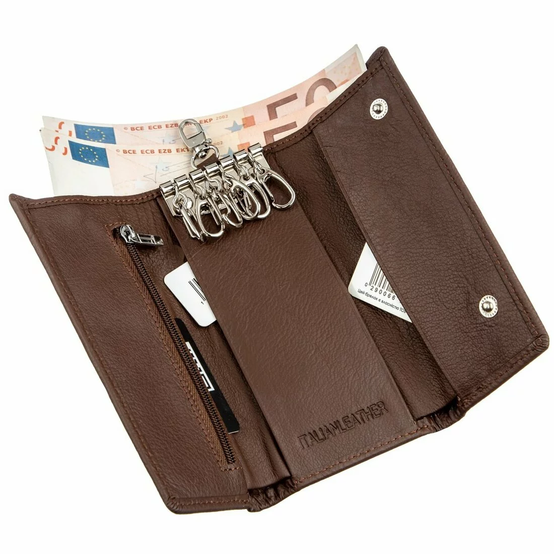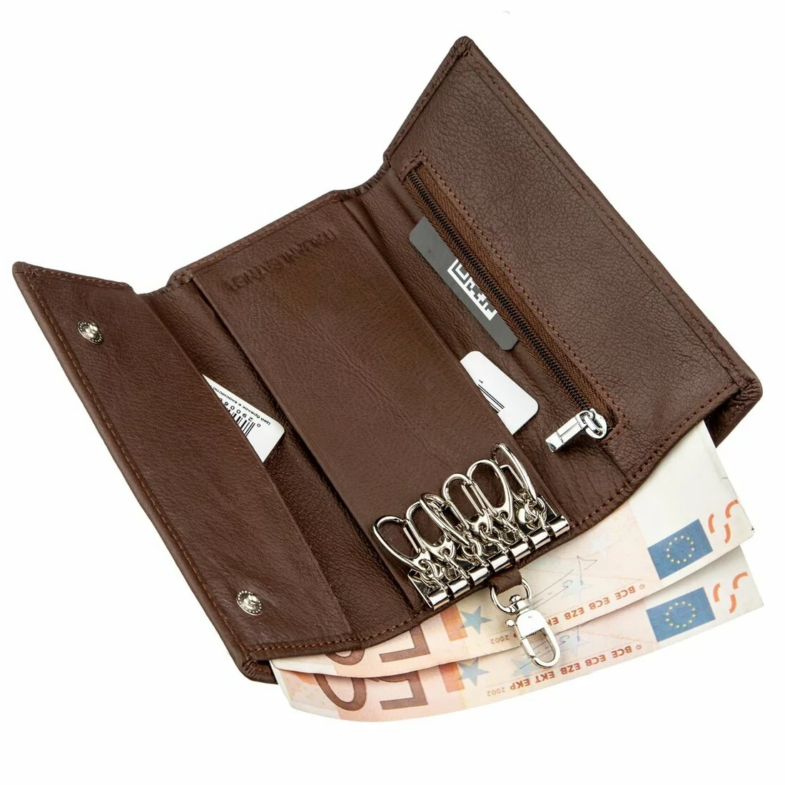 Элегантная ключница для мужчин, которая легко выполняет функции мини-бумажника. Сделана из высококачественной кожи стильного коричневого цвета. Имеет полноценное отделение для купюр, а также отделение на молнии для других ценных вещей. Если Вы по своей натуре минималист и не любите большие громоздкие кошельки, но при этом Вам необходимо с собой всегда иметь деньги, ключи и прочие мелочи, то данный аксессуар просто идеально подходит под эти требования. Также бумажник-ключница имеет крючок, чтобы прицепить его или на пояс, или на любой другой аксессуар. Упаковано данное изделие в плотную картонную коробку белого цвета.