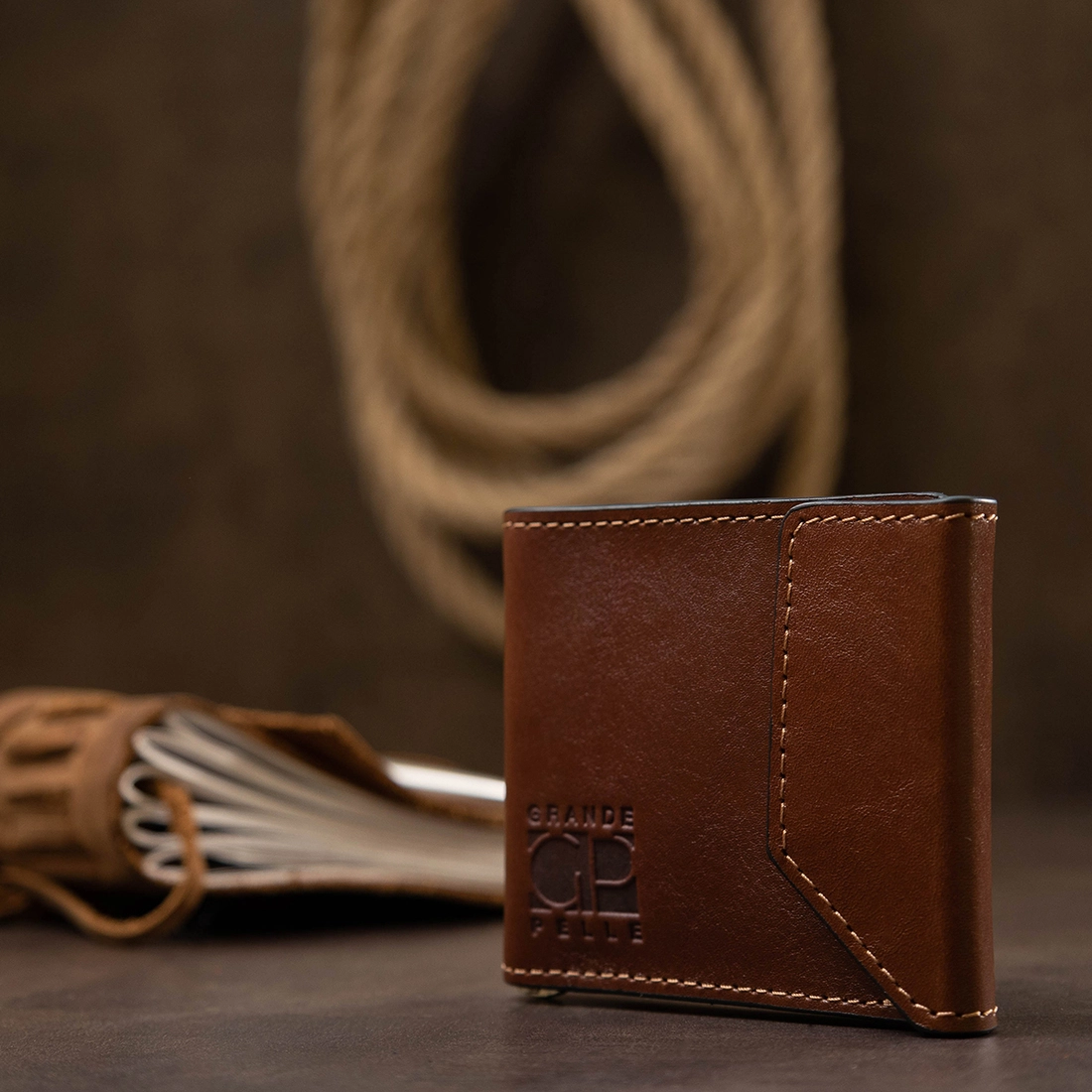 Стильный мужской зажим для денег в насыщенном коричневом цвете от известного украинского производителя. Закрывается на удобный и практичный магнит. Внутри также кроме зажима есть два кармана для карт. Выполнен аксессуар из натуральной высококлассной кожи. Упакован зажим в фирменный плотный чехол.