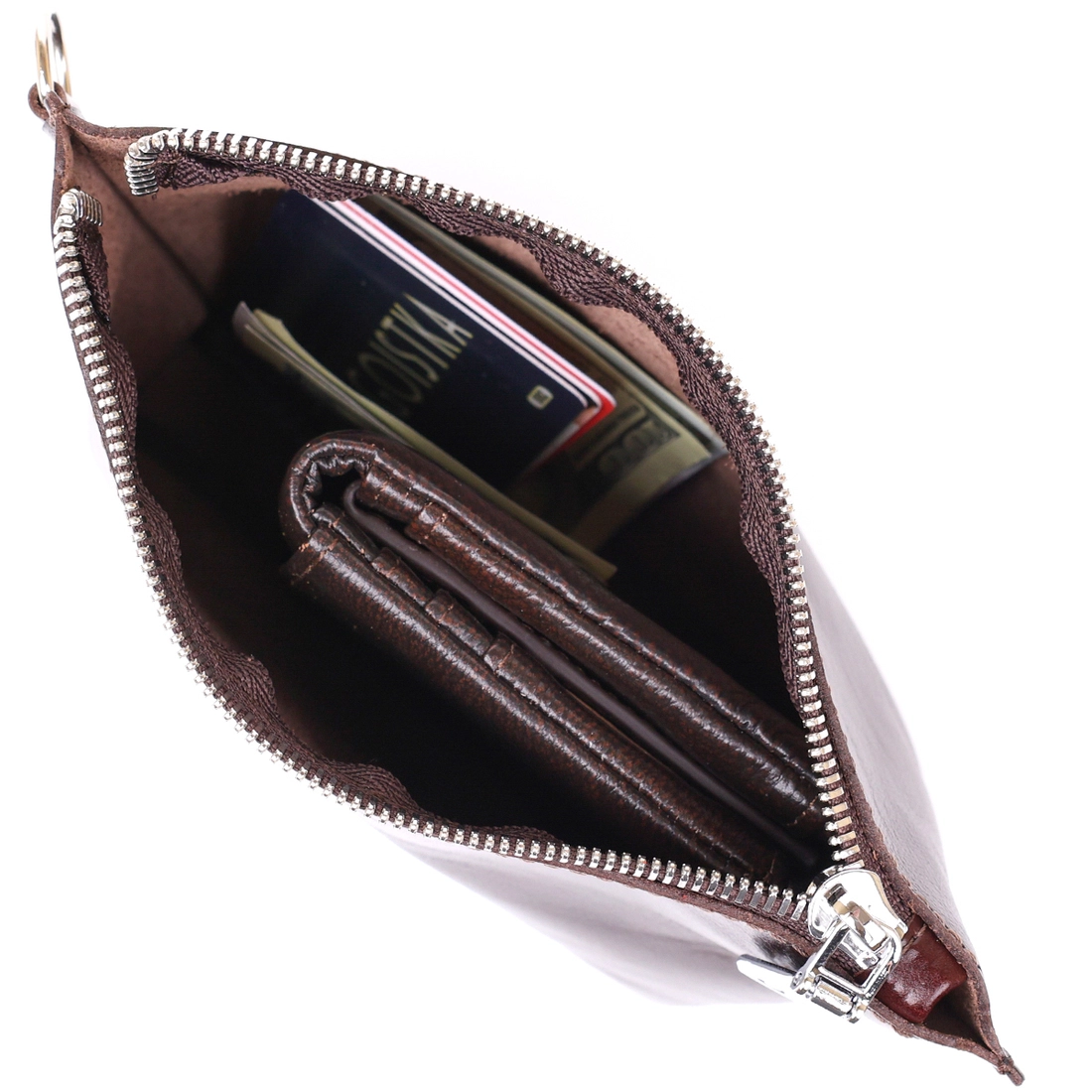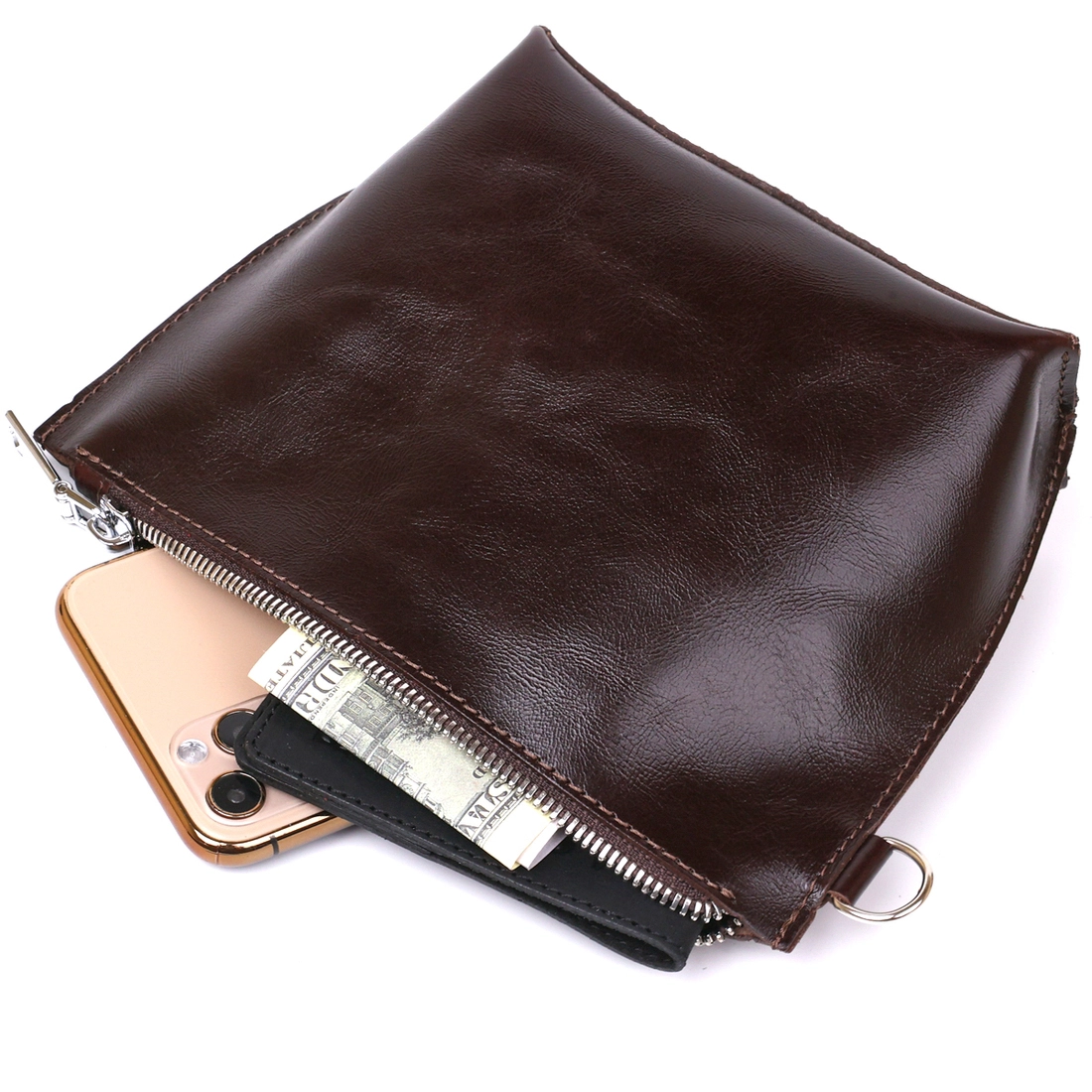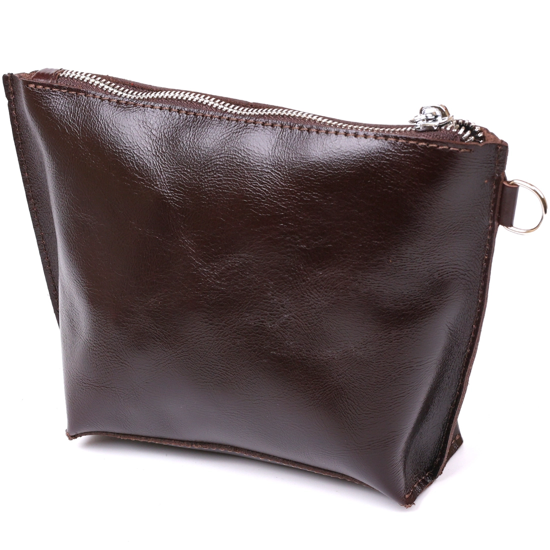 Отличная косметичка для ценных негабаритных вещей, которая легко поместится в сумку или в рюкзак. Цвет изделия – насыщенный коричневый с легким переливом, фактура – гладкая и приятная на ощупь. Материал – натуральная кожа с улучшенными характеристиками прочности и износостойкости. Закрывается косметичка на молнию.