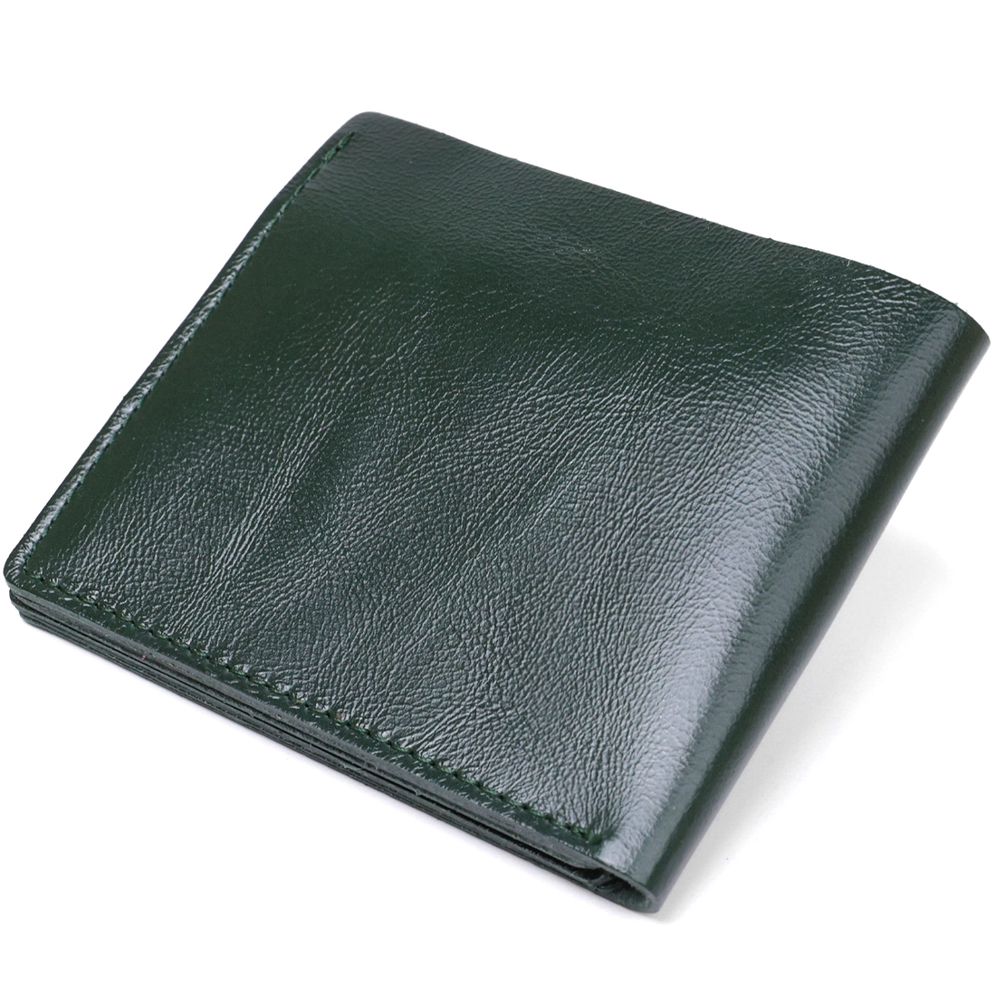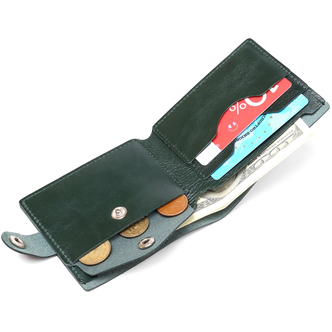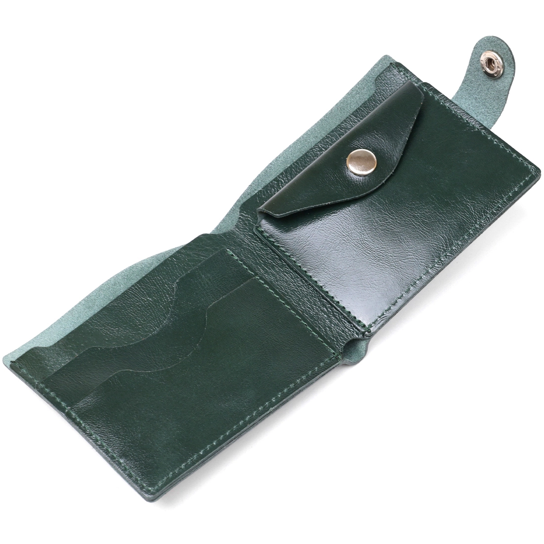 Современное портмоне в два сложения от украинского производителя. Выполнено изделие из натуральной кожи высокого класса и улучшенной прочности. Внутри есть вместительное основное отделение для купюр, слоты для визитных и кредитных карточек и компактная монетница на кнопке для мелочи. Цвет изделия – зеленый, фактура гладкая с легким отливом.