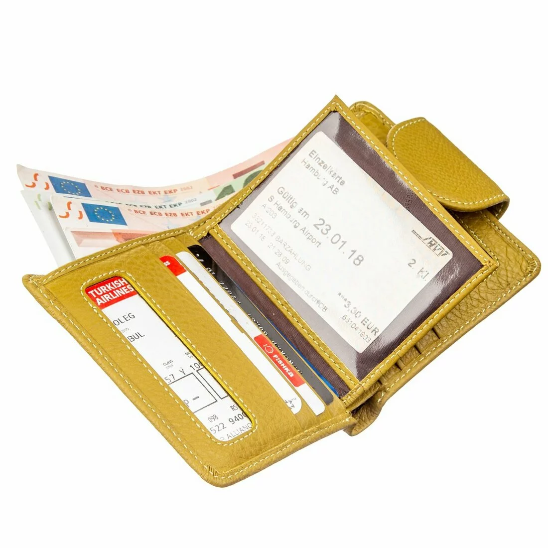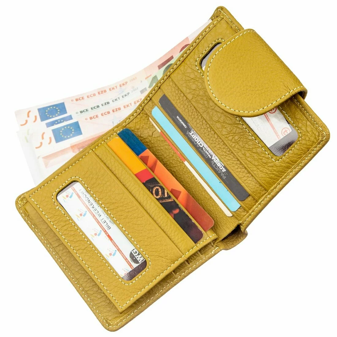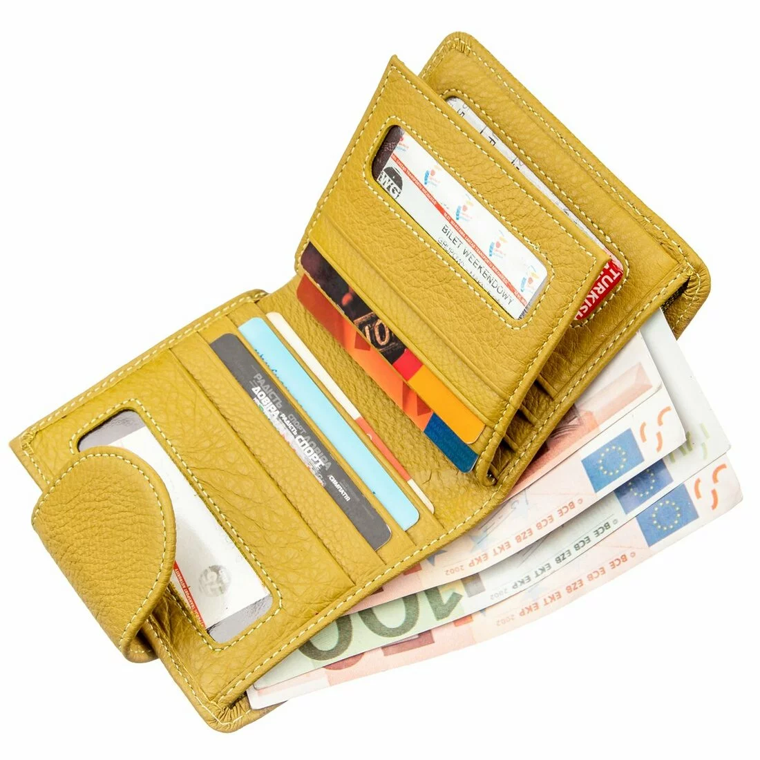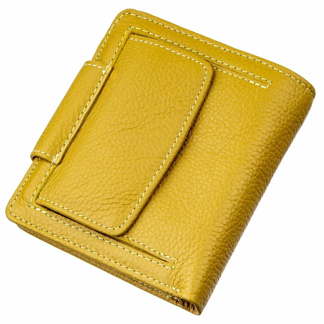 Чудесное женское портмоне для прагматичных и деловых женщин. Выполнено из первосортной натуральной кожи с прекрасными свойствами. Имеет красивый и сочный желтый цвет, который придает кошельку особого шарма. Относительно небольшие размеры данной модели никак не отразились на ее вместительности. Внутри есть все необходимые отделения и карманы для купюр и банкнот, для пластиковых и бумажных карт, для фото любимого человека и прочее. Монетница находится на внешней стороне и закрывается на металлическую кнопку, как и само портмоне. Упаковано изделие в плотную картонную коробку белого цвета.