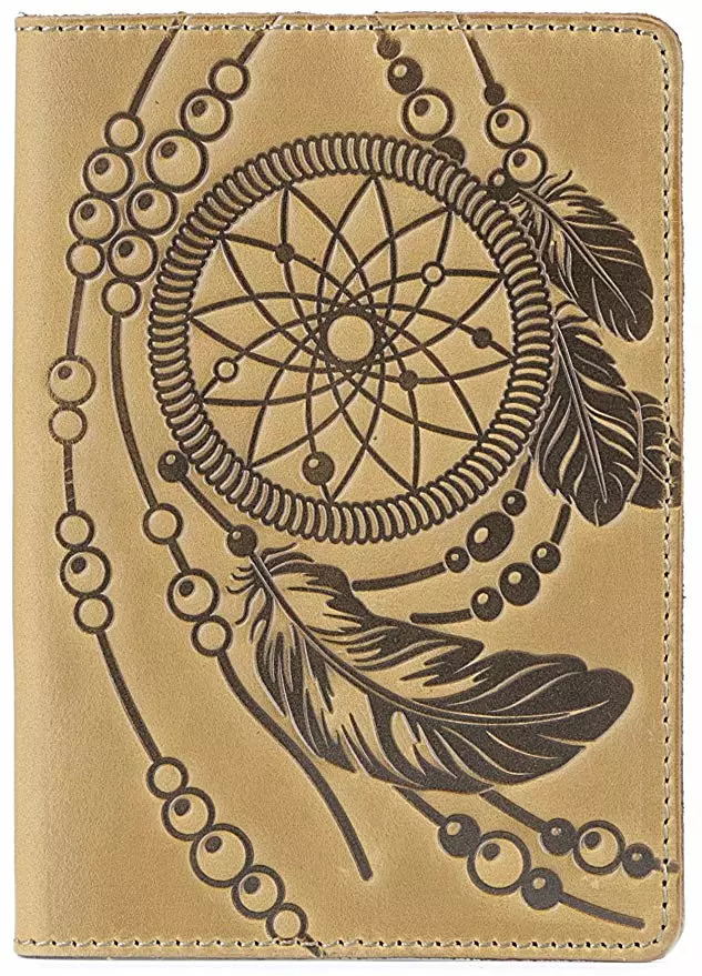 Дизайнерская обложка на паспорт из натуральной винтажной кожи. Рисунок на лицевой стороне изделия сделан в стиле индейского талисмана Ловца Снов (dreamcatcher). Внутри обложки Вы найдете тесненный логотип компании-производителя SHVIGEL. Обложка на паспорт поставляется в фирменном текстильном мешочке.