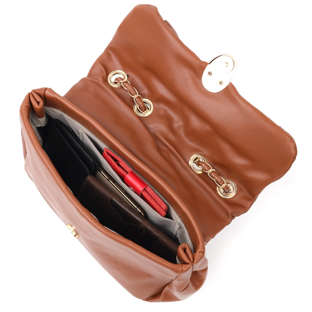 вечерний, так и повседневный образ. Фурнитура в сумке золотого