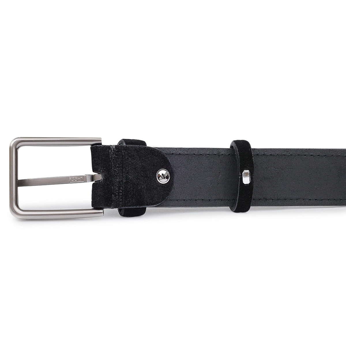 Красивый замшевый ремень от известного украинского производителя. Имеет насыщенный черный цвет и светло-коричневые строчки по краям. Материал изготовления – натуральная кожа высокого качества и стойкости к повреждениям. Пряжка ремня имеет простой и лаконичный дизайн с классическим механизмом.