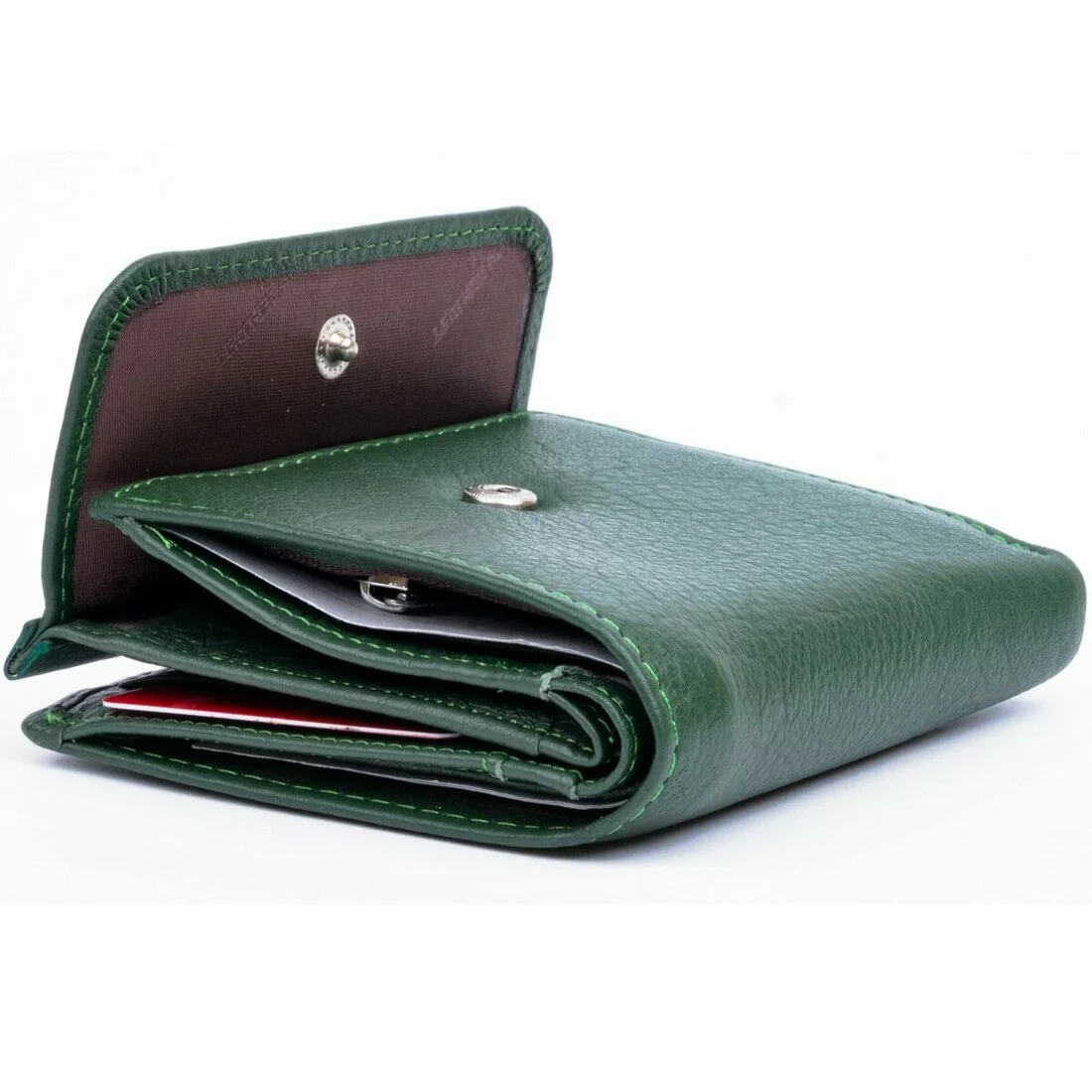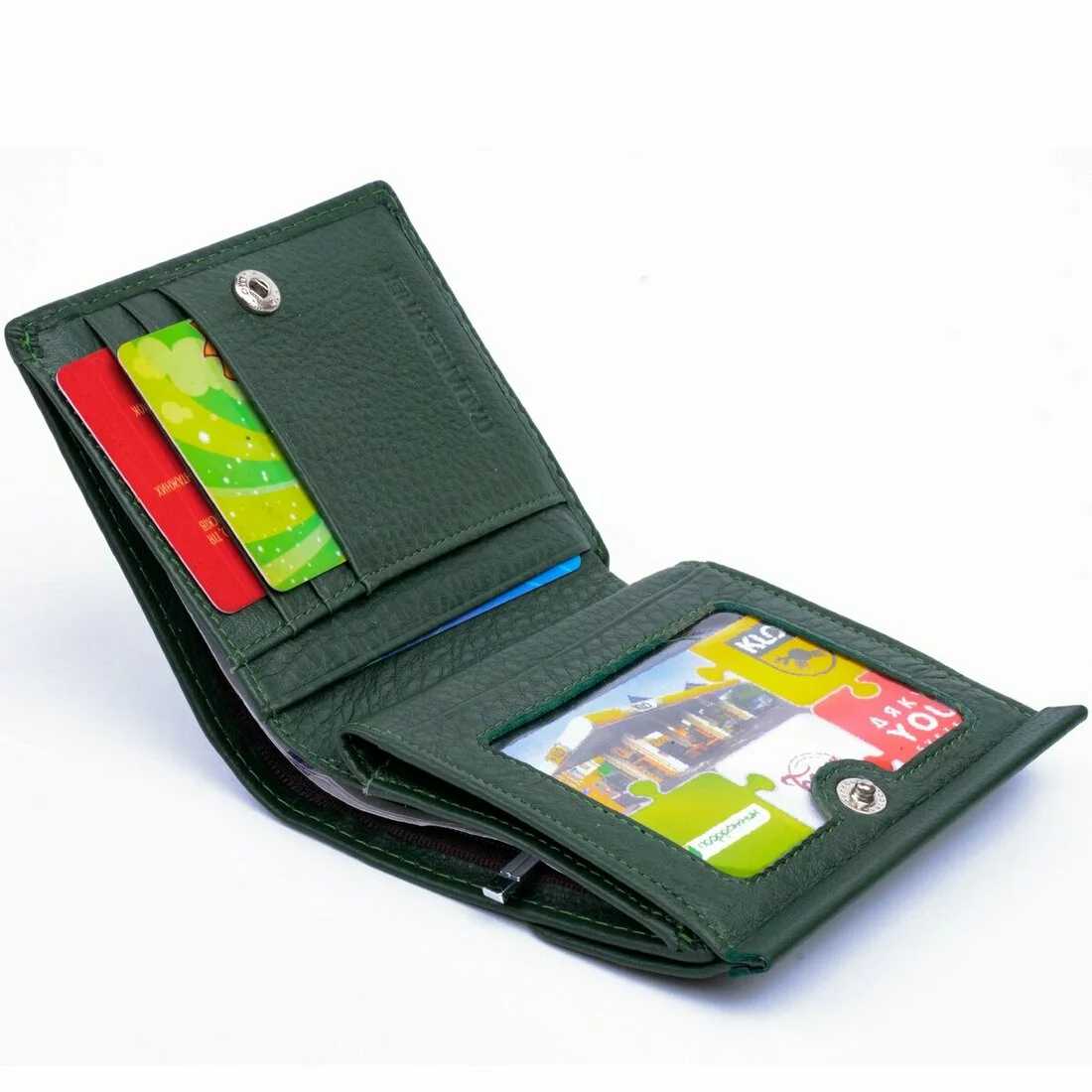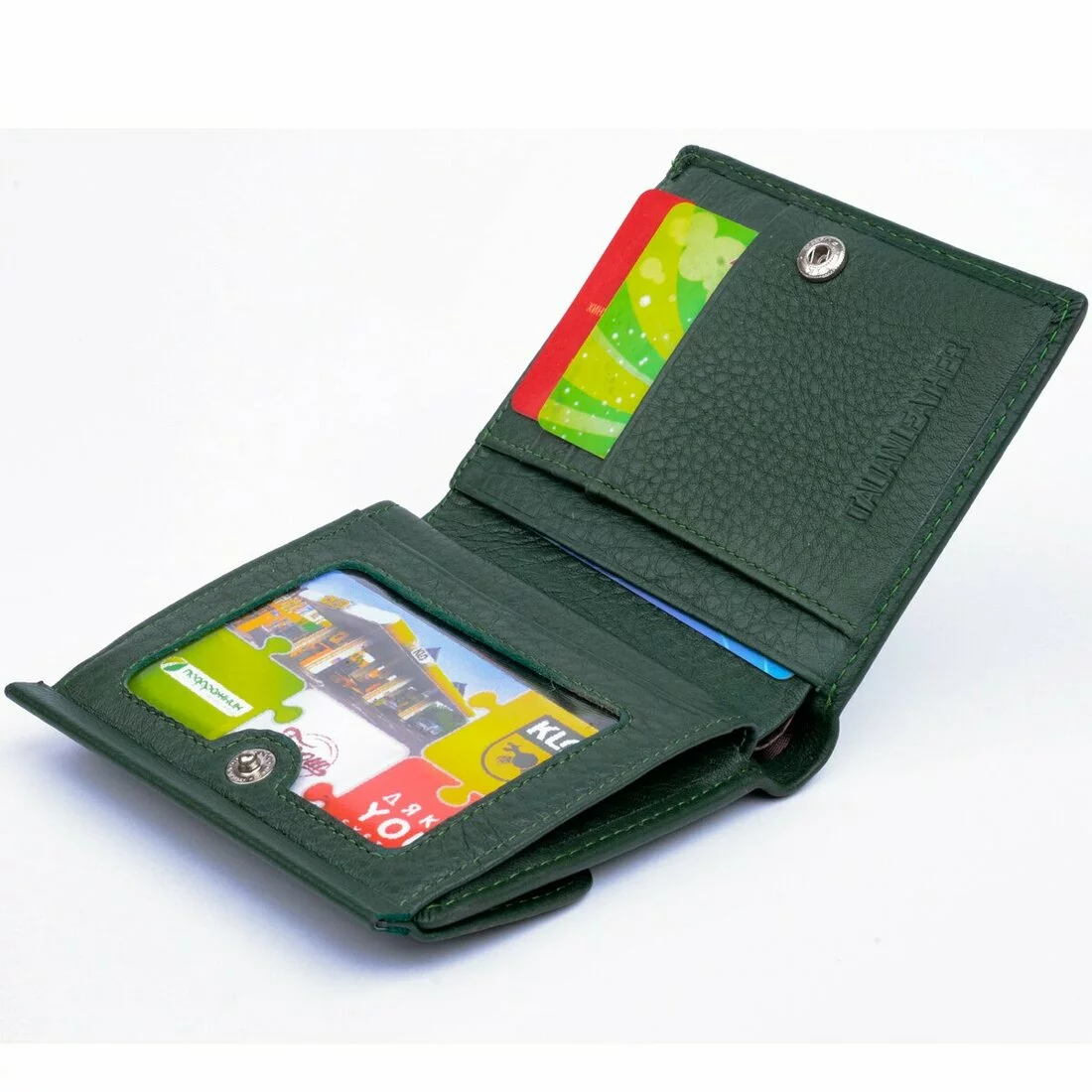 Эффектный женский кошелек компактных размеров с оригинальным и красивым дизайном. Отлично подойдет тем, кто носит с собой минимум необходимых вещей. Выполнен он из добротной натуральной кожи превосходного качества и с достойными характеристиками. Изюминкой кошелька является его неповторимый зеленый цвет, который хоть и смотрится ярко, но в то же время вполне сдержанный и интеллигентный. Наполнение кошелька имеет все необходимые отделения и карманы для Ваших купюр, карточек и фото. Данный аксессуар - отличный вариант для подарка женщине независимо от ее возраста. Упакован кошелек в фирменную плотную коробку белого цвета.