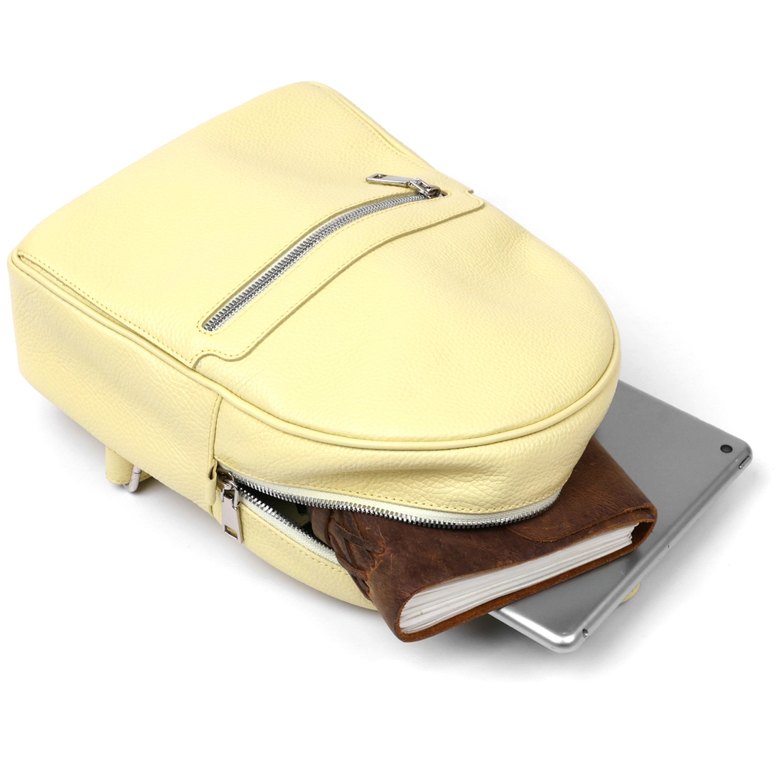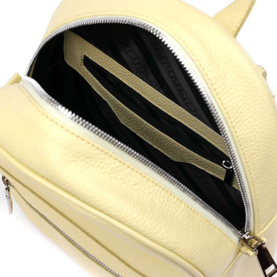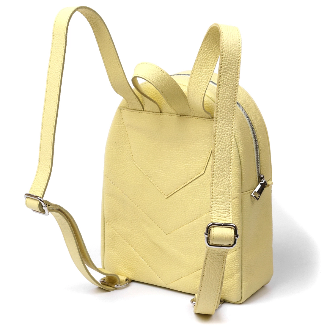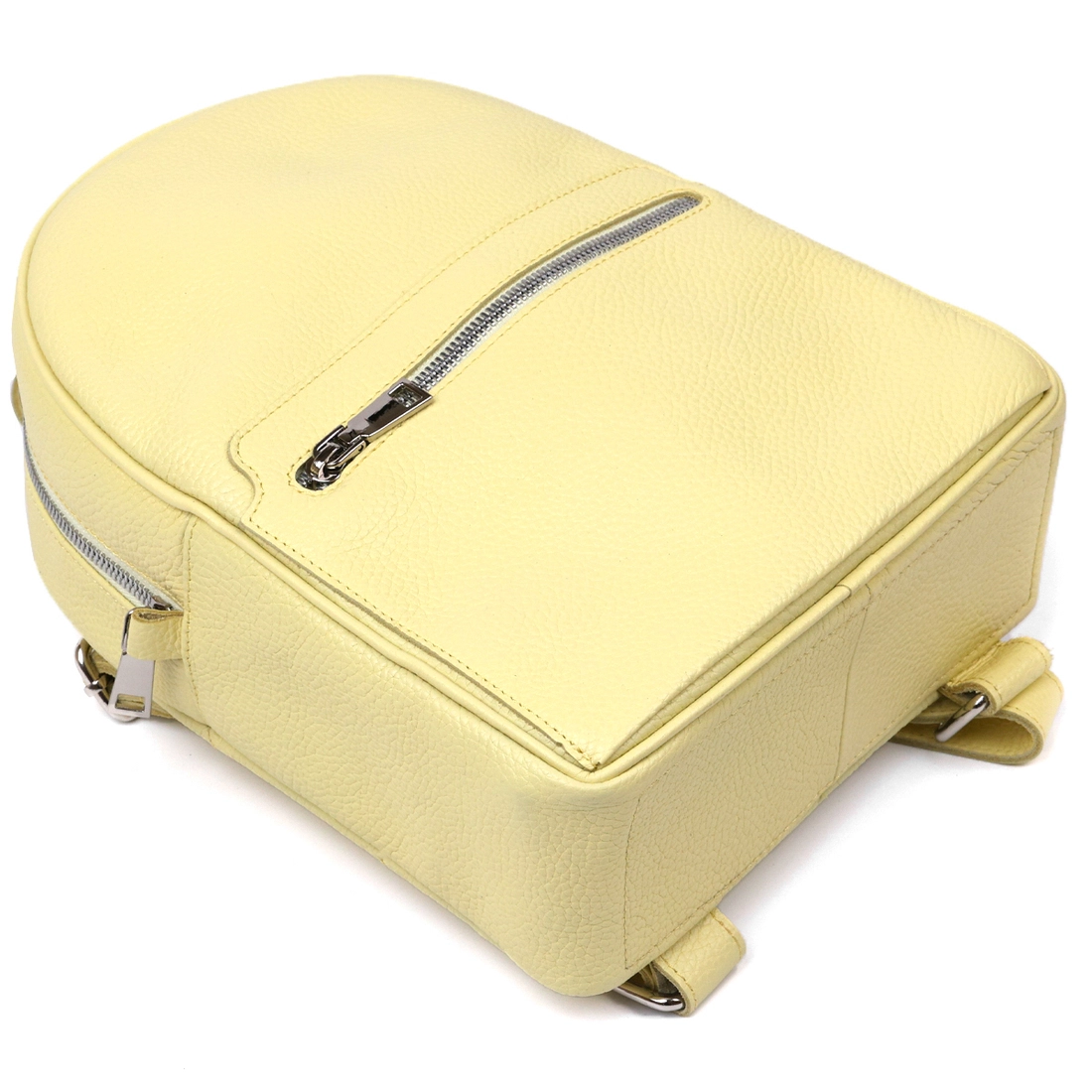 Удобный и практичный женский рюкзак в оригинальном лимонном цвете, что смотрится очень свежо и красиво. Материал изготовления – натуральная высококлассная кожа с отменными показателями износоустойчивости. Внутреннее наполнение представлено в виде вместительного основного отделения. Также на внешней стороне есть небольшой карман на молнии.