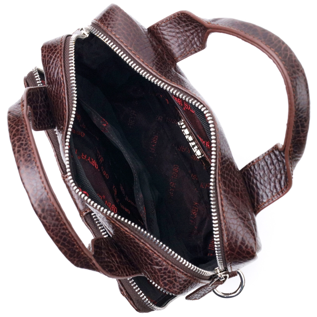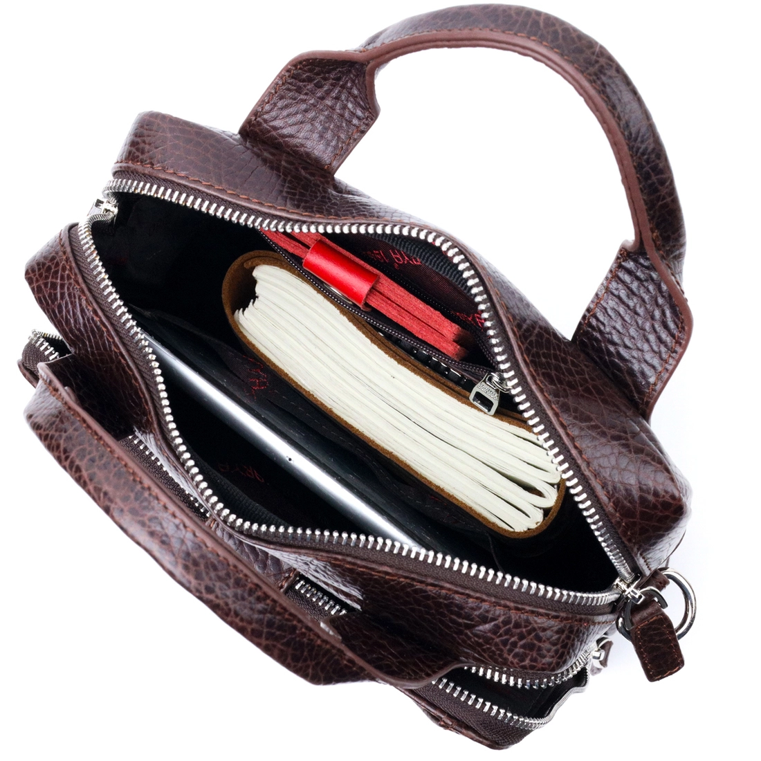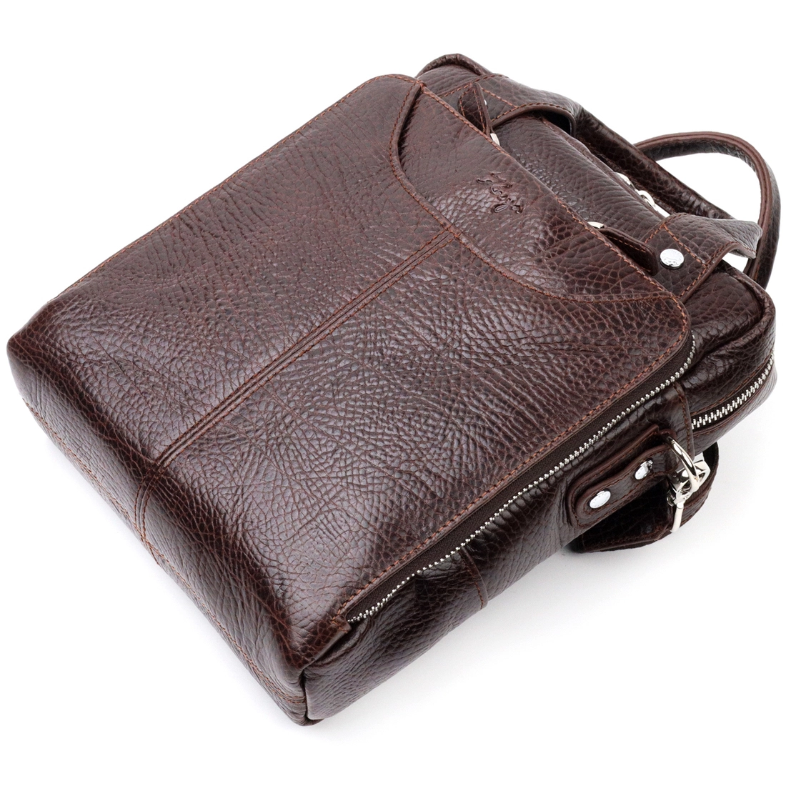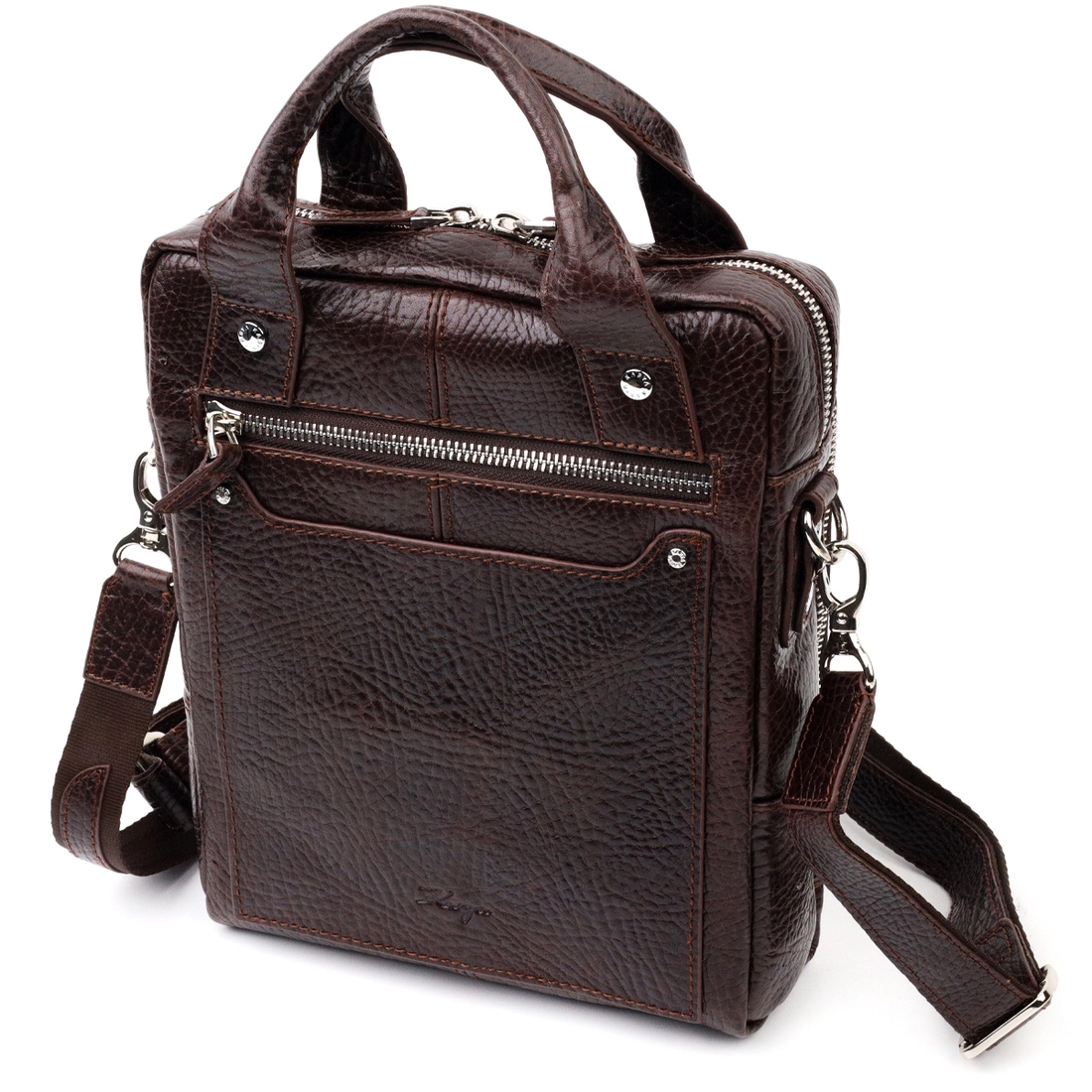Стильная мужская сумка коричневого цвета из натуральной зернистой кожи высокого качества. Аксессуар имеет надежную фурнитуру серебристого цвета и прочную подкладку. Изделие упаковано в фирменный текстильный мешок Karya. Качественная мужская сумка из натуральной кожи, всегда была отличным подарком для мужчины любого возраста.