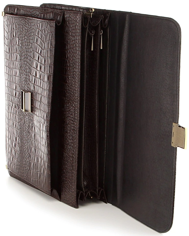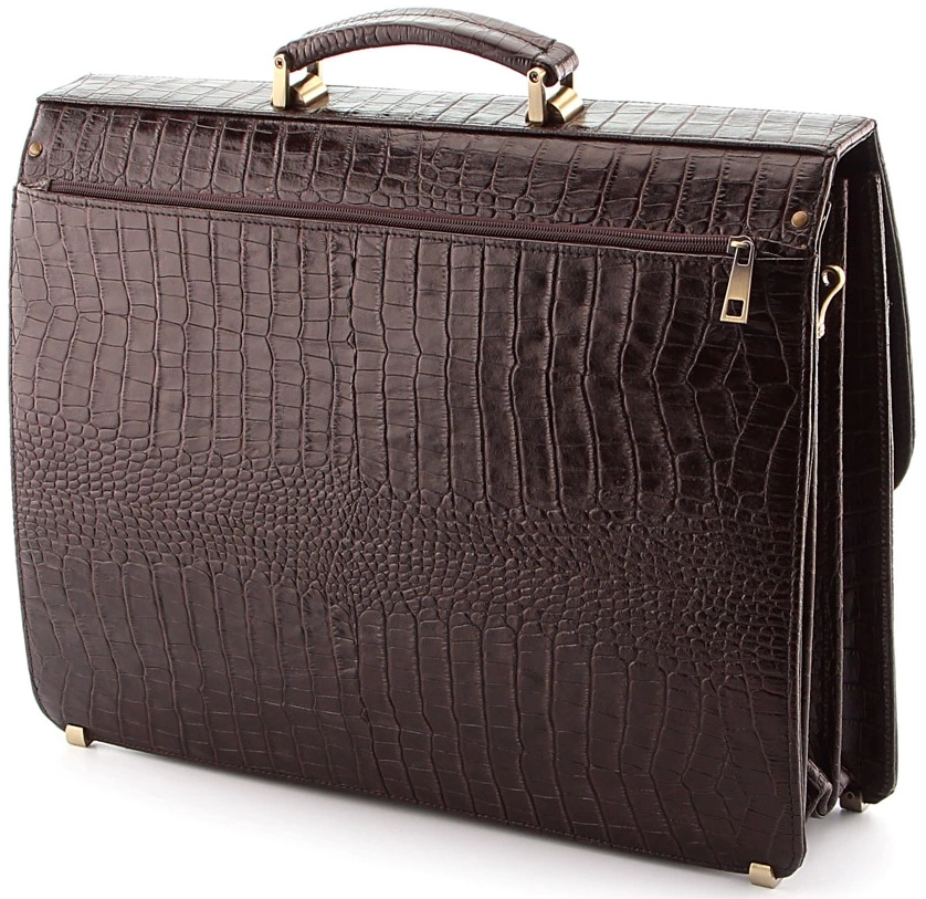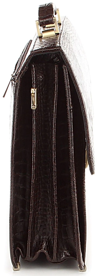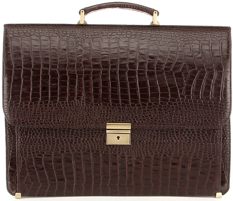 Большой мужской портфель из натуральной кожи с фактурой под крокодила коричневого цвета. Аксессуар выглядит очень стильно и дорого. Пошито изделие безупречно качественно. Цвет используемой фурнитуры: желтый. На задней внешней стенке находится отделение на молнии. Портфель закривается на ключик и упакован в текстильный пылезащитный чехол черного цвета.