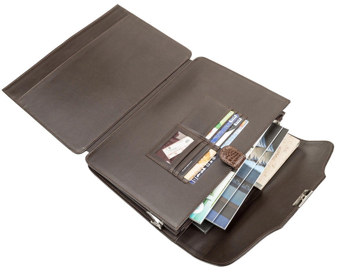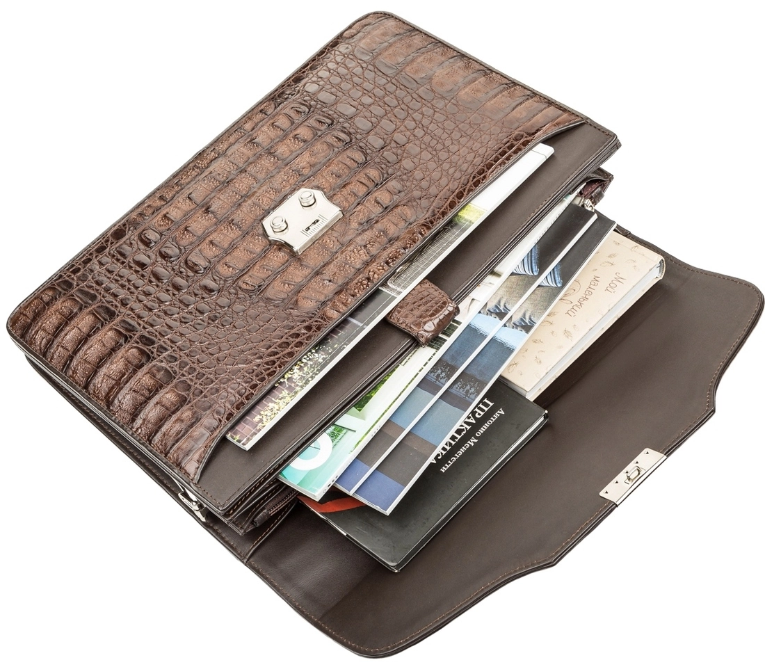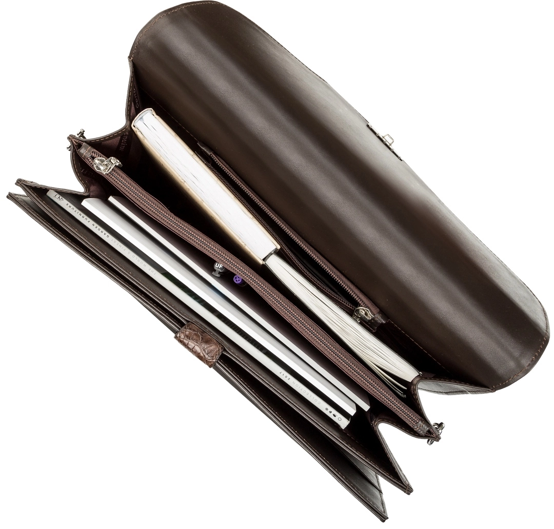 Многофункциональный коричневый портфель из натуральной кожи крокодила, на клапане которой расположена фактурная затылочная часть шкуры крокодила, а на обратной стороне фактурная спинная часть шкуры. Каждое изделие из этого материала обладает своей необычной структурой и неповторимым узором. В аксессуаре использована исключительно качественная фурнитура, серебряного цвета. Изделия из кожи крокодила всегда считались большой роскошью, так как в мире не так уж много компаний, которые занимаются выделкой такой кожи, поскольку этот процесс действительно чрезвычайно трудоемкий.