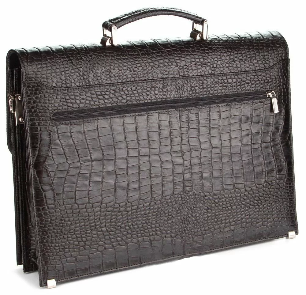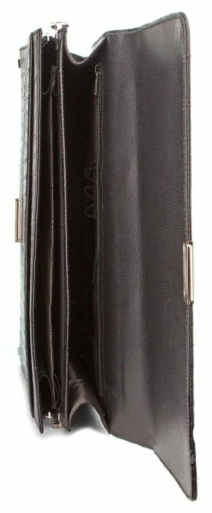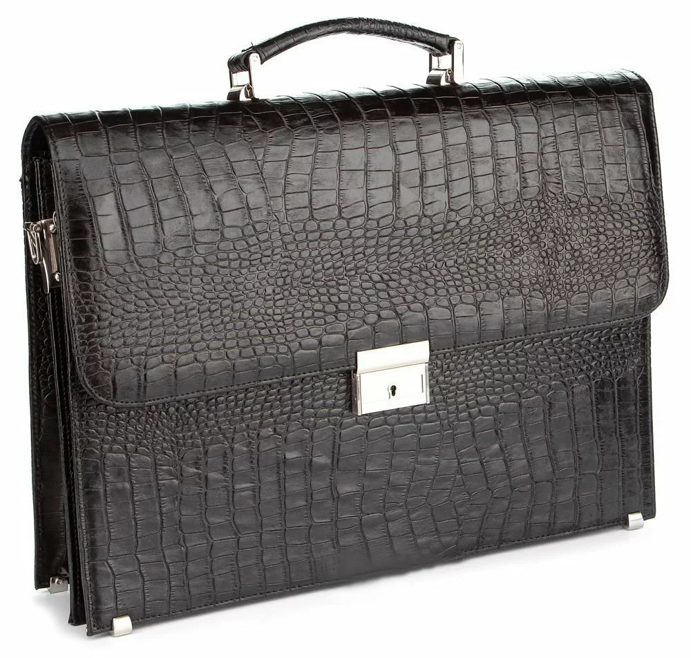 Большой, современный мужской портфель. Аксессуар выполнен из высококачественной натуральной кожи с фактурой под крокодила. На изделиях из такой кожи менее заметны царапины, которые могут появляться в процессе эксплуатации портфеля. Цвет фурнитуры: серебро. Аксессуар надежно упакован в прочный, текстильный, пылезащитный чехол.