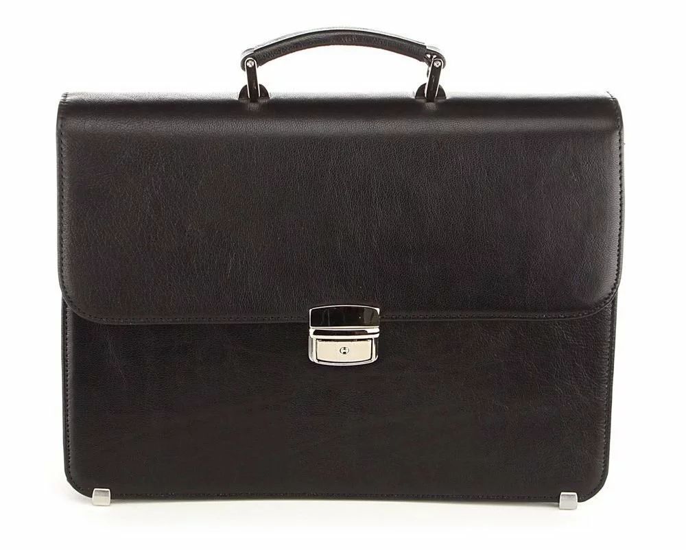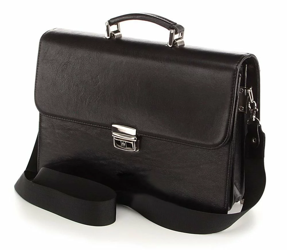Эксклюзивный кожаный мужской портфель черного цвета. Благодаря высокому качеству исполнения служить портфель будет долгие годы. Цвет фурнитуры: серебро. Портфель комплектуется удобным плечевым ремнем. Аксессуар надежно упакован в текстильный чехол черного цвета.