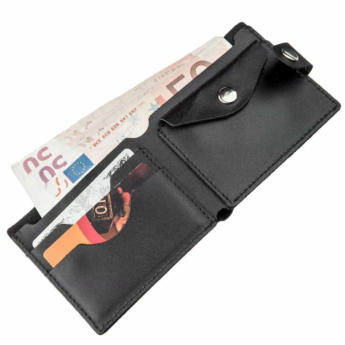 Закрывается на хлястик с кнопкой. Бумажник легко помещается в