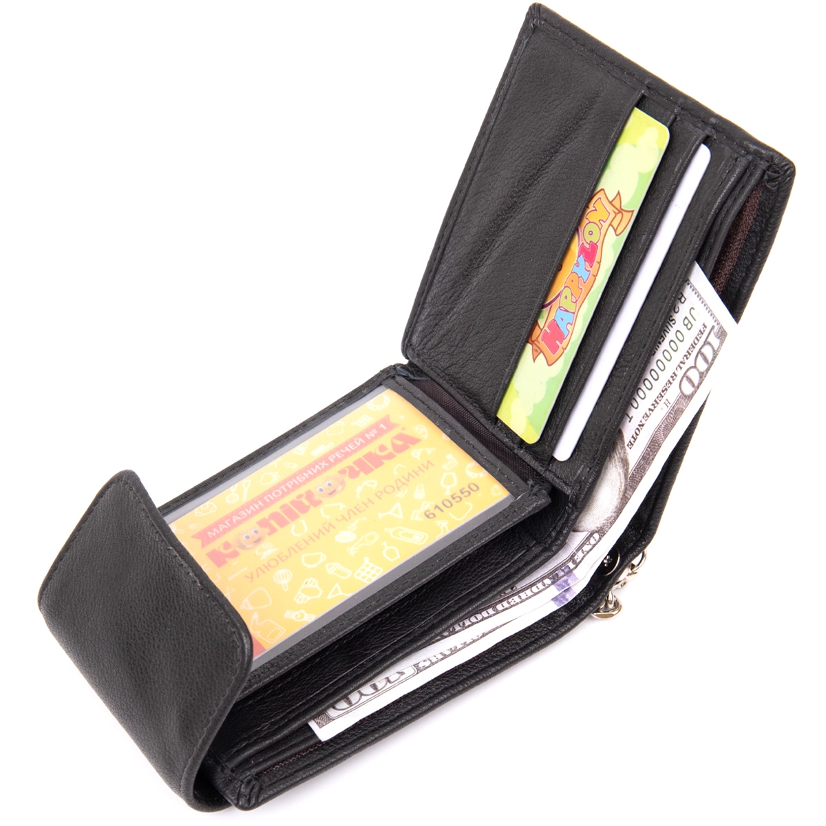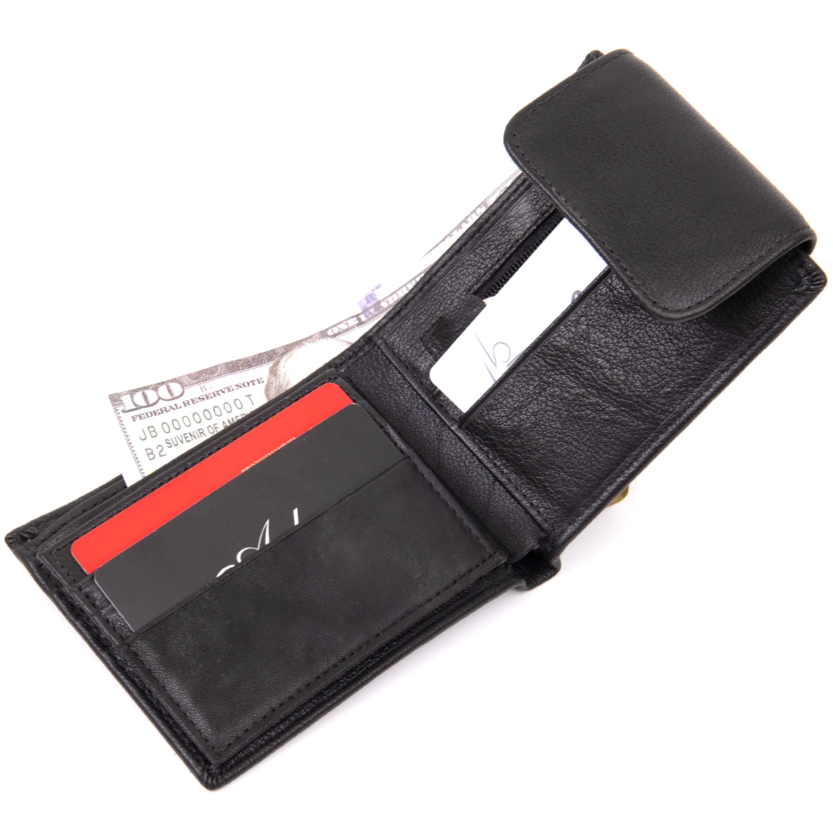 слотами для кредиток кармашком для монет и отделениями для купюр.