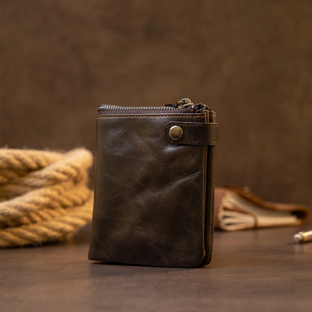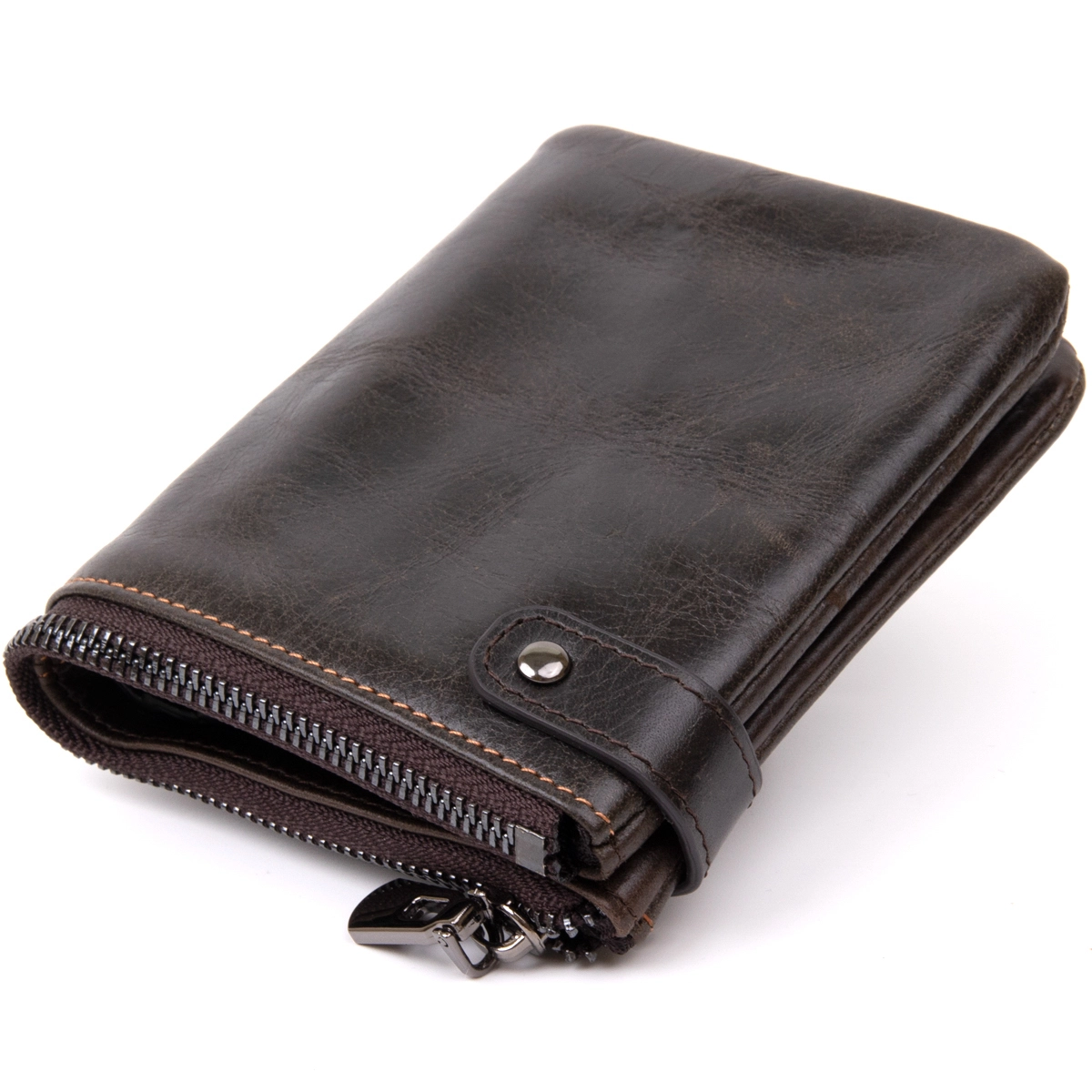 Тонкое компактное портомне из натуральной кожи с хлястиком на