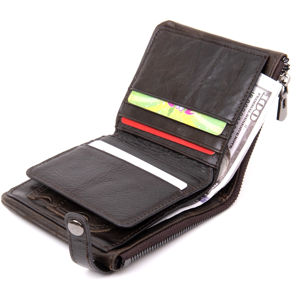 на молнии для купюр. Внутри достаточно ячеек для кредиток. Изделие