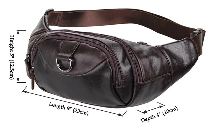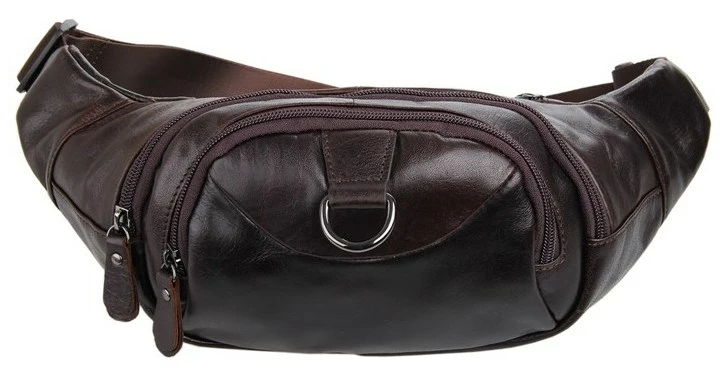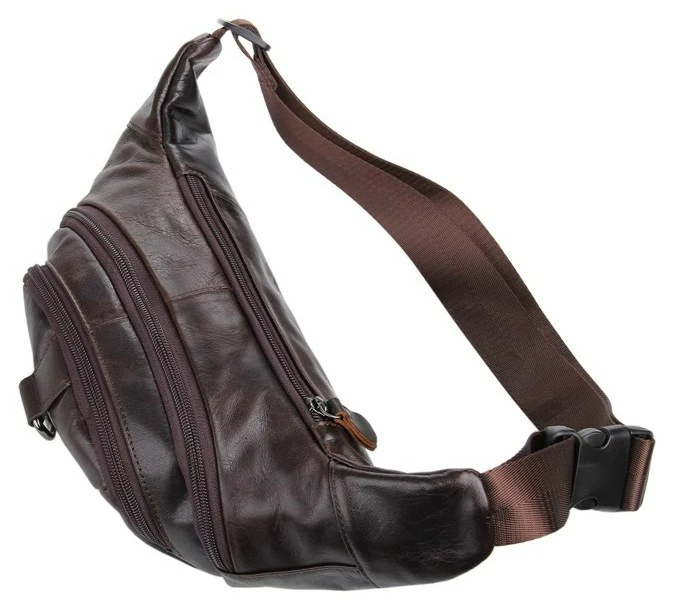 Великолепная кожаная поясная сумка коричневого цвета. Цвет фурнитуры: темное серебро. Сумка носится на поясе при помощи регулируемого поясного ремня. Аксессуар имеет 3 отделения на молнии. Во втором отделении находится потайной карман на молнии. Сумка надежно прошита прочной темно-коричневой нитью. Изделие упаковано в текстильный пылезащитный чехол белого цвета.