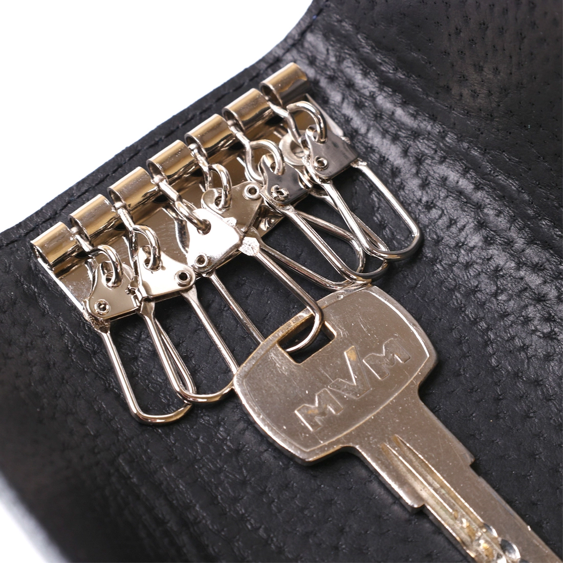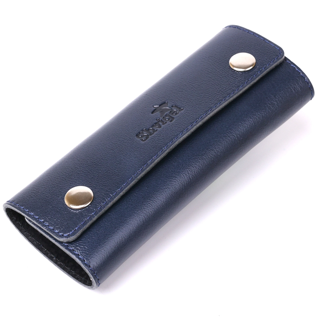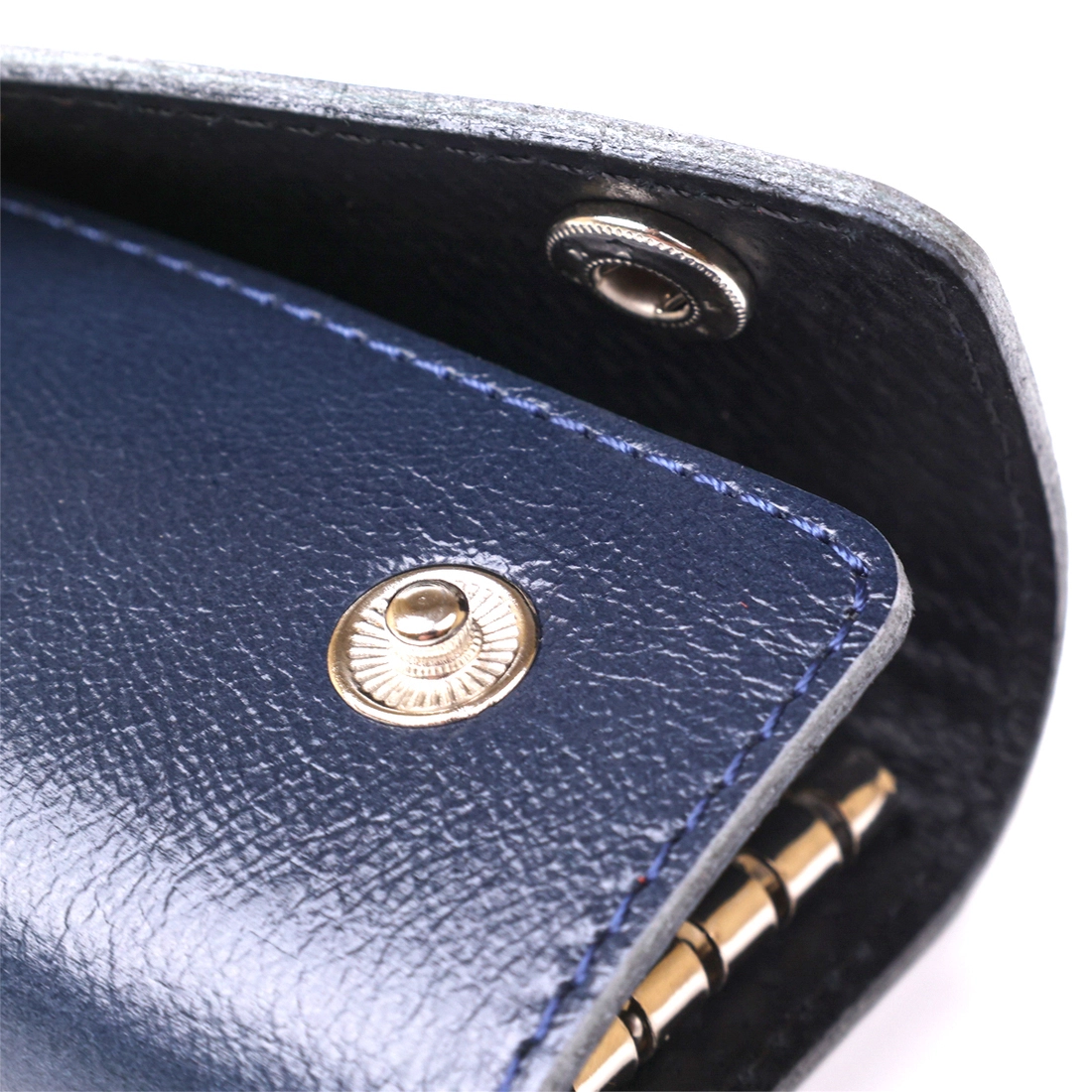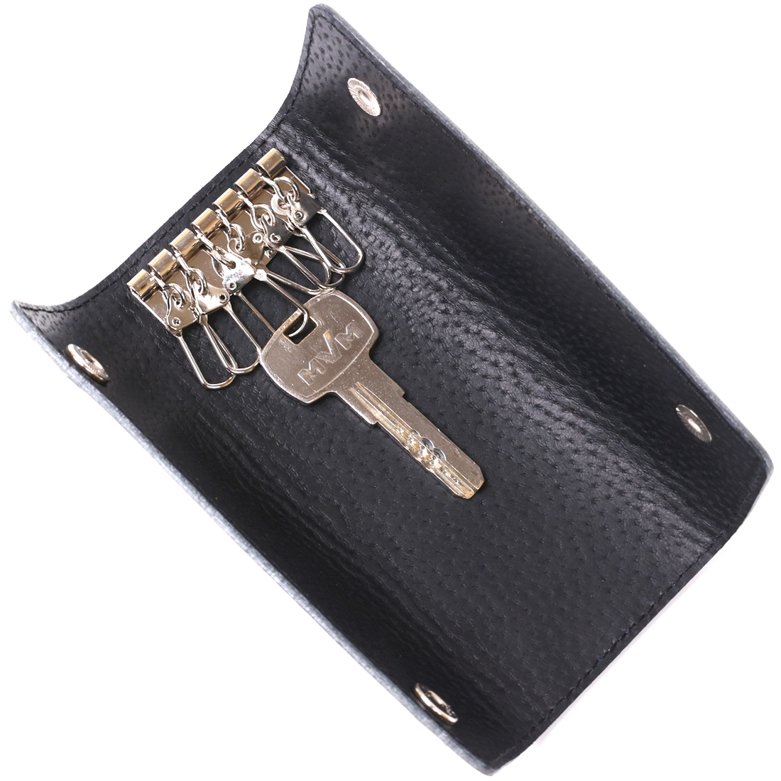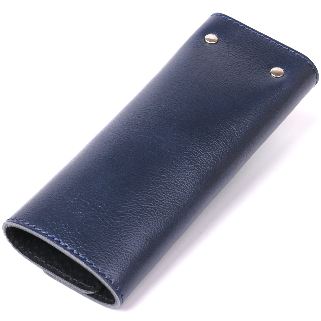 Отличная ключница из плотной натуральной кожи высокого качества с отменными показателями износостойкости. Аксессуар выполнен в темно-синем цвете и имеет гладкую приятную на ощупь фактуру. Внутри есть шесть небольших карабинов для крепления ключей. Закрывается изделие на две металлические кнопки.