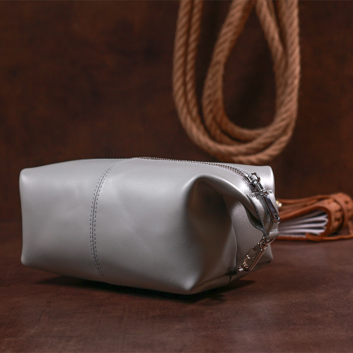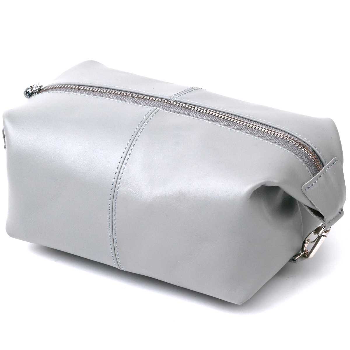 Добротная косметичка в практичном и строгом дизайне от украинского производителя. Выполнена данная модель из натуральной кожи высокого качества и улучшенной прочности. Аксессуар имеет модный и современный серый цвет и гладкую фактуру. Объем может быть увеличен с помощью карабинов, которые расположены по бокам изделия.