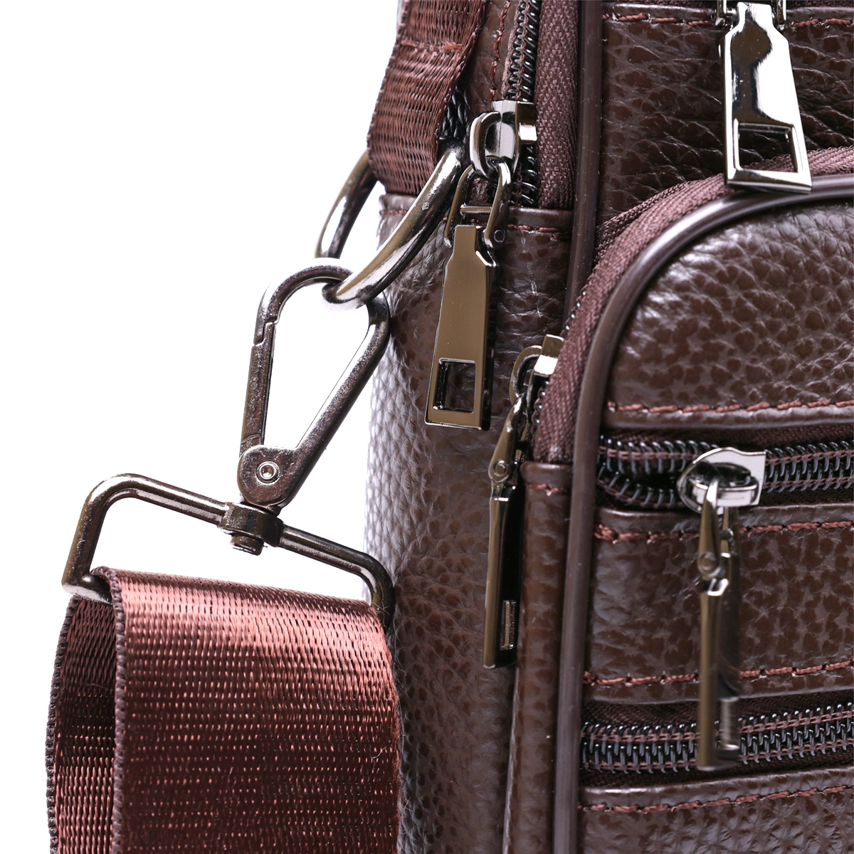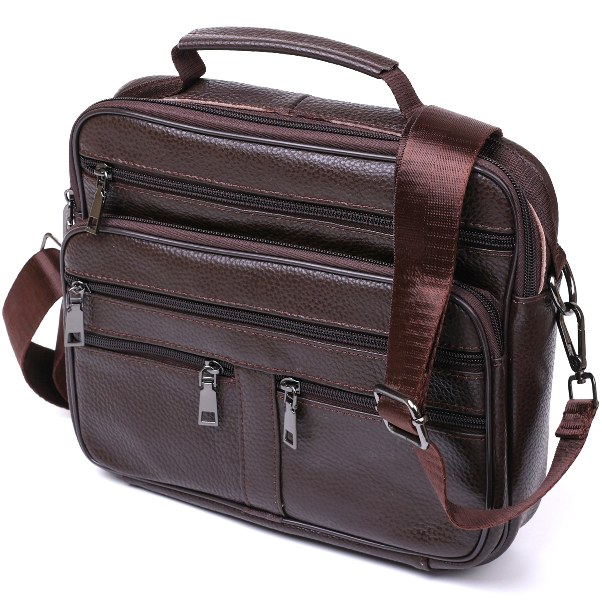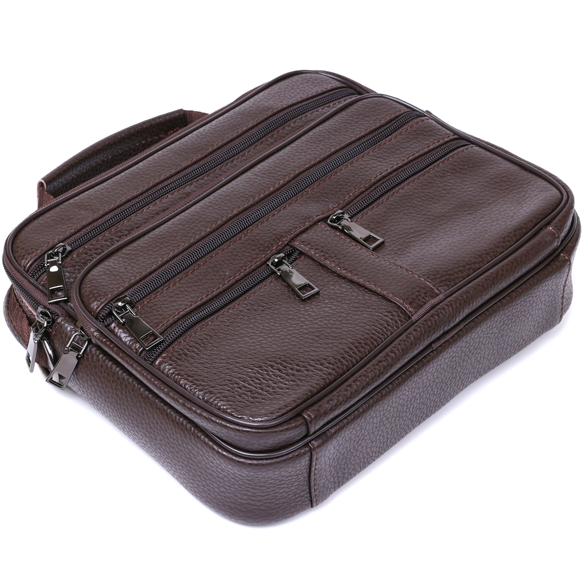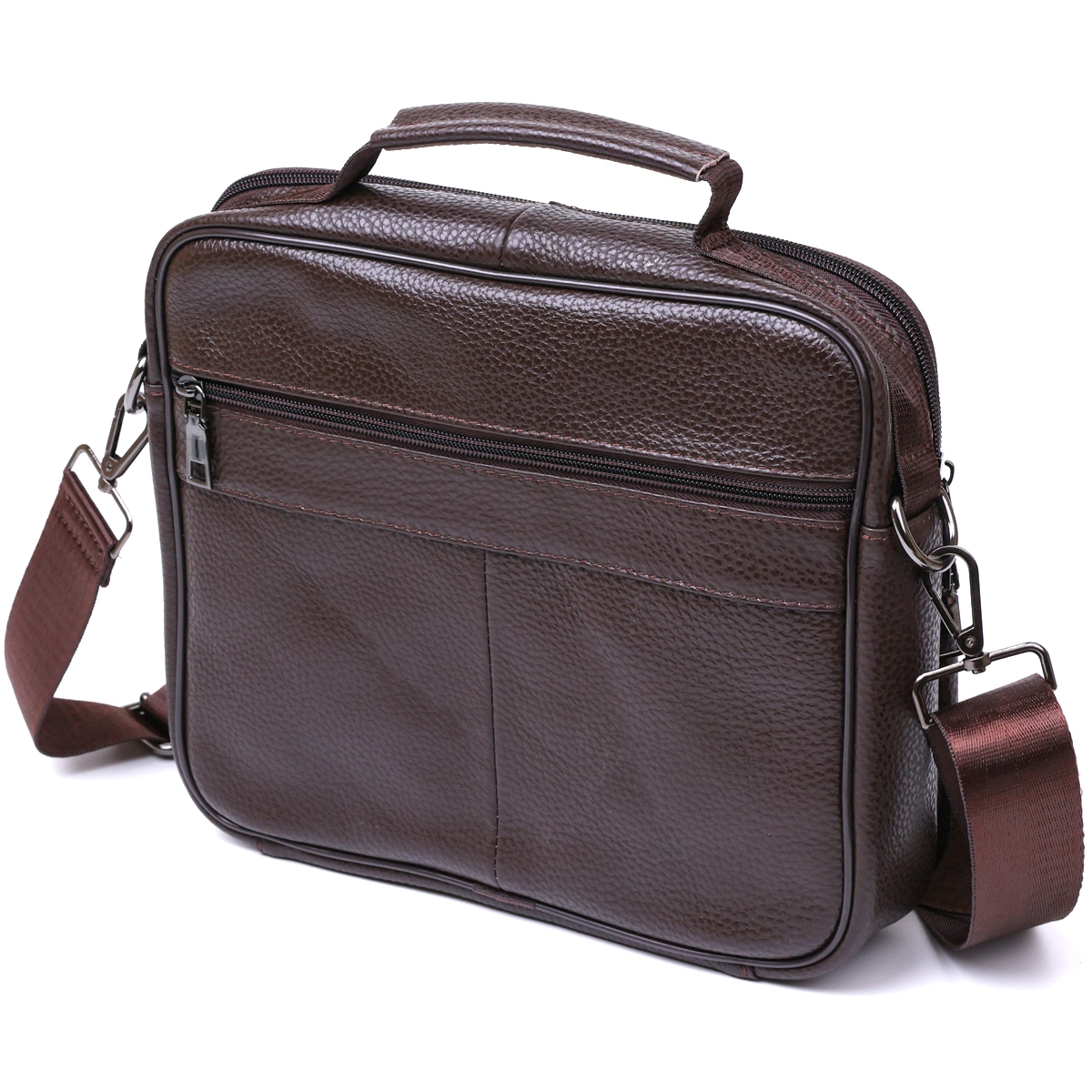 Практичная мужская сумка-органайзер из высококачественной натуральной кожи с высокими показателями прочности. Имеет просторное основное отделение и множество карманов разного размера. Данная модель отлично подойдет тем деловым людям, которые носят с собой много мелких вещей и пытаются их упорядочить. Цвет изделия – коричневый, фактура – зернистая.