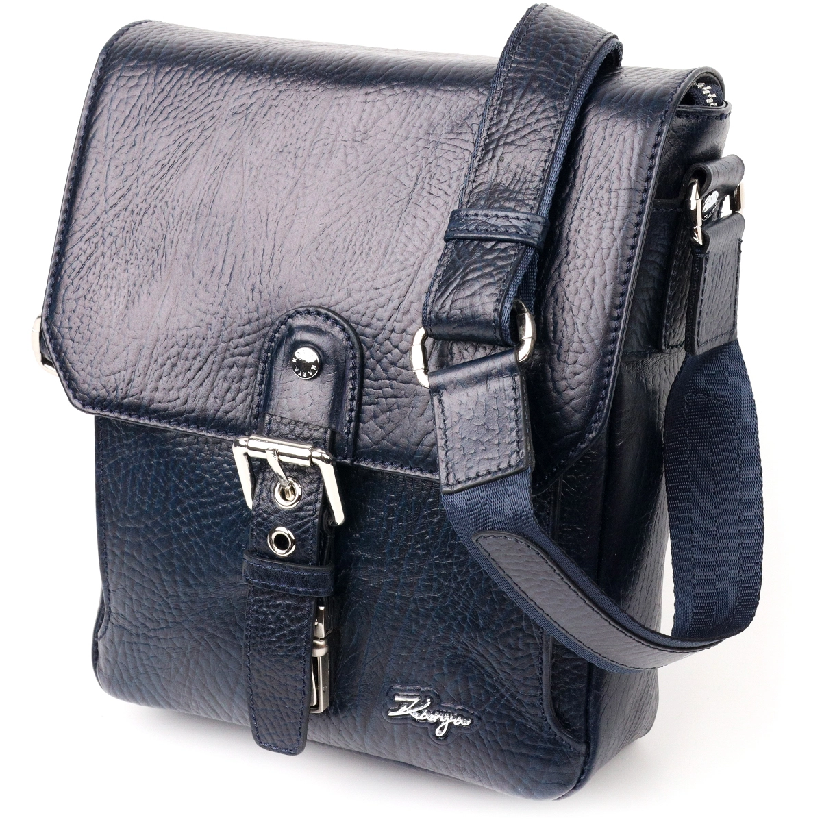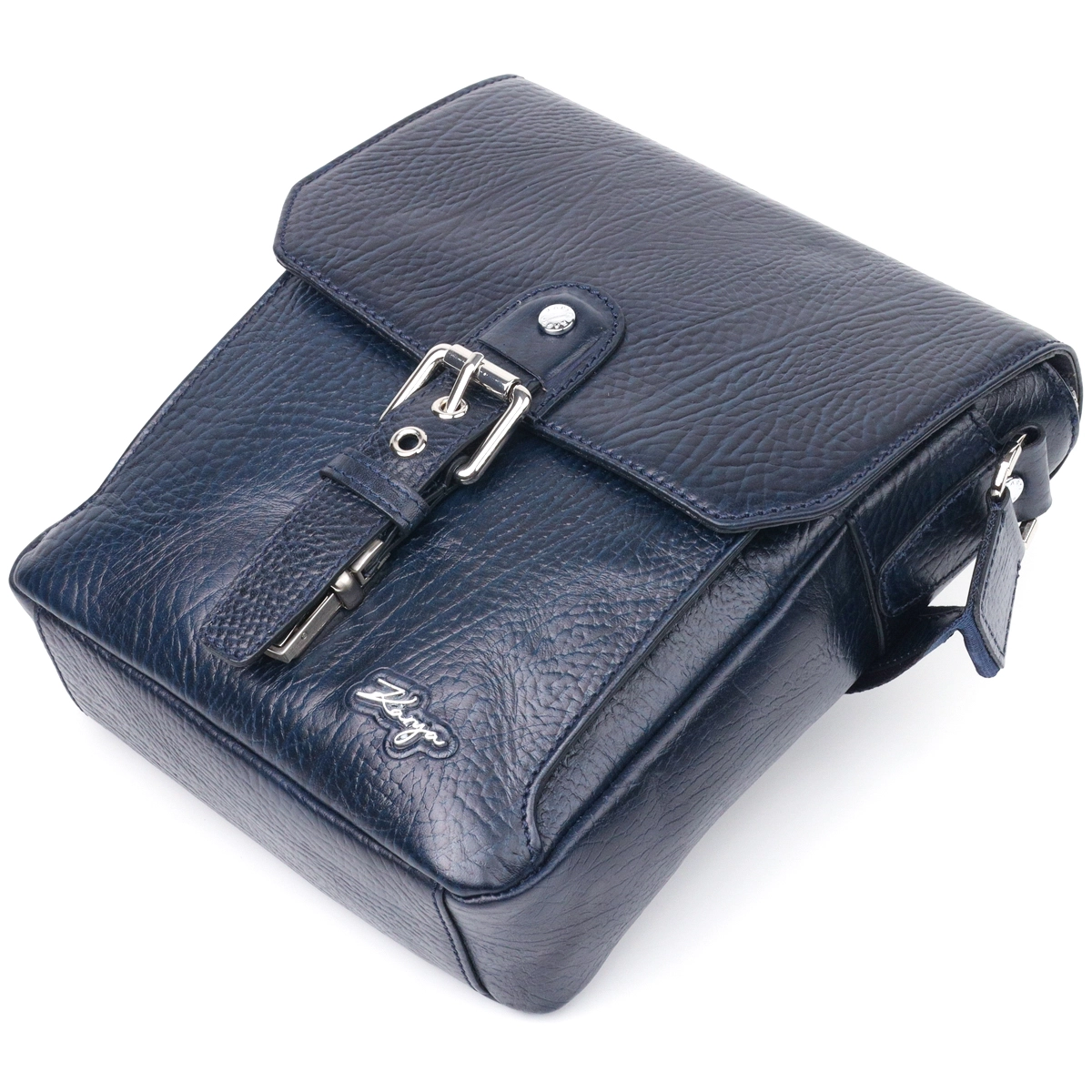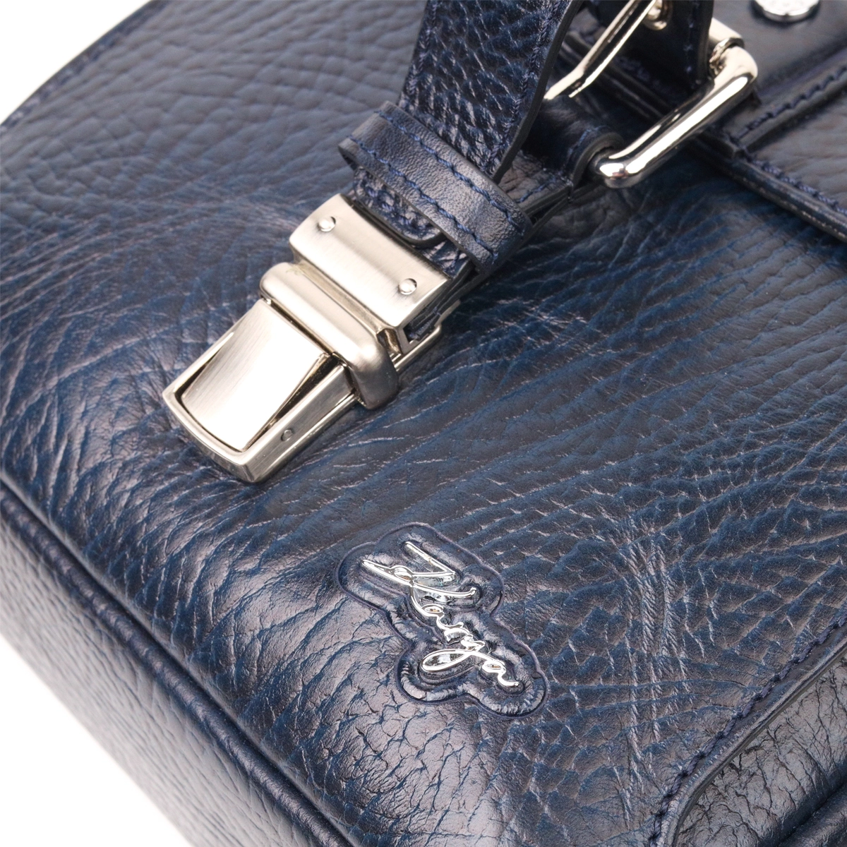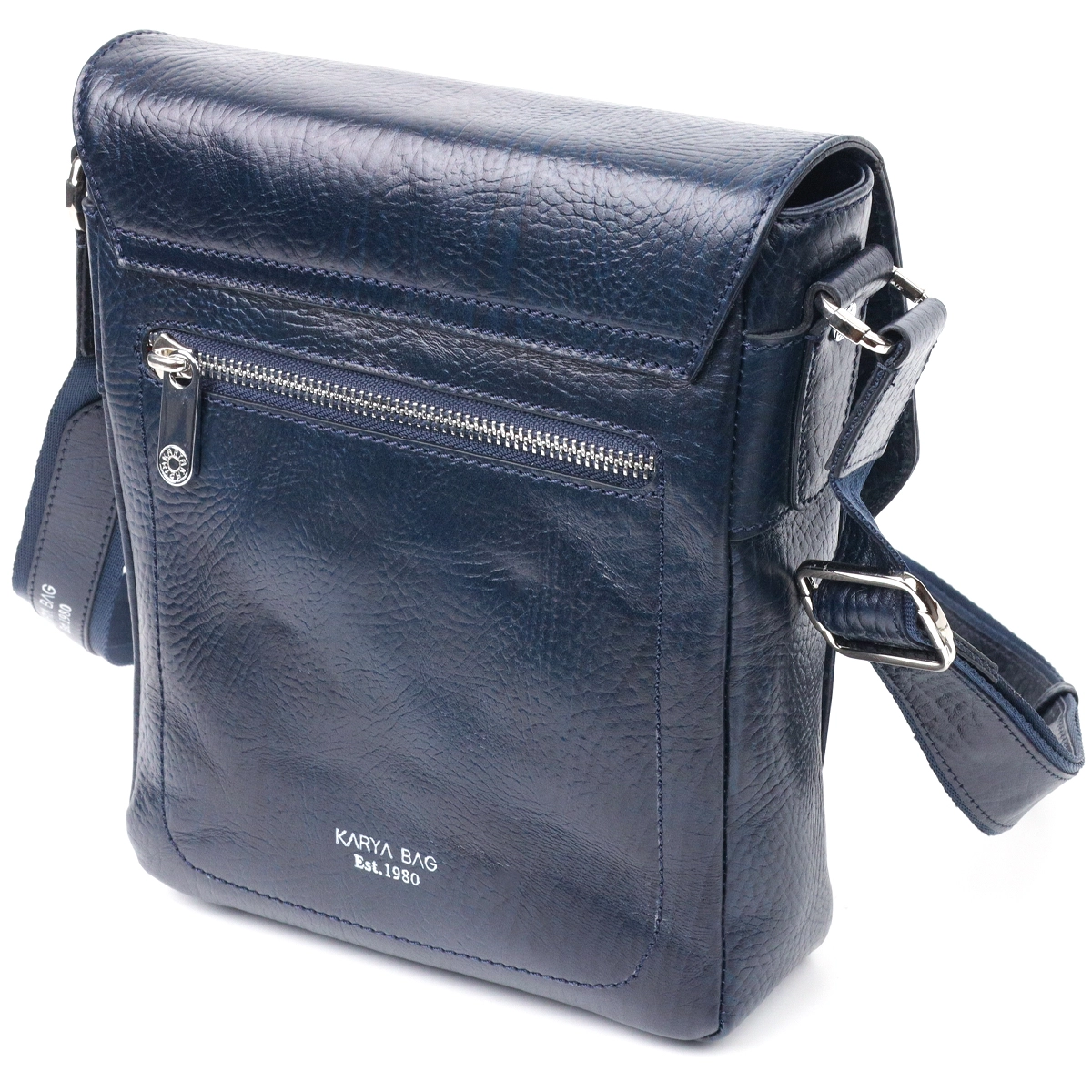 Мужская сумка синего цвета из натуральной зернистой кожи высокого качества. Аксессуар имеет надежную фурнитуру серебристого цвета и прочную подкладку. Изделие упаковано в фирменный текстильный мешок Karya. Качественная мужская сумка из натуральной кожи, всегда была отличным подарком для мужчины любого возраста.
