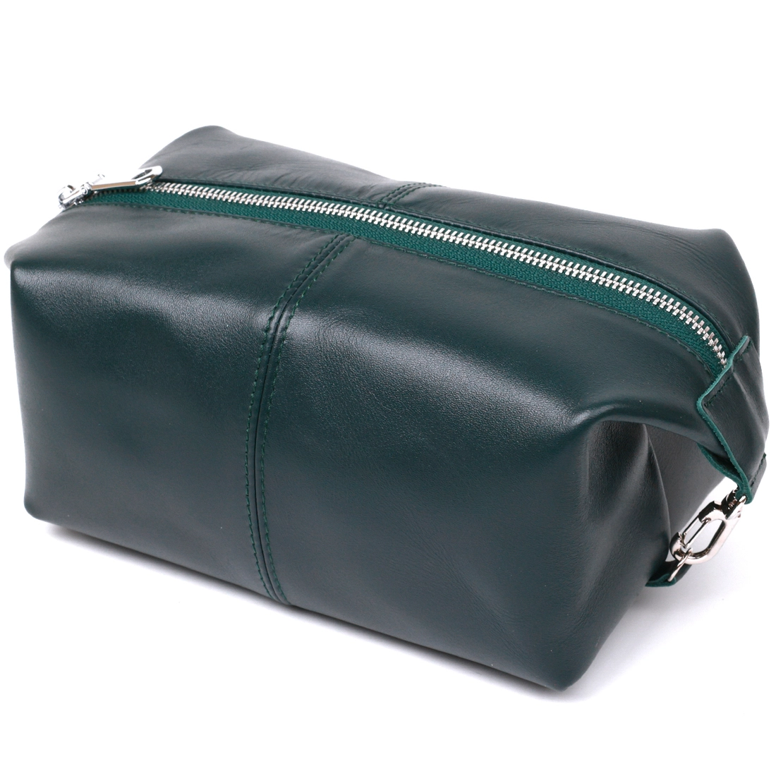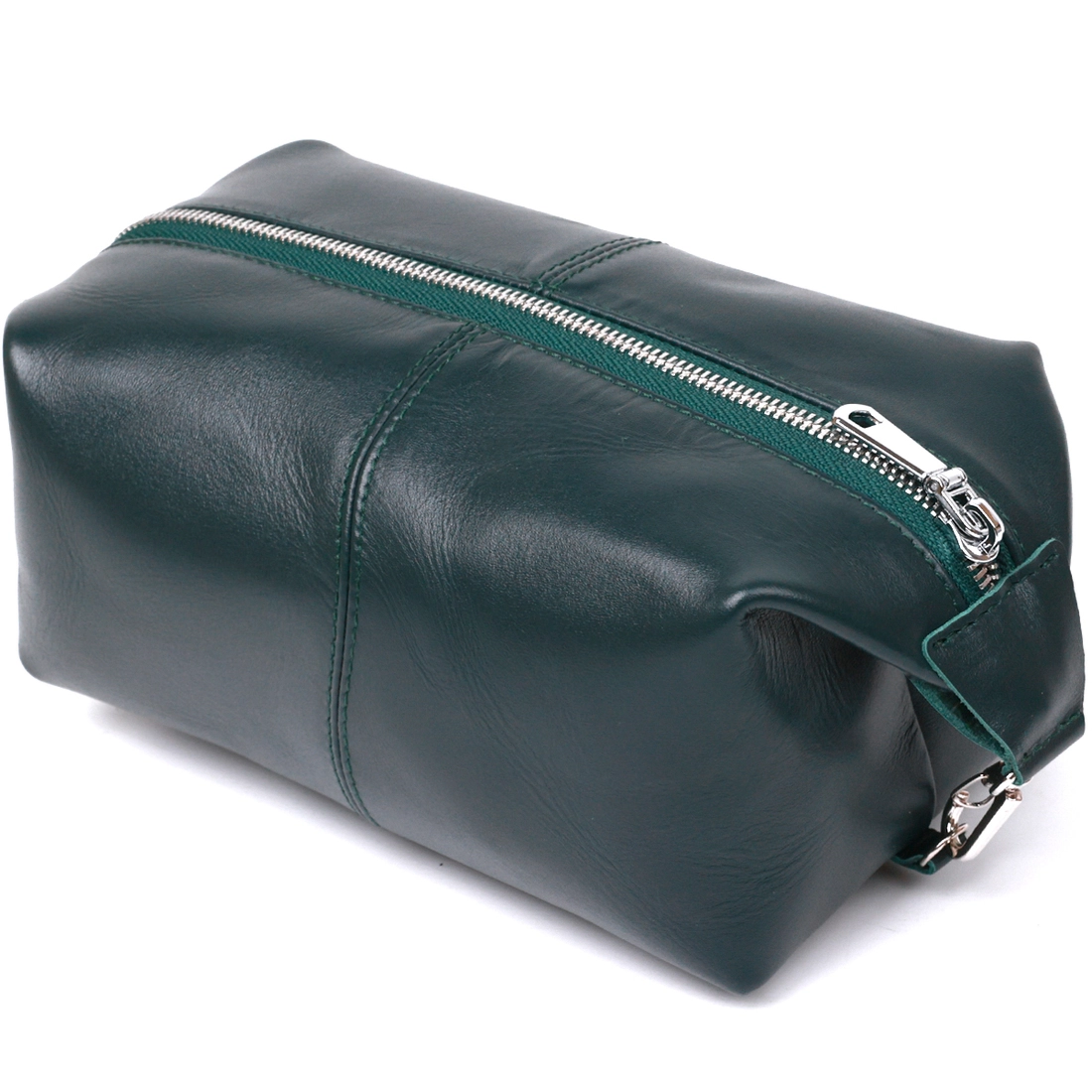 Универсальная косметичка для хранения ценных вещей, документов, косметики, что особенно актуально во время путешествий. Выполнена она из натуральной кожи высокого класса и улучшенной износостойкости. Изделие имеет красивый темно-зеленый цвет и гладкую приятную на ощупь фактуру. Такую косметичку можно смело дарить на любой праздник дорогому человеку.