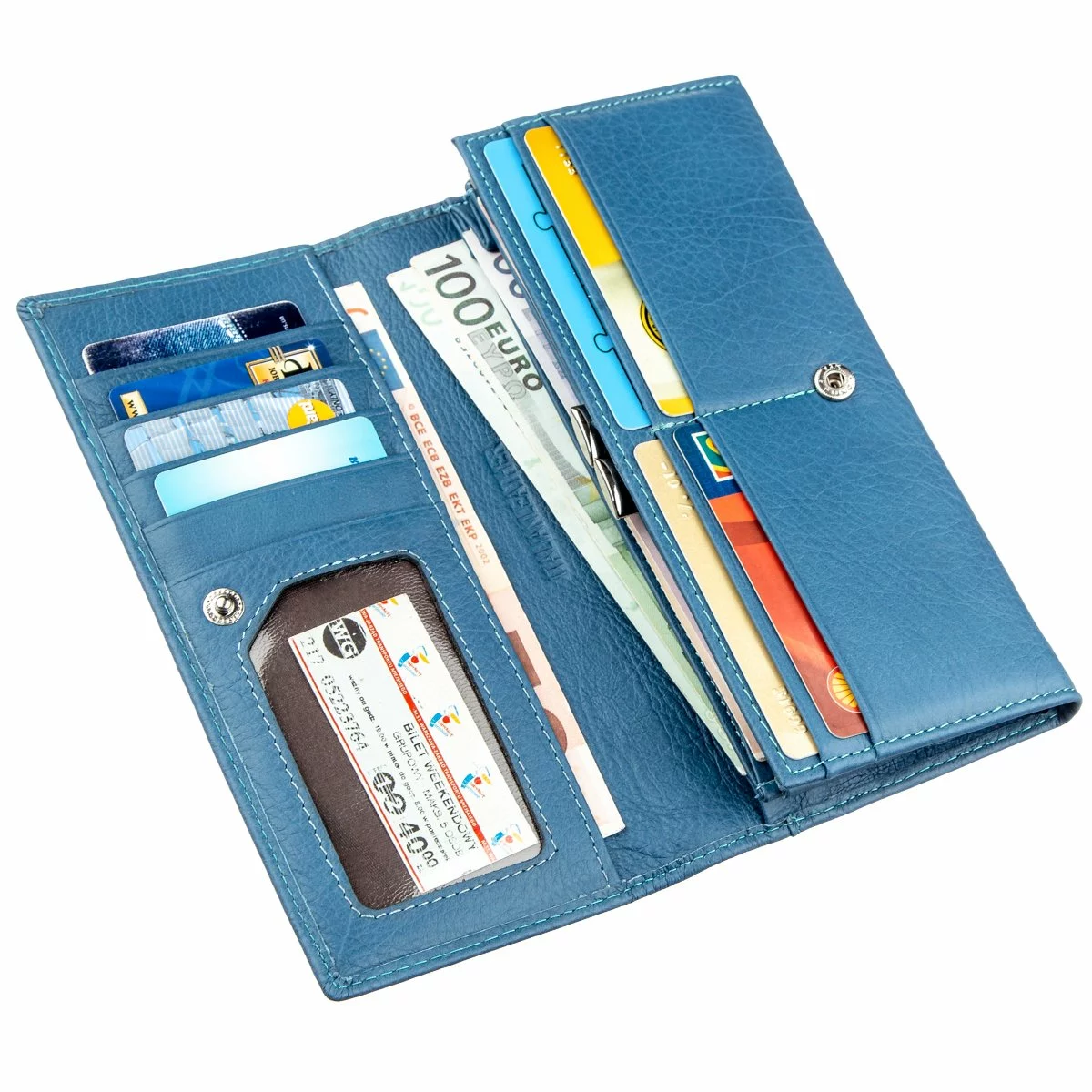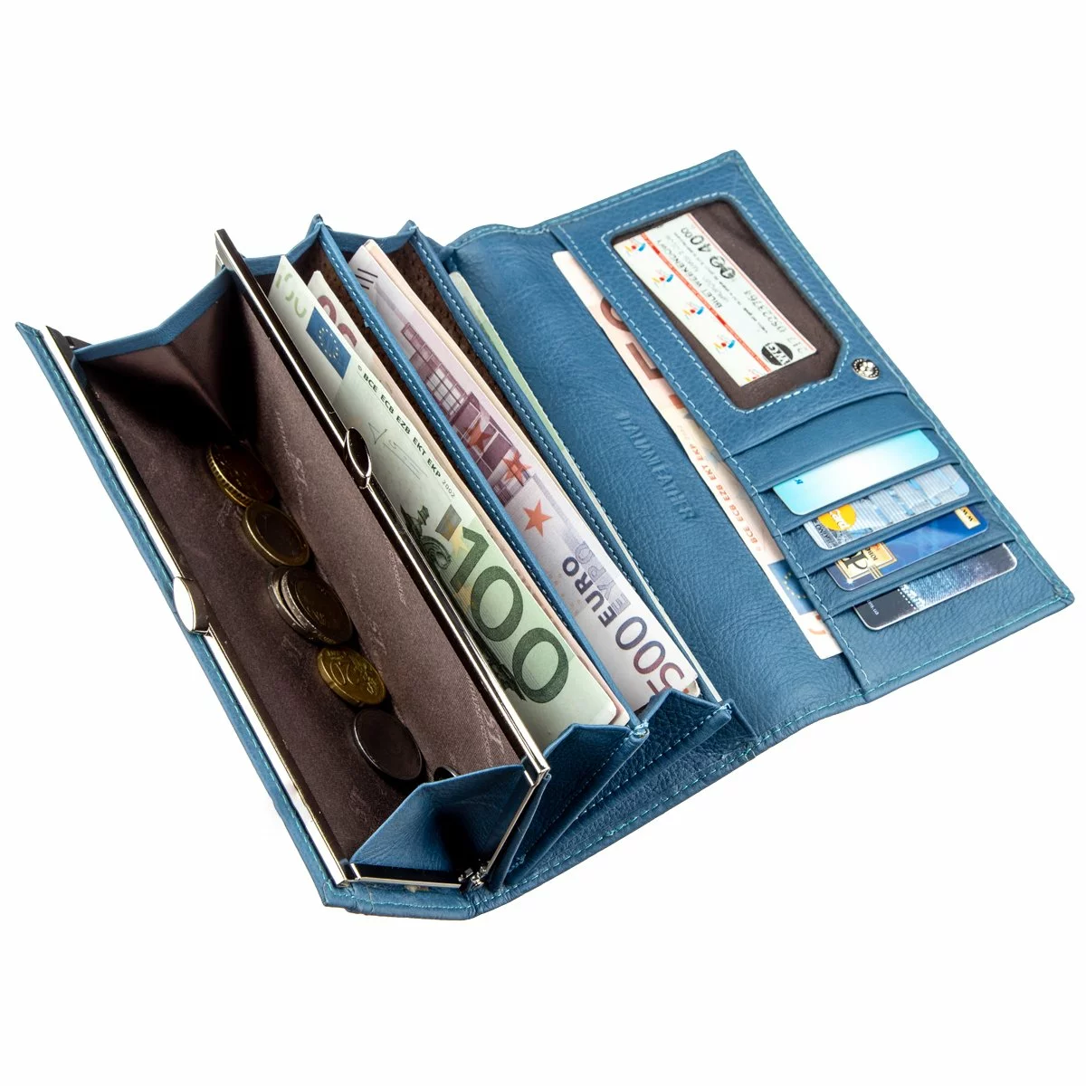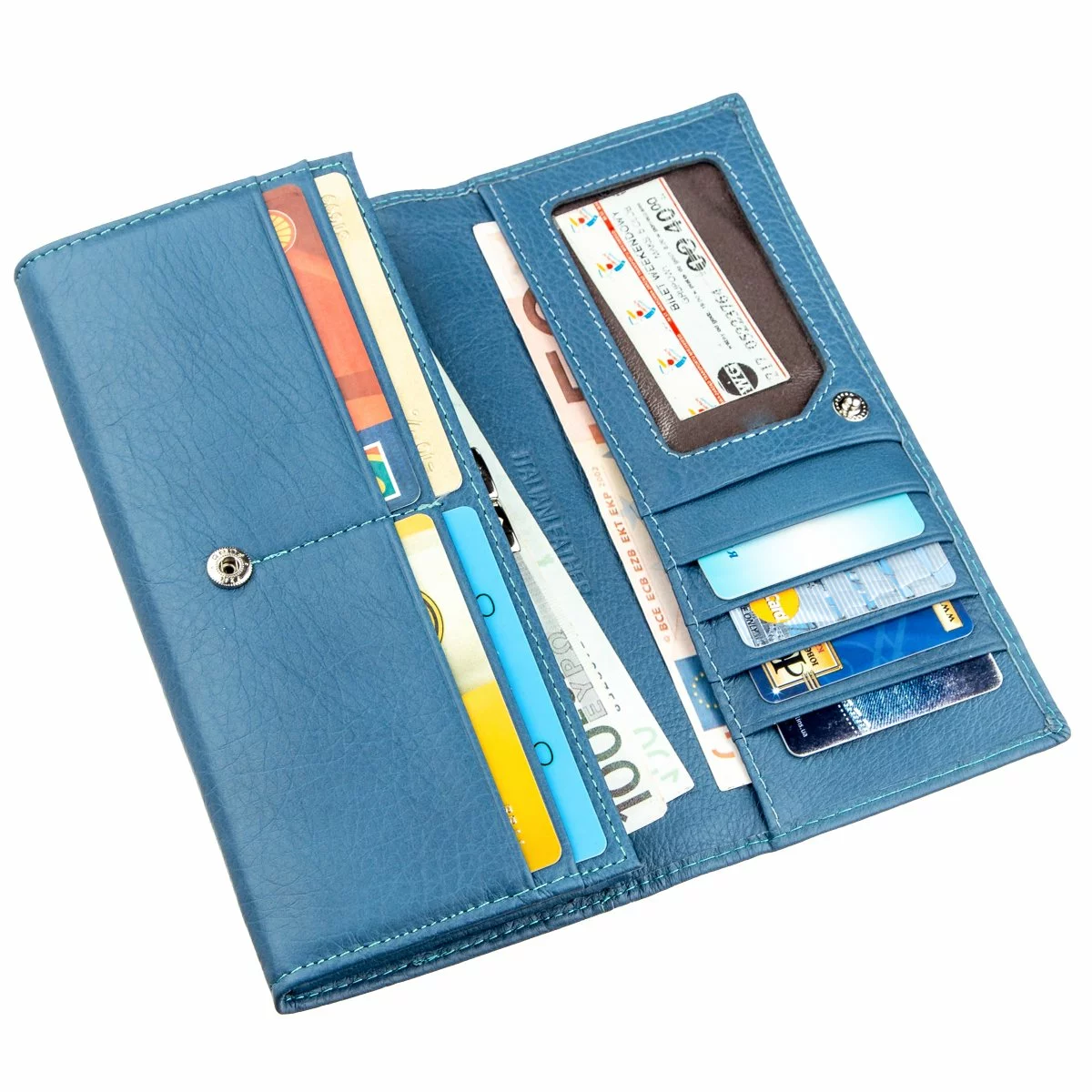Красивейший женский кошелек для изысканных и неповторимых дам. Имеет просто неотразимый освежающий голубой цвет, который всегда Вас будет радовать своей непосредственностью. Изготовлен аксессуар из добротной натуральной кожи с зернистой фактурой. Внутри есть отделения и карманы для купюр и банкнот, монет и прочей мелочи, документов и всяческий карточек и визиток. Следует отметить, что закрывается кошелек на практичную металлическую кнопку, что легко и удобно! Такой аксессуар мечтает получить в подарок любая женщина, независимо от возраста и положения. Упаковка представлена в виде плотной картонной коробки белого цвета с фирменным логотипом.