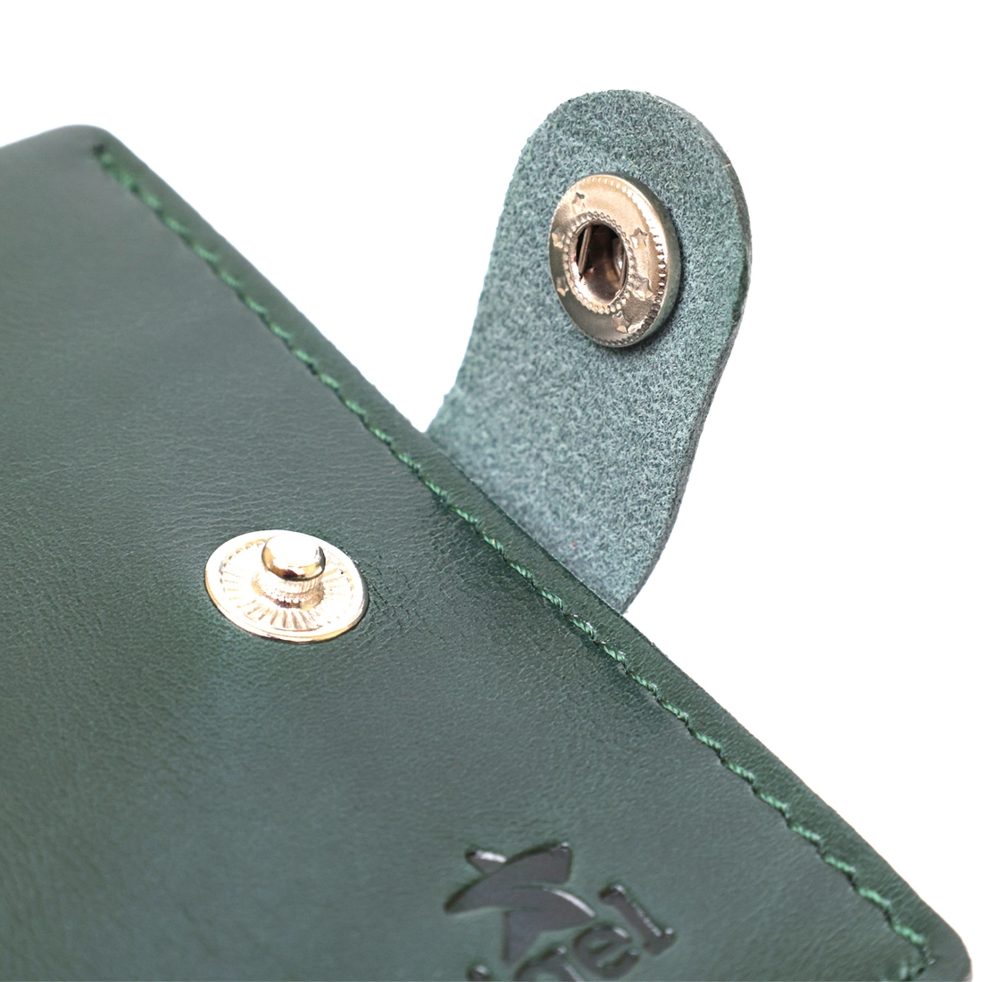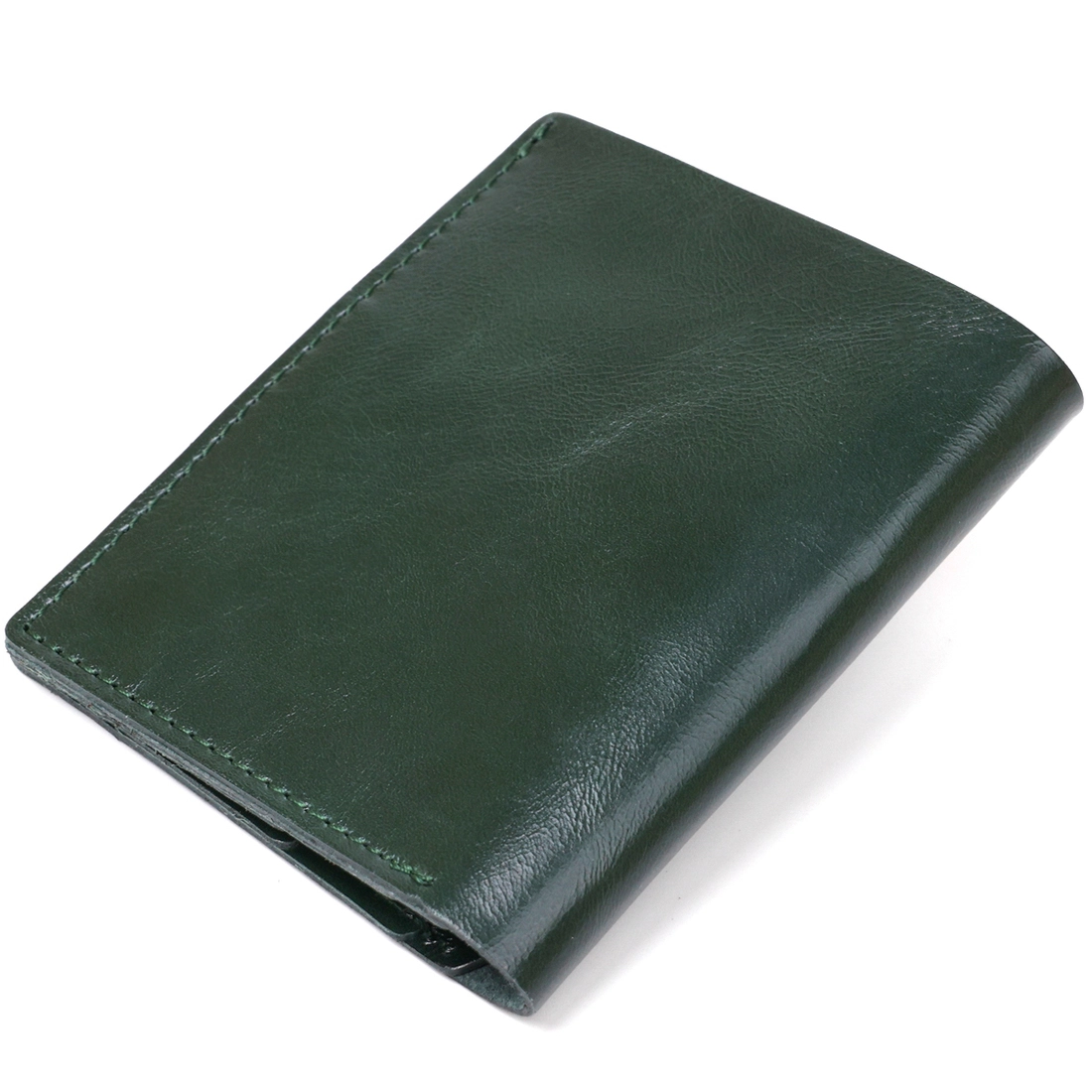 Стильное портмоне в два слоения для ценителей строгого и лаконичного дизайна. Изготовлено оно из натуральной кожи с улучшенными показателями прочности и износостойкости. Цвет изделия – темно-зеленый с отливом, фактура – гладкая и приятная на ощупь. Внутри есть отделение для купюр и несколько слотов для визитных и кредитных карточек.