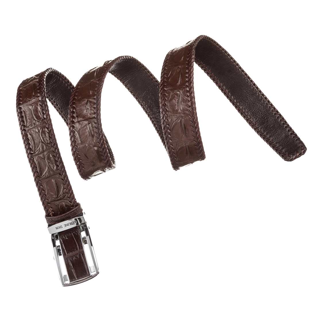 Стильный ремень из натуральной кожи крокодила. Аксессуар изготовлен на основании из гладкой телячьей кожи, в качестве дополнительной отделки по внешнему краю аксессуара сделана оплетка из гладкой кожи под цвет ремня. Изделие оборудовано съемной автоматической пряжкой, которая декорированная вставкой, из натуральной кожи крокодила. Изделия из кожи крокодила всегда считались большой роскошью, так как в мире не так уж много компаний, которые занимаются выделкой такой кожи, поскольку этот процесс действительно чрезвычайно трудоемкий. Идеальный подарок для людей, которые любят все дорогое и качественное. Ремень универсальный, его можно носить как под джинсы, так и под брюки. Каждое полотно имеет уникальный, не повторяющийся узор, поэтому, покупая ремень из кожи крокодила, вы можете быть полностью уверенны в том, что второго такого ремня нет в природе.