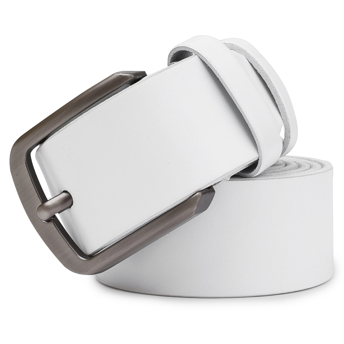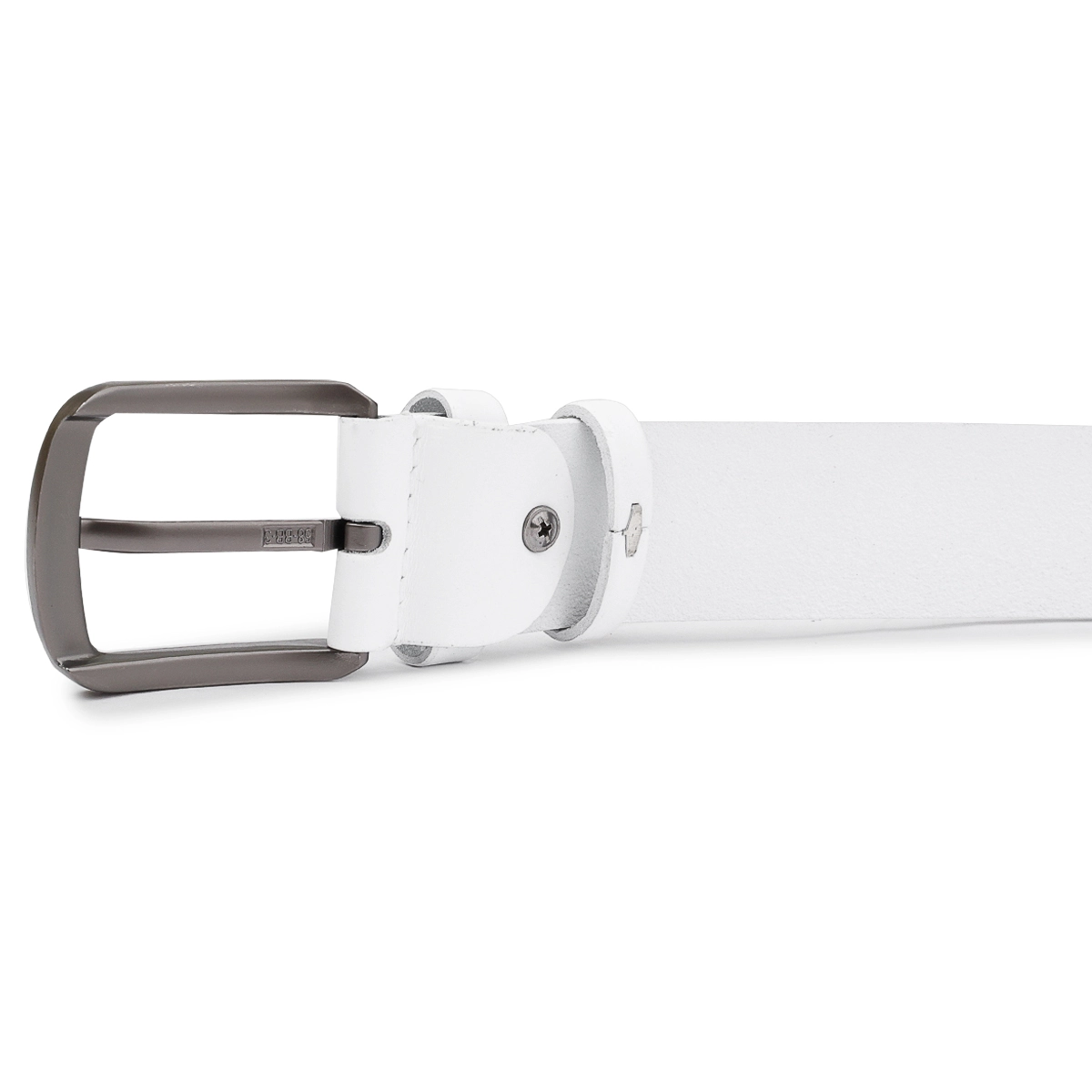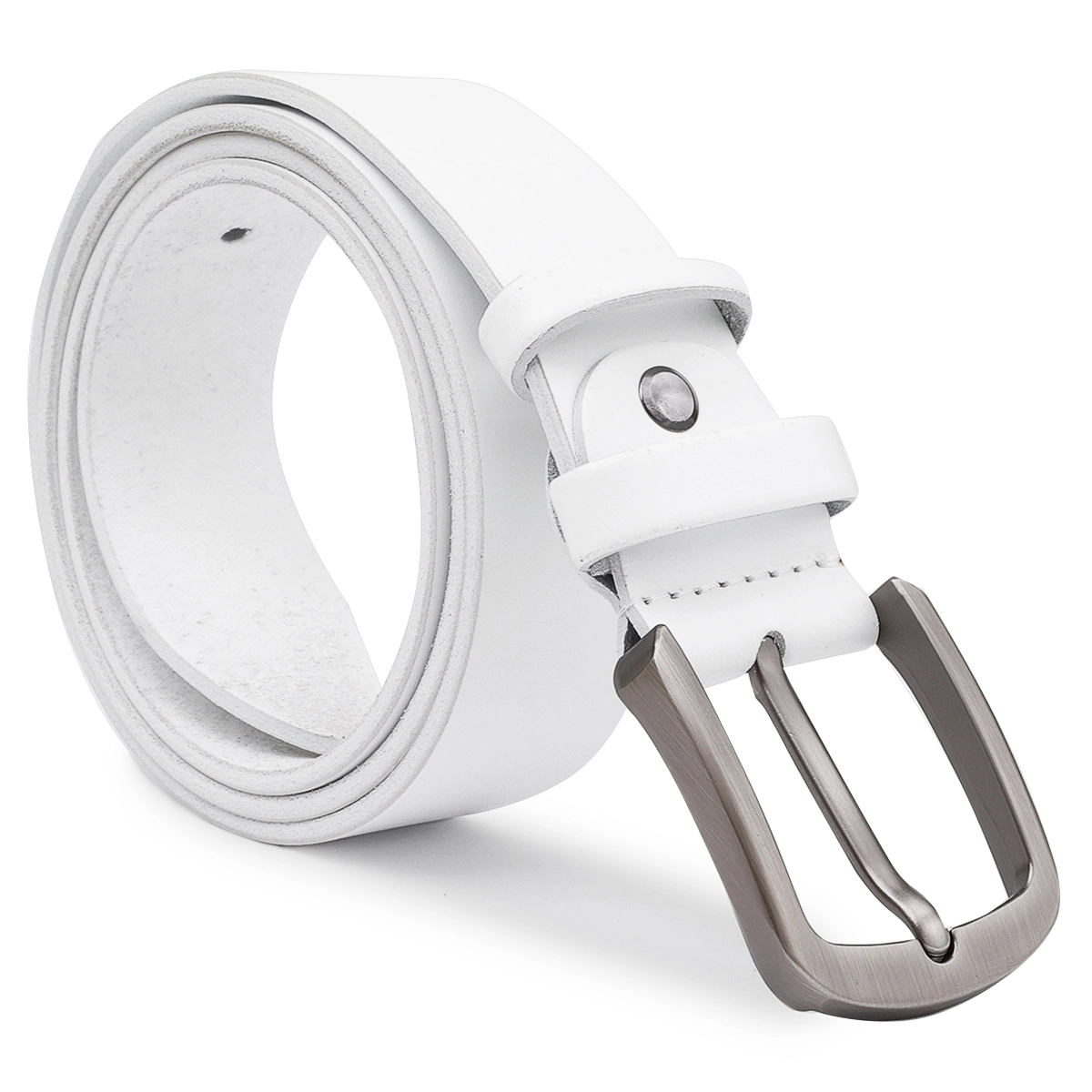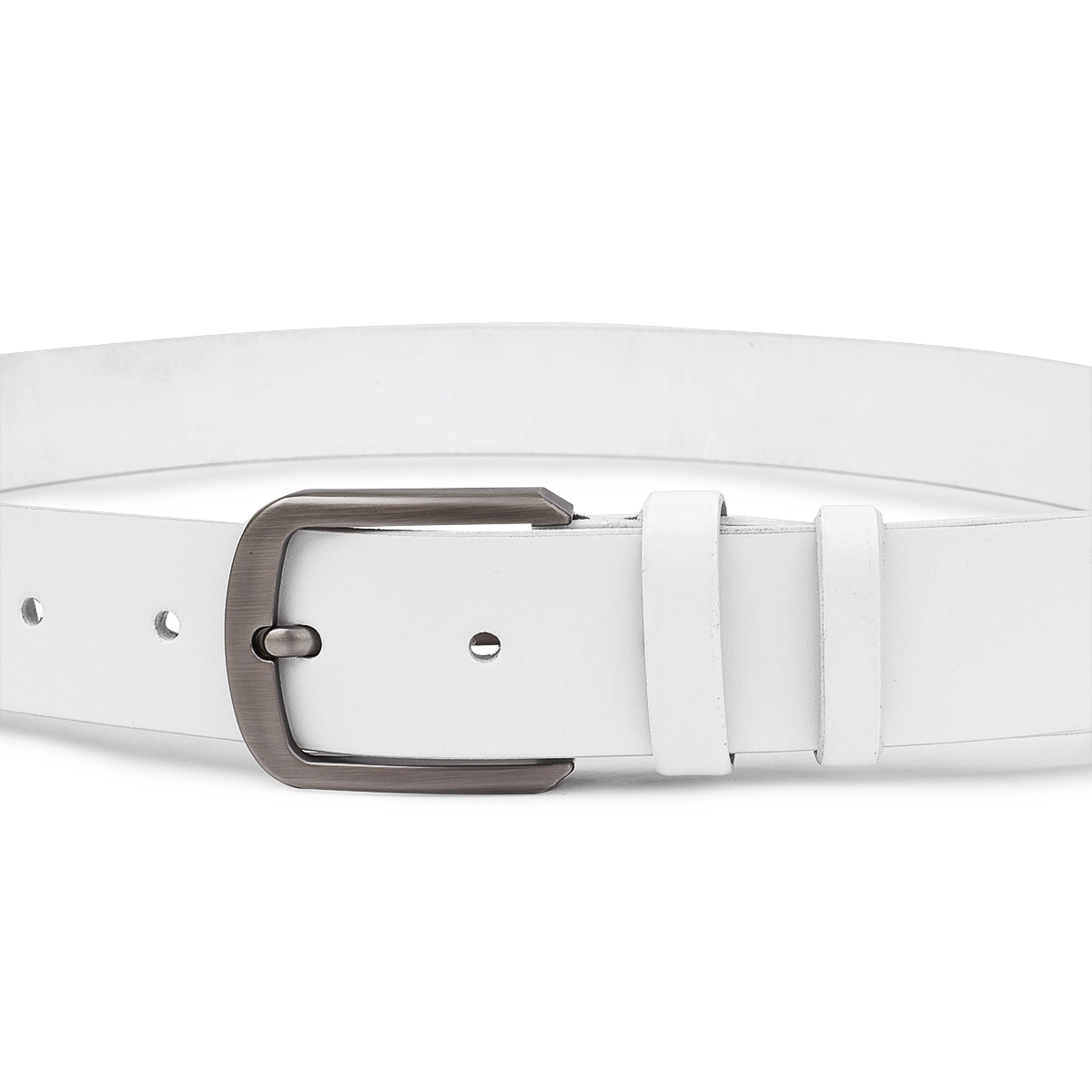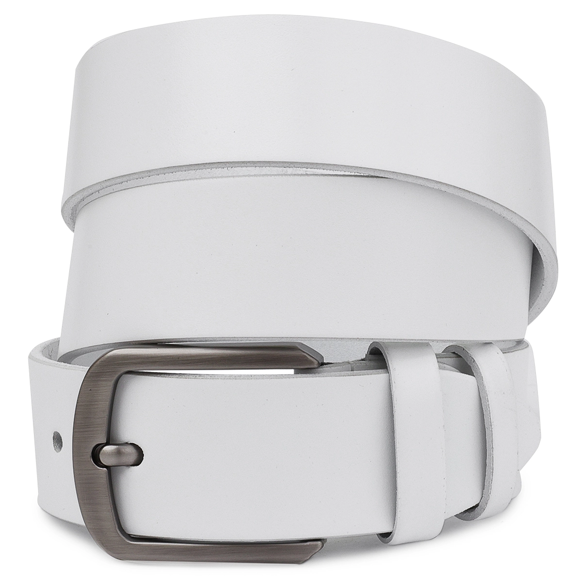 Замечательный ремень унисекс от украинского производителя с высоким качеством исполнения и материалов. Выполнен из натуральной высокопрочной кожи высшего класса. Имеет универсальный белый цвет, гладкую фактуру и классическую пряжку, которая удобна и надежная в применении.