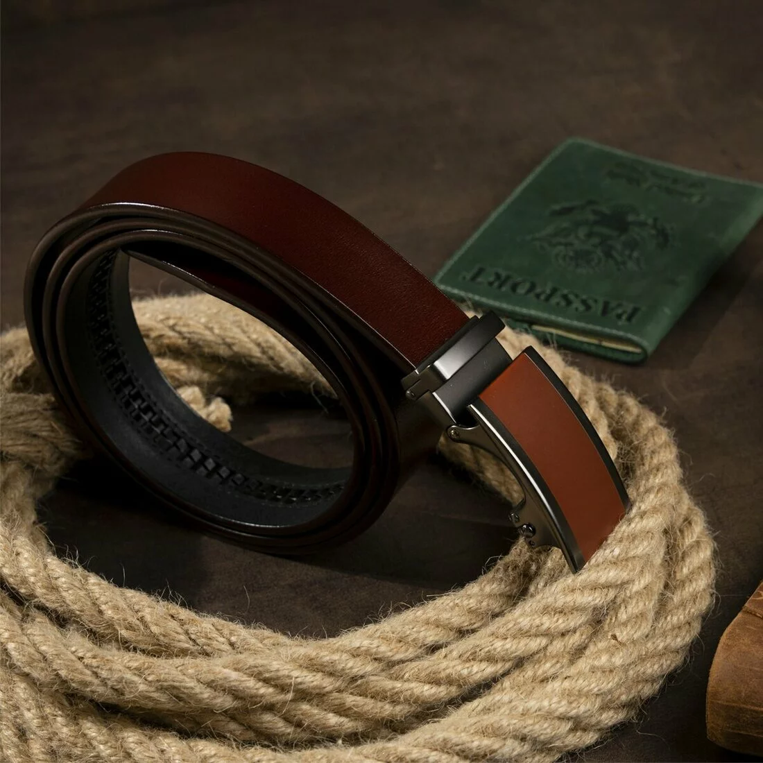 Стильный мужской ремень из натуральной кожи. Насыщенный коричневый