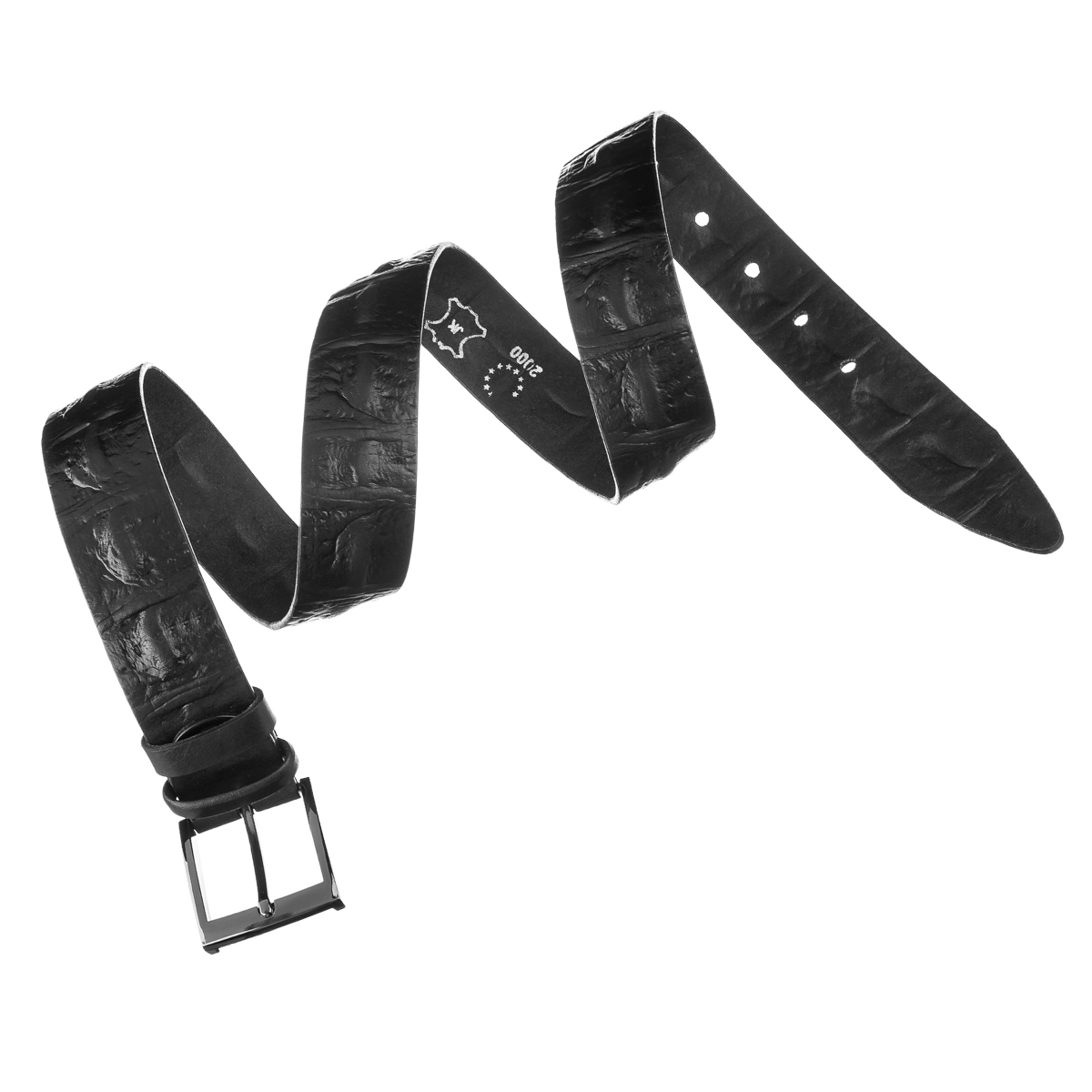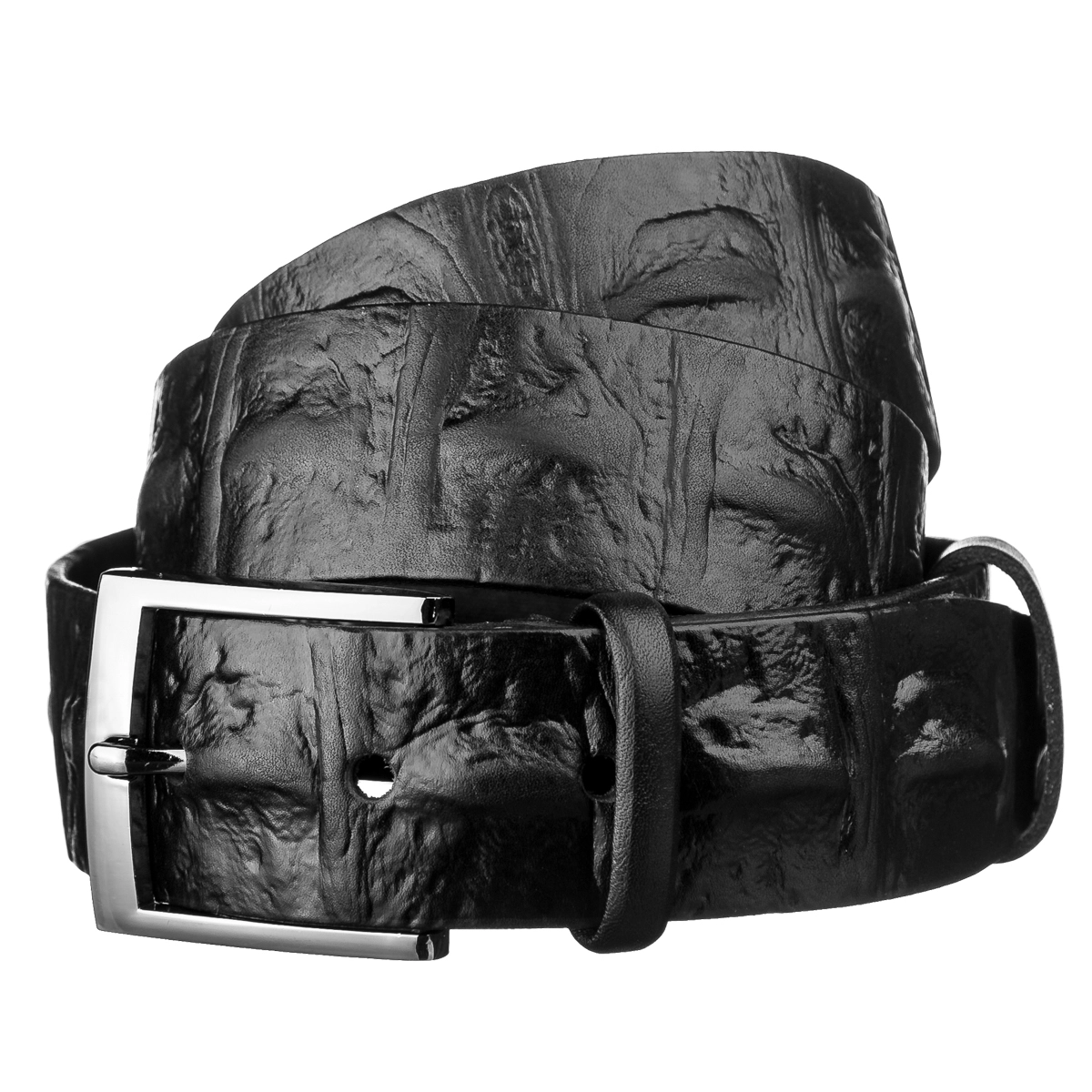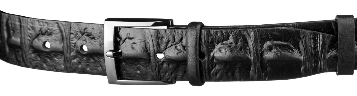 Надежный джинсовый ремень из цельной высококачественной кожи, с фактурой под крокодила. Производитель, использует исключительно качественную фурнитуру, которая не темнеет, не царапается и не вызывает аллергии. Цвет фурнитуры: темное серебро. Отличный вариант для подарка для дорогих и любимых мужчин. Выбрав этот аксессуар, вы непременно останетесь довольны своей покупкой.