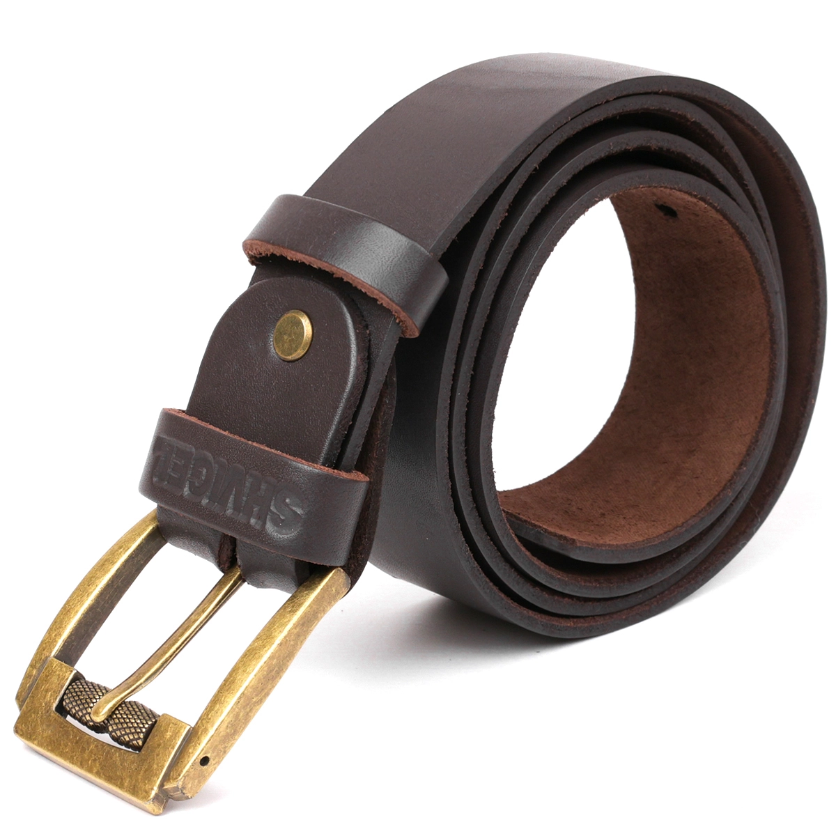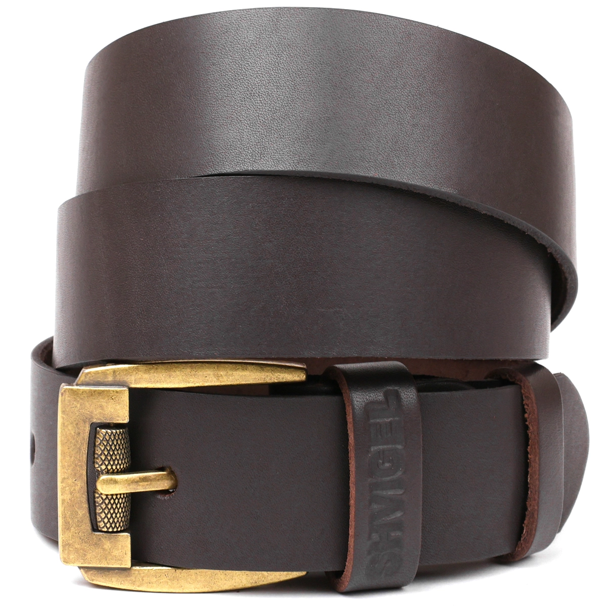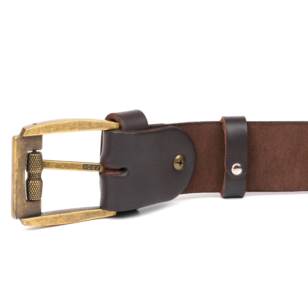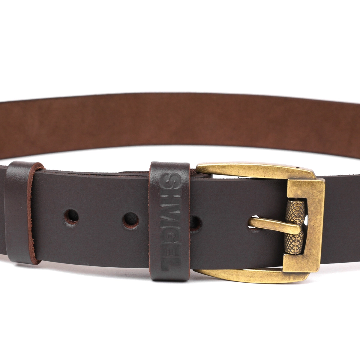 Стильный ремень из цельного полотна кожи. Имеет приятный коричневый цвет с легким блеском. Ремень оснащен красивой, добротной пряжкой желтого цвета. Ремень прекрасно подойдет под джинсы. Качество ремня потрясающее, оно не оставит равнодушнім любого мужчину. Такой ремень не стыдно подарить директору или солидному деловому мужчине.