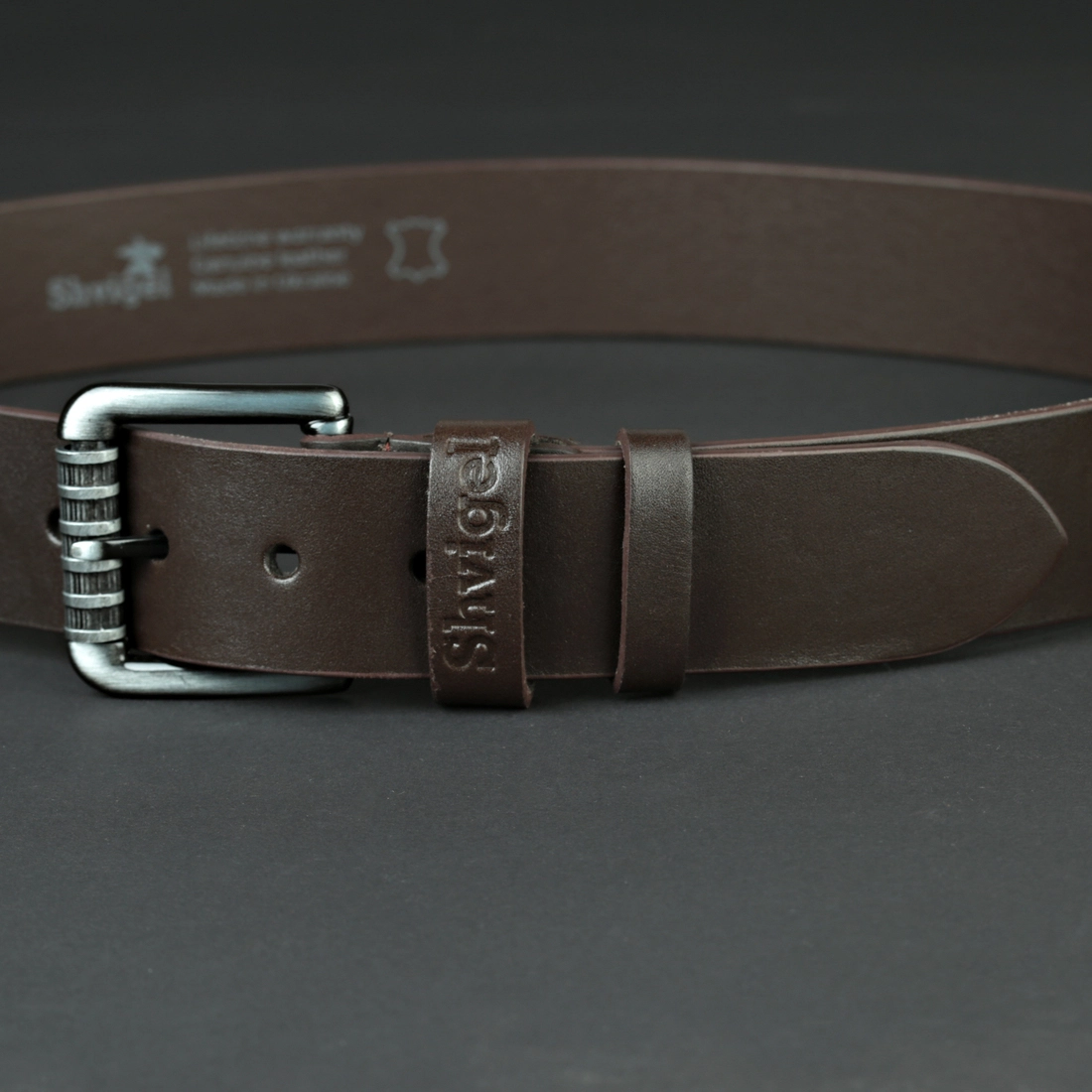 Изготовлен ремень из очень прочной натуральной кожи, которая