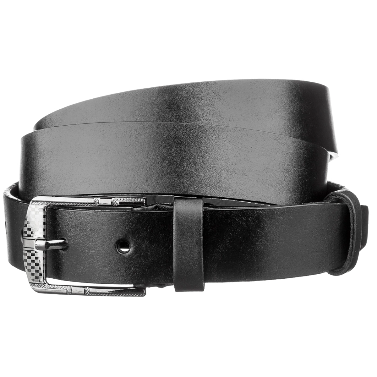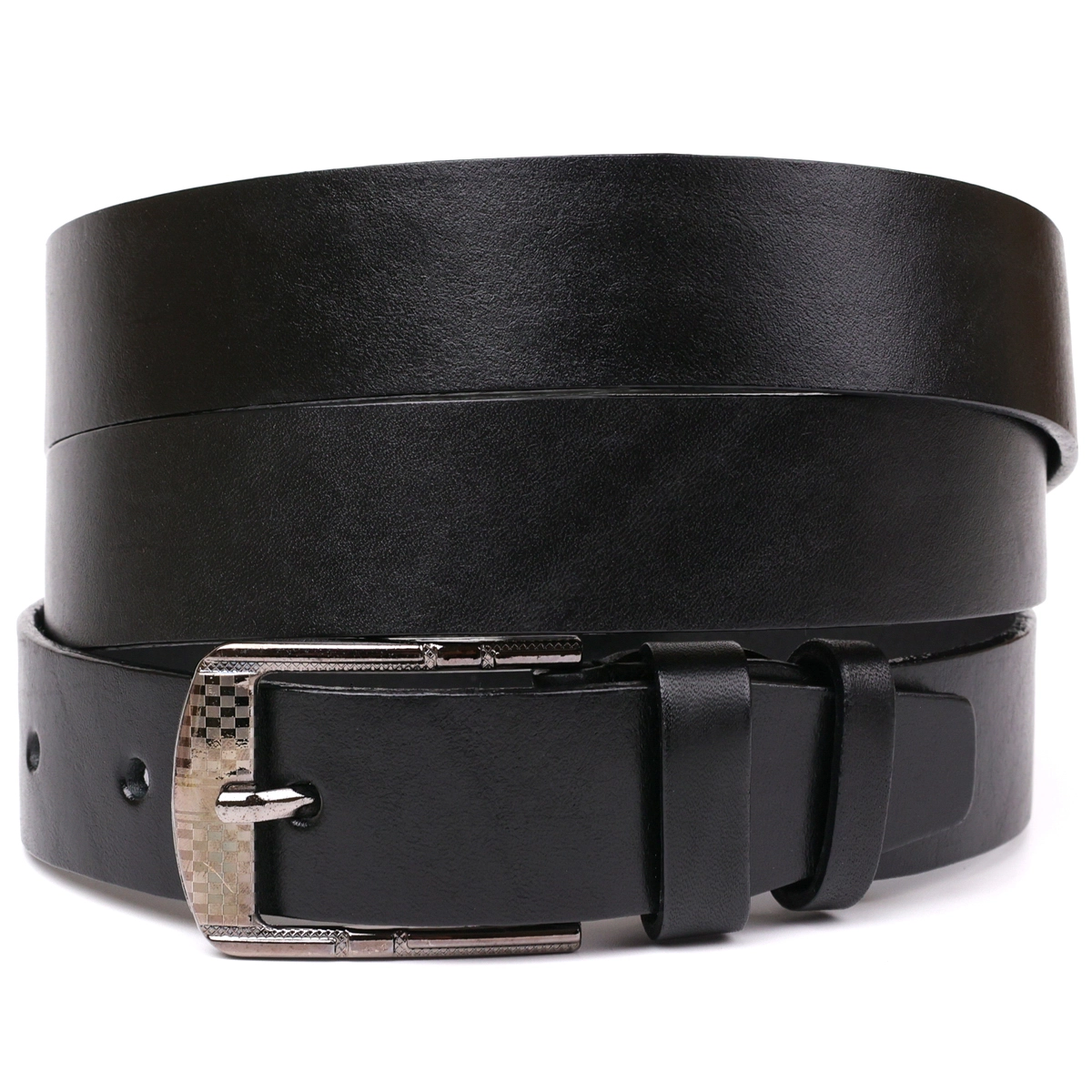 Гладкий кожаный пояс черного цвета подойдет под классические брюки