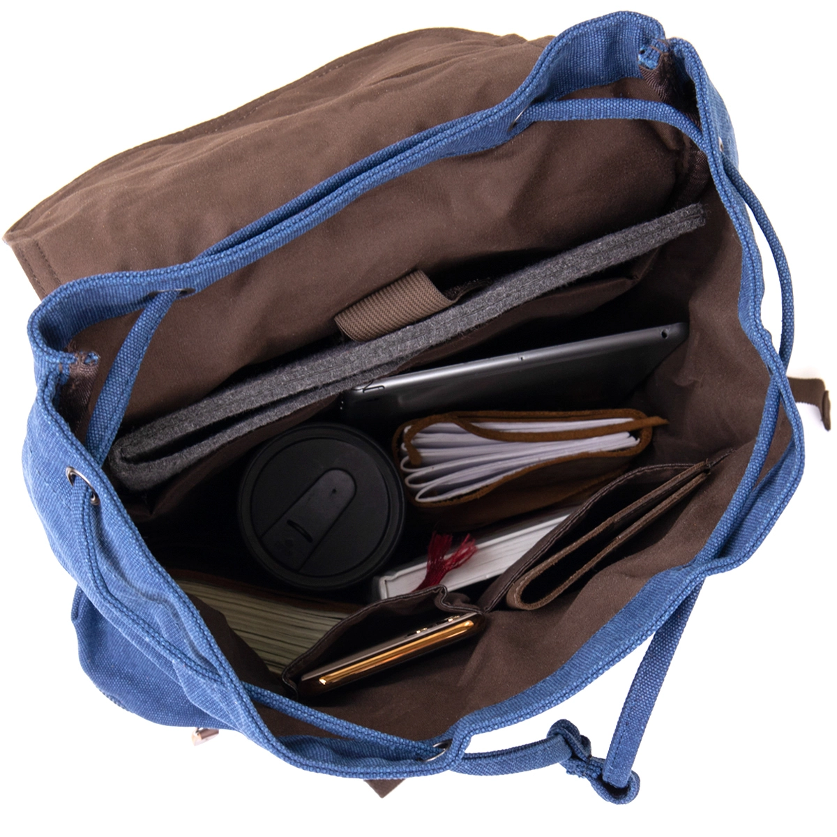 подкладкой коричневого цвета. Рюкзак также имеет утягивающие