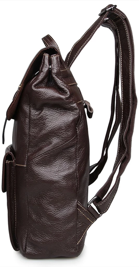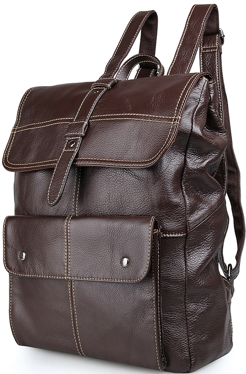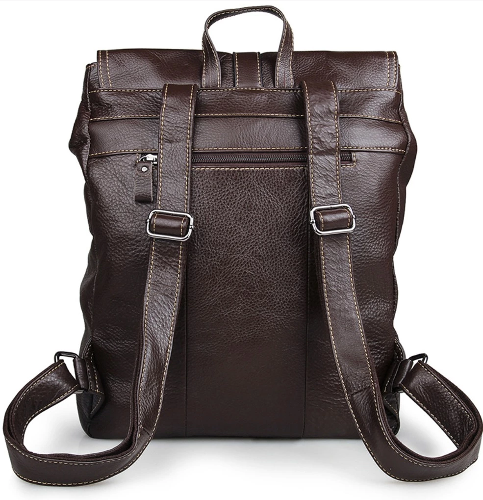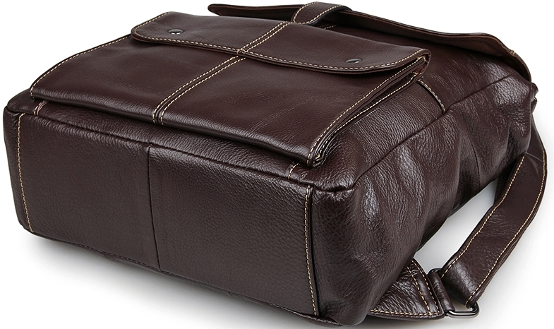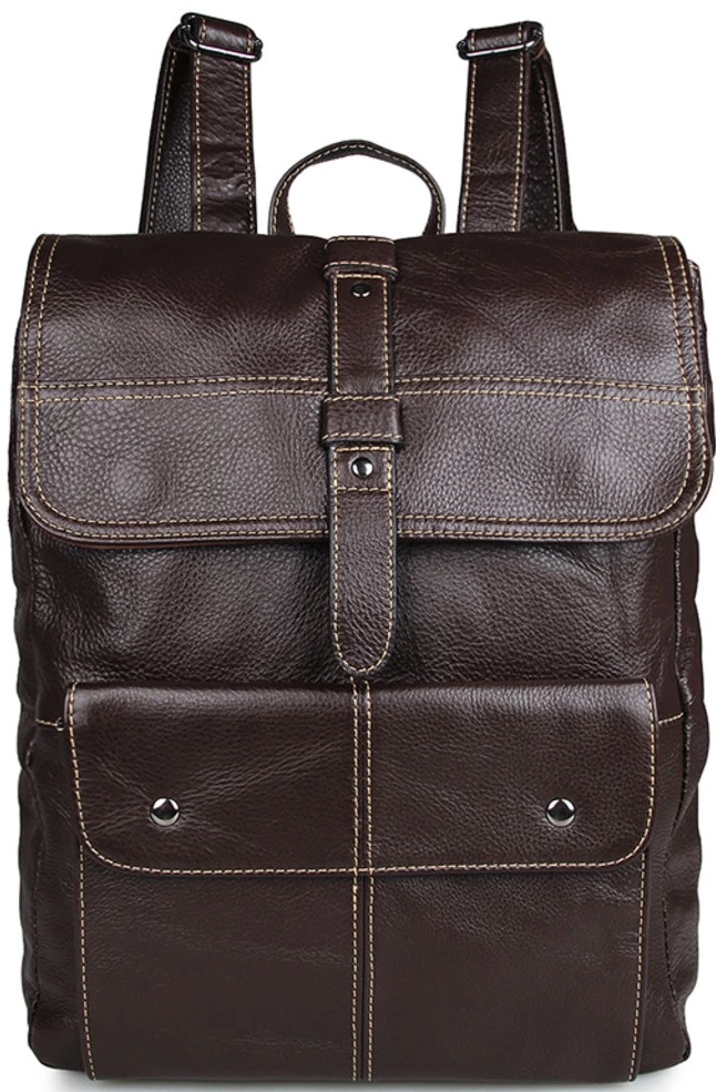 Отличный кожаный рюкзак коричневого цвета. Кожа, из которой выполнено изделие, имеет зернистую фактуру. Она мягкая, приятная на ощупь. Цвет фурнитуры: темное серебро. Рюкзак надежно прошит прочной нитью в светлых тонах, которая придает аксессуару изюминку. На лицевой стороне расположен большой карман на 2-х магнитных кнопках. На задней внешней стороне аксессуара находится отделение на молнии. Рюкзак закрывается клапаном на 2-х скрытых магнитах и молнией. Подкладка данного аксессуара выполнена из прочного текстильного материала коричневого цвета.