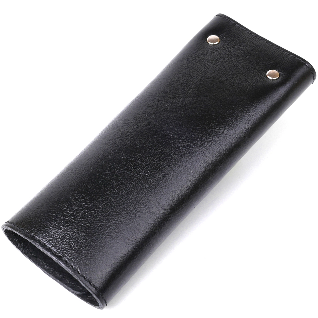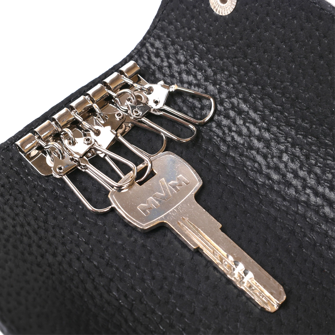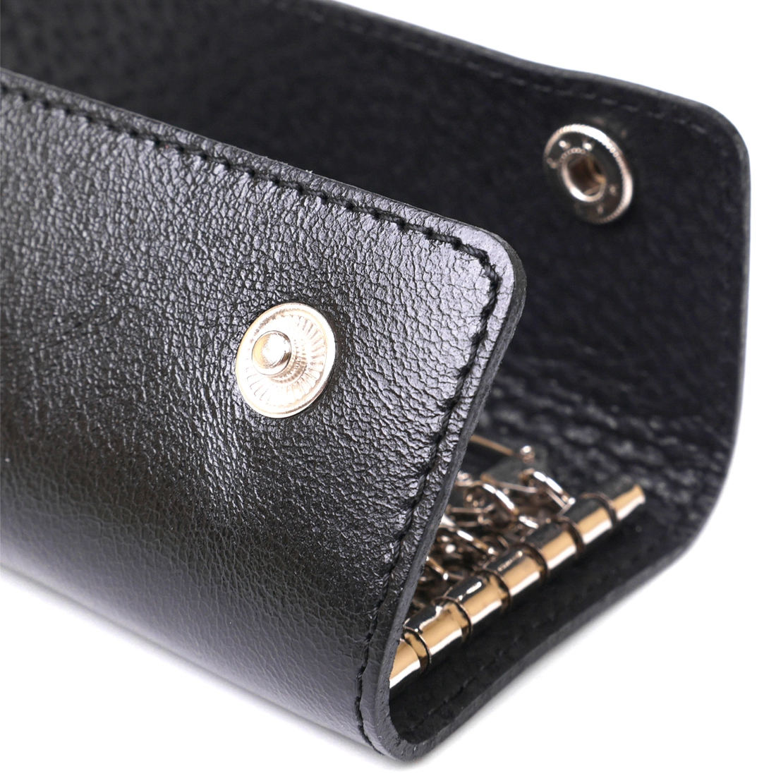 Добротная ключница из натуральной кожи от украинского производителя с отличными характеристиками износоустойчивости. Цвет изделия – универсальный черный с легким блеском, фактура – гладкая. Внутри расположены шесть небольших карабинов для ключей. Закрывается аксессуар на две кнопки в цвете под серебро.