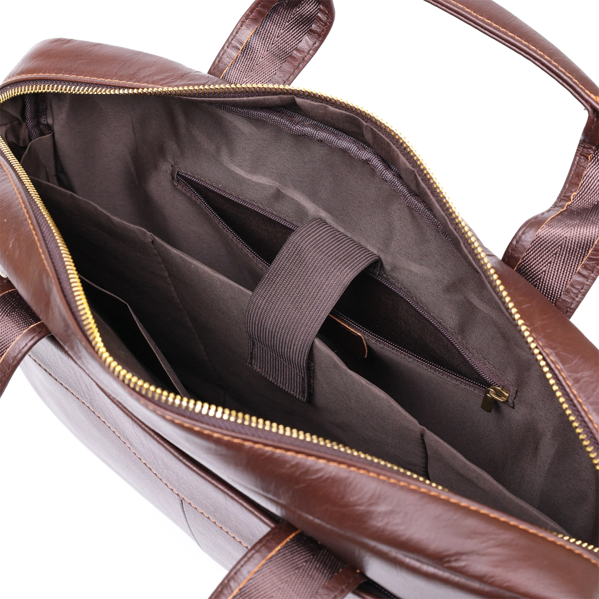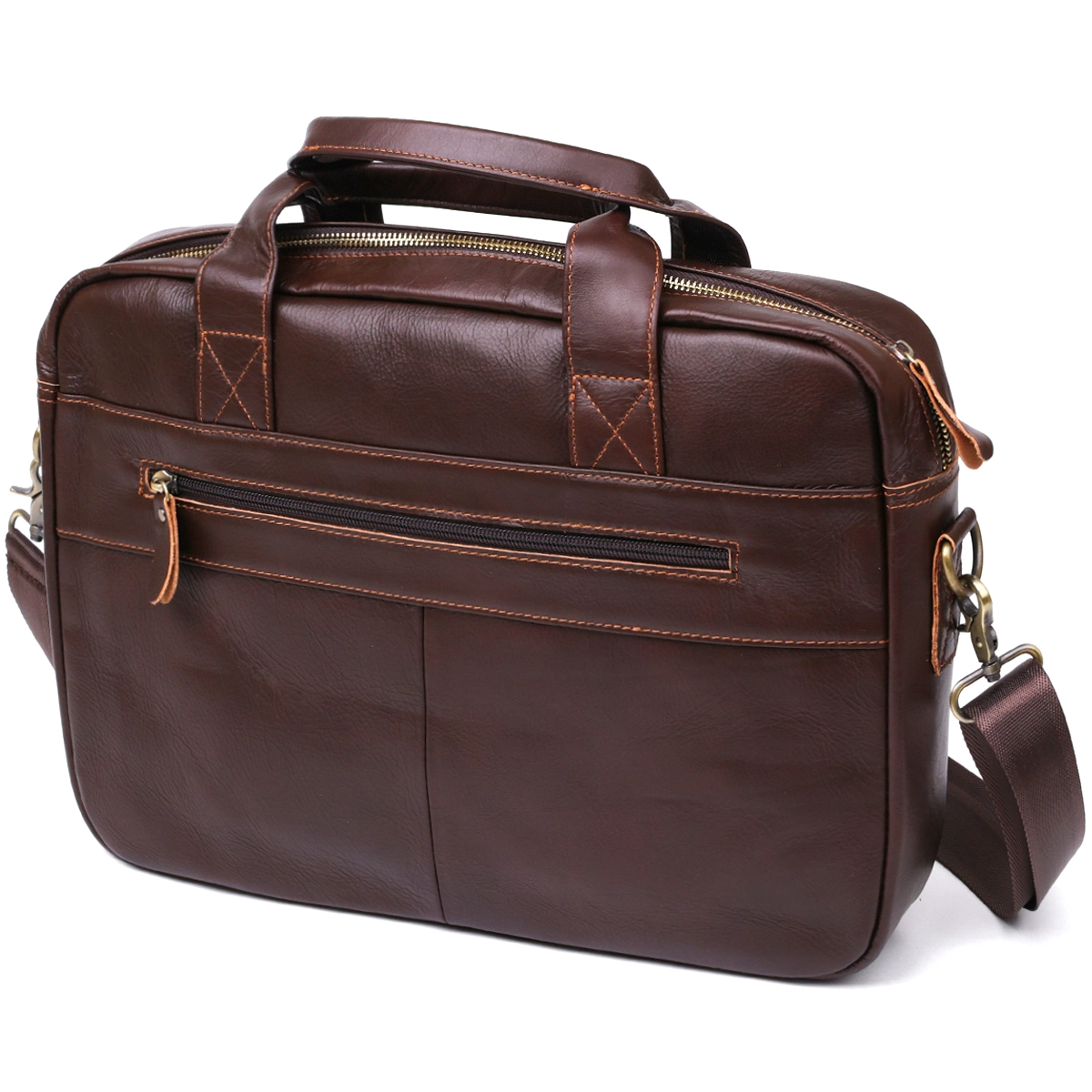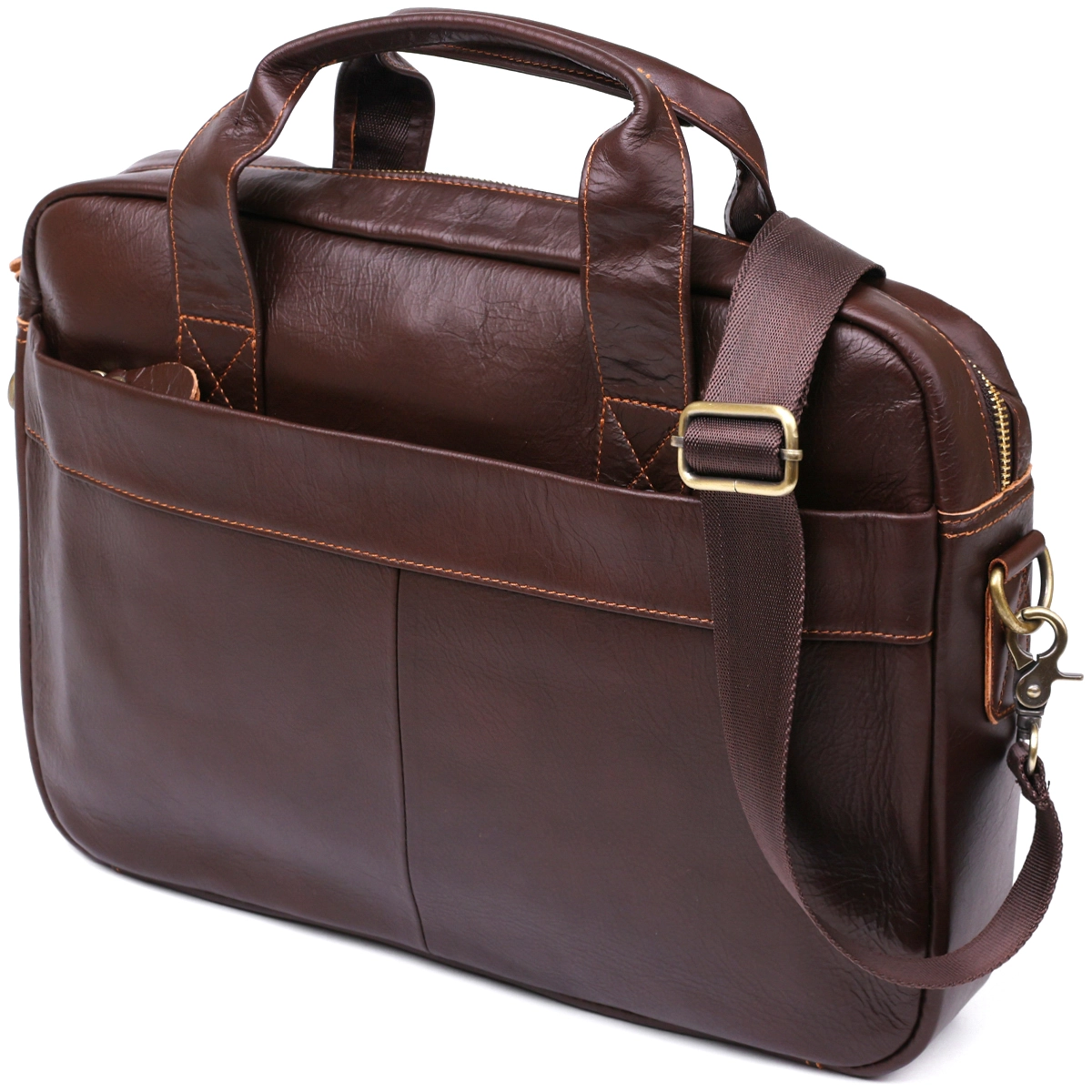 Превосходная вместительная мужская сумка для ноутбука в красивом насыщенном коричневом цвете. Материал изготовления – натуральная высококачественная кожа с отменными характеристиками. Изделие имеет гладкую и приятную на ощупь фактуру. Внутри есть специальное отделение для ноутбука на липучке, карманы для телефона и маленький потайной карман на молнии. На внешней стороне также присутствуют вместительные карманы.